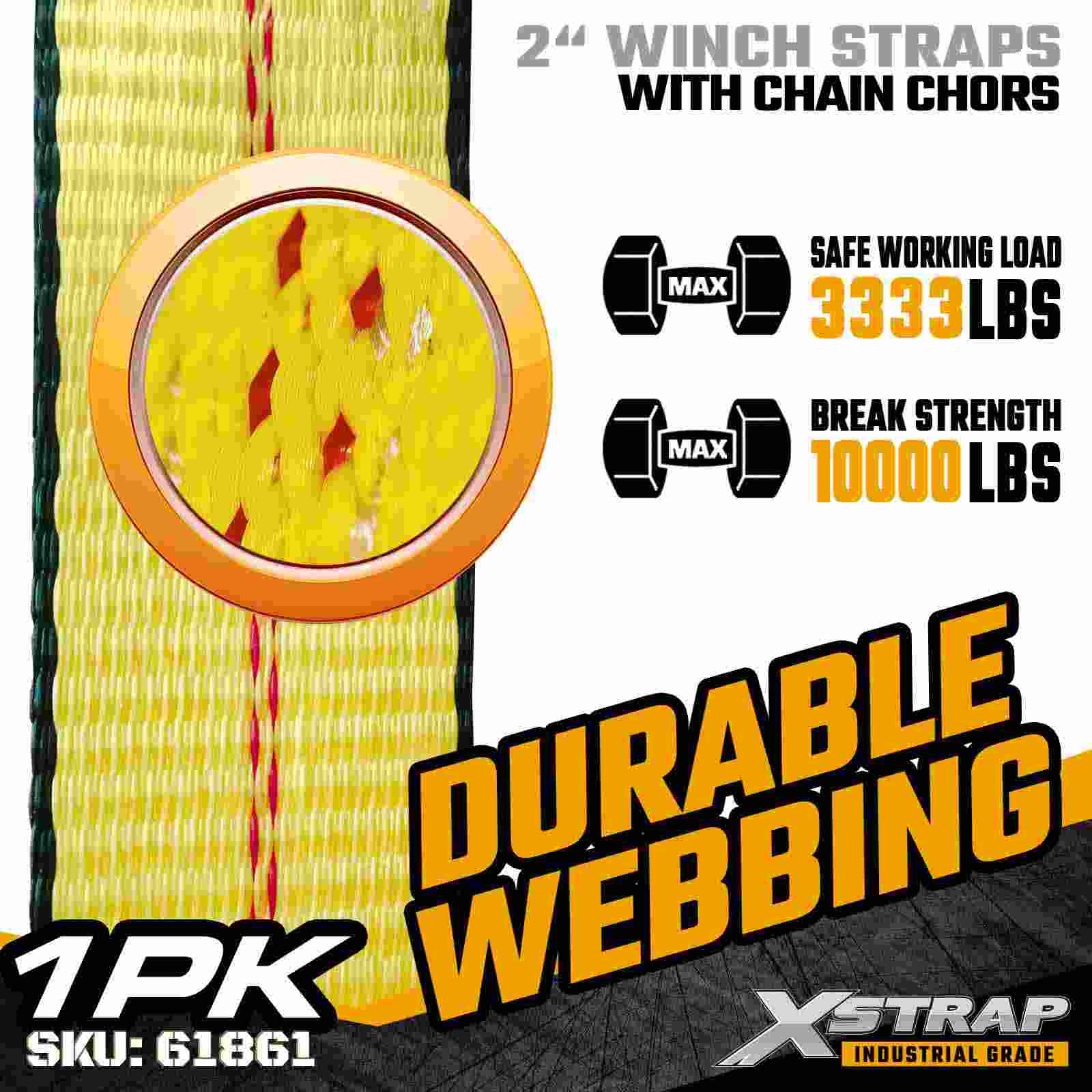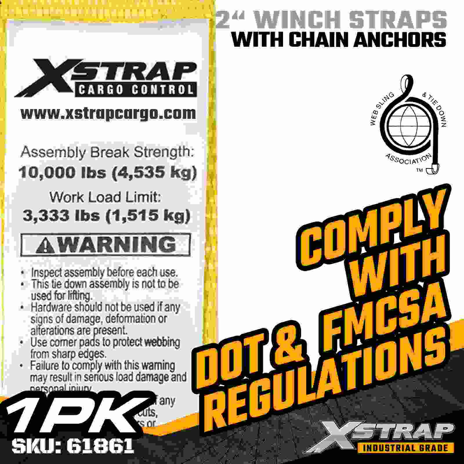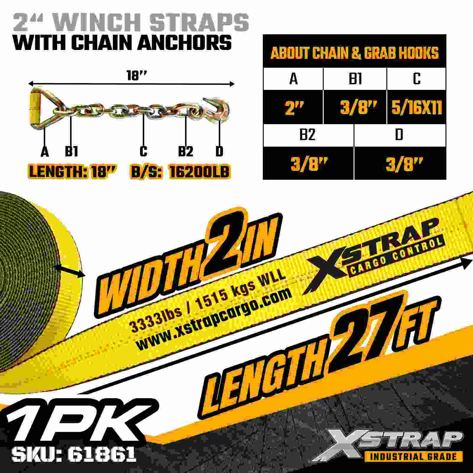 Xstrap 61861 2 インチ × 27 フィートの標準ウインチ ストラップは、信頼性の高いフラットベッド貨物固定用に構築されており、耐久性のあるチェーン アンカーと高強度ポリエステル ウェビングを備えています。3,333 ポンドの使用荷重制限と 10,000 ポンドの破断強度を備えており、毎日の貨物輸送、パレット荷重、木材、パイプ、および一般的な物流用途に信頼できるパフォーマンスを提供します。