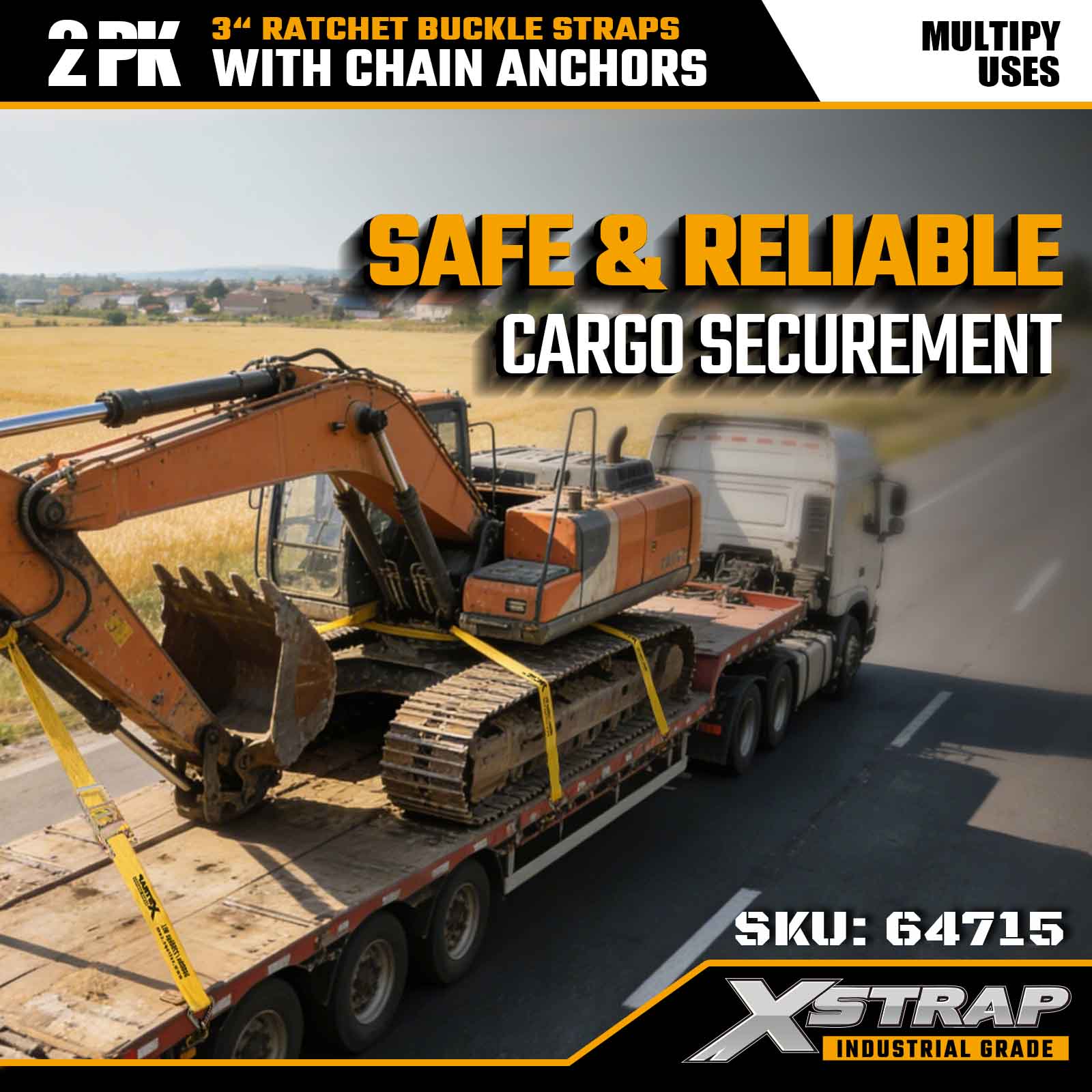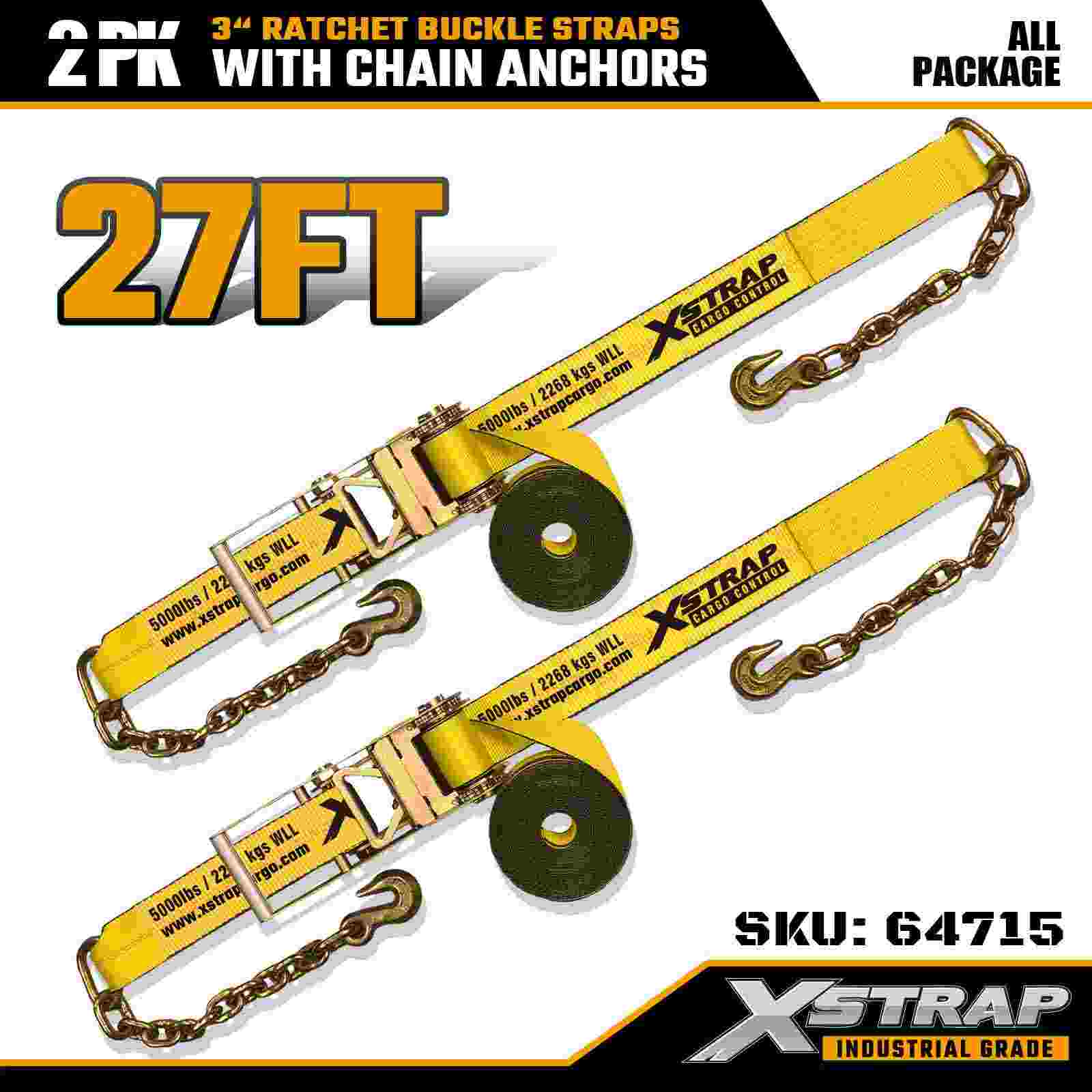 Xstrap 64715 3 インチ × 27 フィート ラチェット バックル ストラップ (2 パック) – 要求の厳しい貨物環境向けに設計された頑丈なチェーン アンカーを装備しています。5,000 ポンドの使用荷重制限と 15,000 ポンドの破断強度を備えたこれらのストラップは、フラットベッド、機械輸送、産業用運搬に安全で安定したプロ仕様の固定性能を提供します。