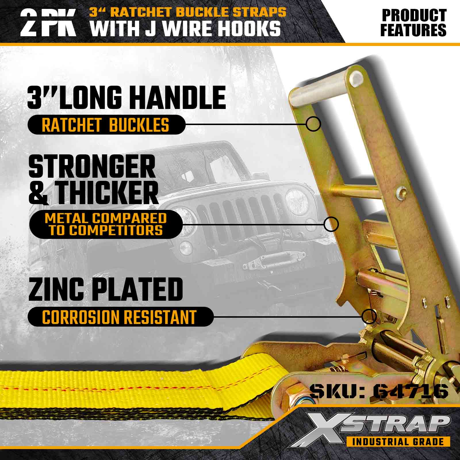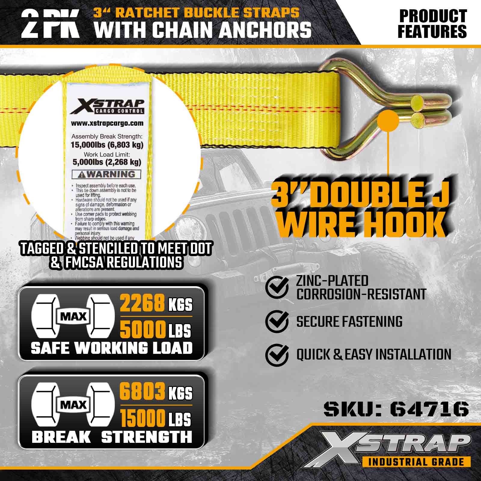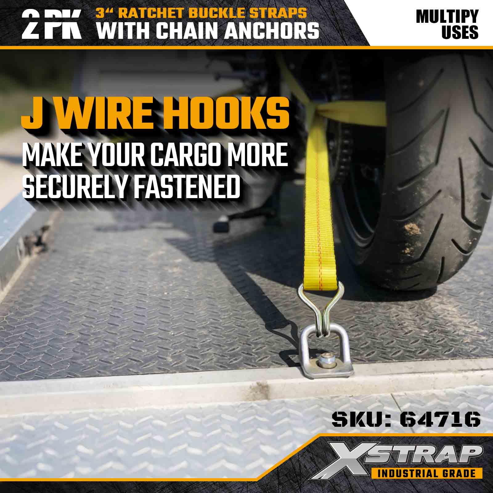 Xstrap 64716 3 インチ × 27 フィート ラチェット バックル ストラップ (2 パック) は、プロの貨物固定用に設計されており、高強度ワイヤー フックと耐久性のあるラチェット機構を備えています。5,000 ポンドの使用荷重制限と 15,000 ポンドの破断強度を備えたこれらのストラップは、フラットベッド、機器の輸送、産業用運搬作業に信頼できるパフォーマンスを提供します。