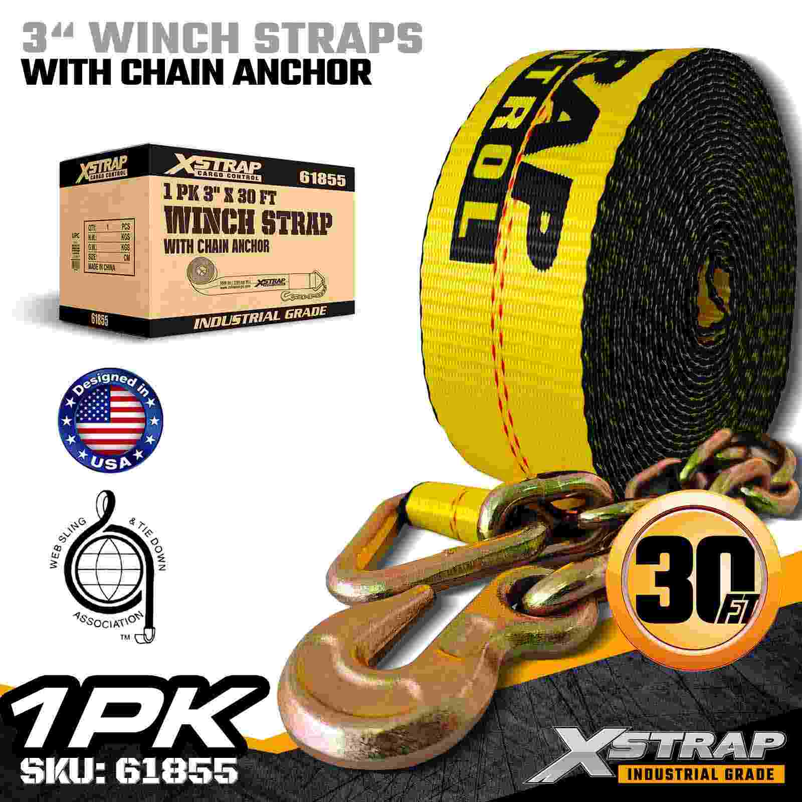 3 インチ × 30 フィートの標準ウインチ ストラップ、チェーン アンカー付き