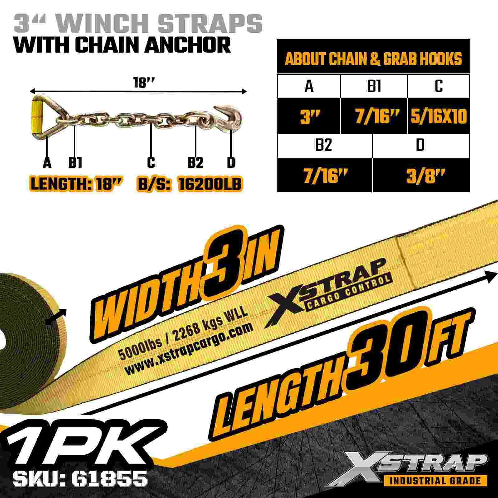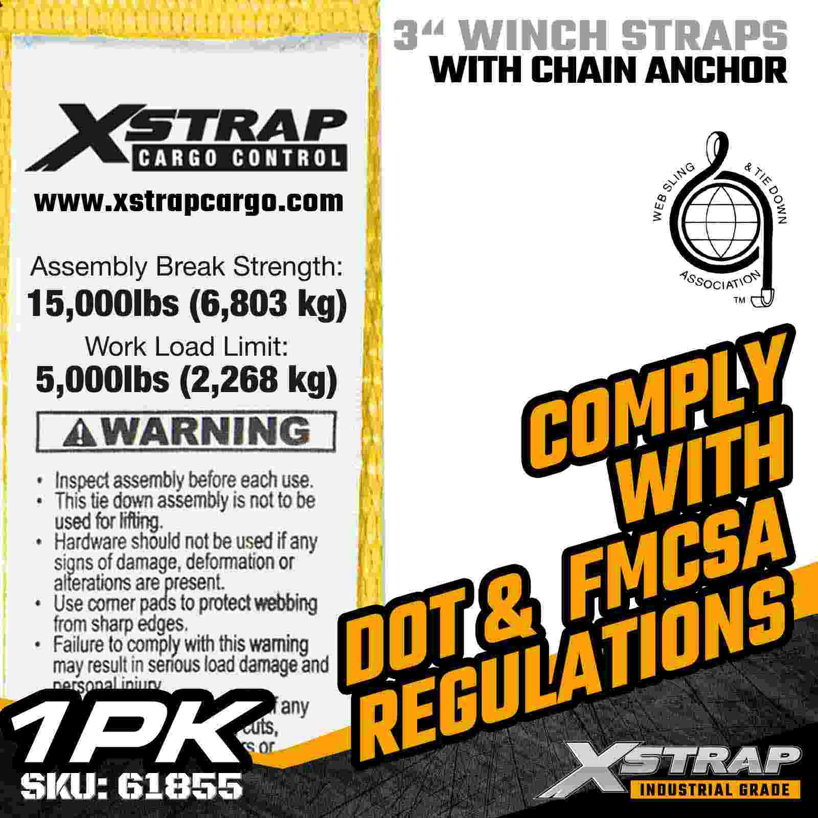 Xstrap 61855 3 インチ × 30 フィートの標準ウインチ ストラップは、フラットベッド トレーラーおよび特大貨物用に設計された頑丈な工業用貨物固定ストラップです。鍛造チェーン アンカーと幅広の 3 インチのポリエステル ウェビングを備えたこの 3 インチのウインチ ストラップは、5,000 ポンドの作業荷重制限と 15,000 ポンドの破断強度を実現します。30 フィートの長さなので、固定に最適です。さらなるリーチと安定性が必要な、幅広、高さ、または不規則な形状の荷物。