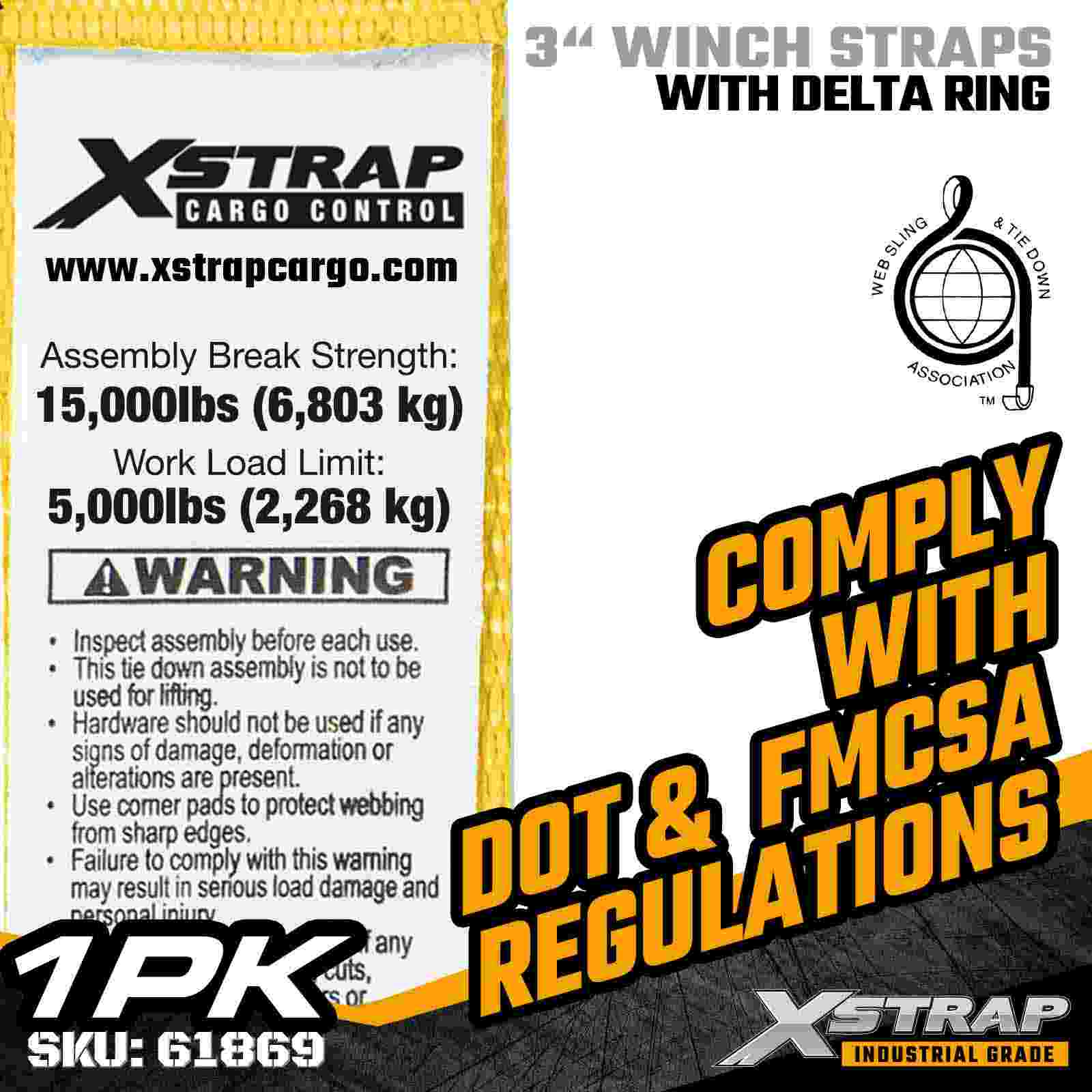 Xstrap 61869 3 インチ × 30 フィートの標準ウインチ ストラップは、フラットベッド トレーラーや大容量輸送用に設計された頑丈な貨物固定ストラップです。強化されたデルタ リングと幅広の 3 インチのポリエステル ウェビングを備えたこの 3 インチのウインチ ストラップは、5,000 ポンドの作業荷重制限と 15,000 ポンドの破断強度を実現します。要求の厳しい輸送作業中の木材、鉄鋼、機械、産業用貨物。