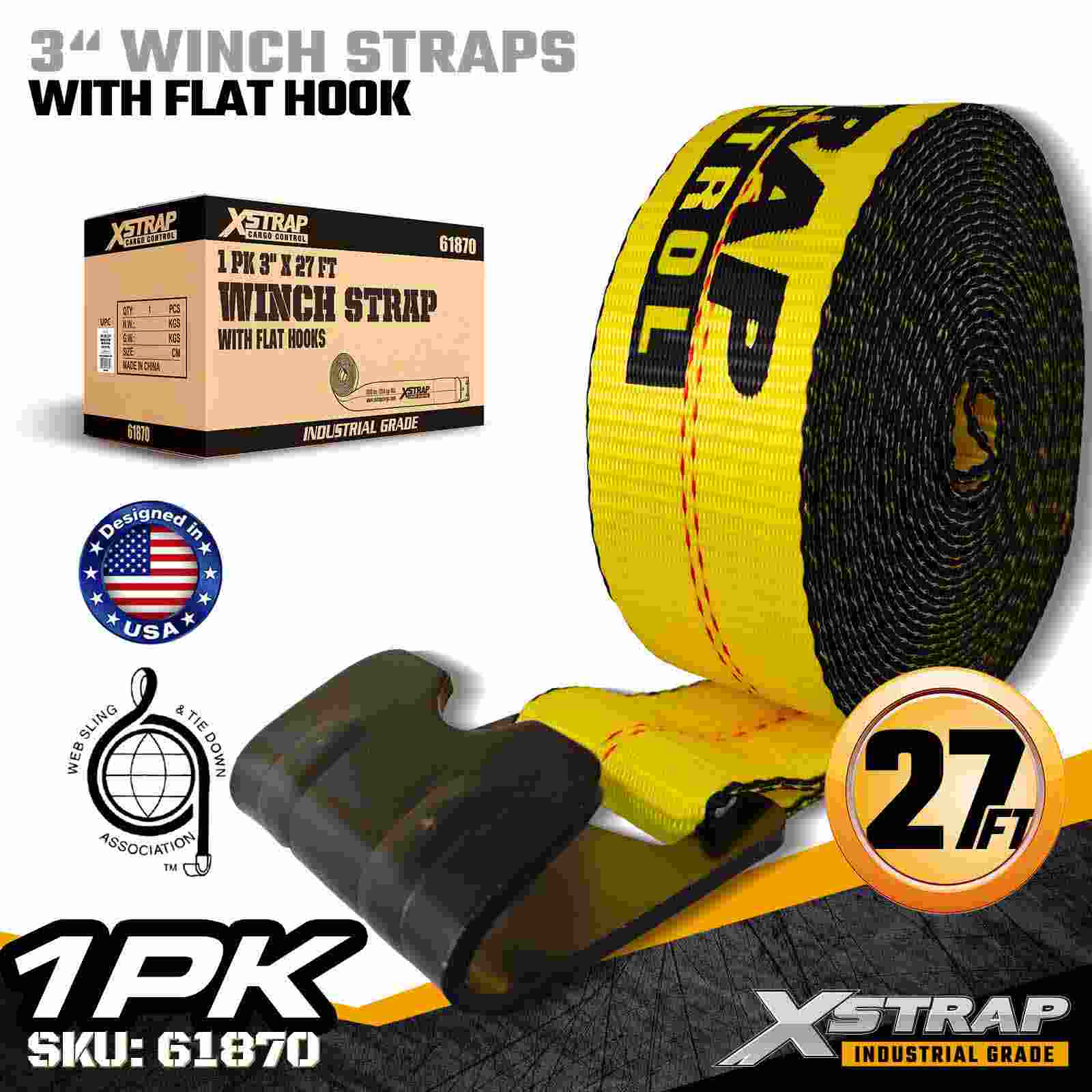 Xstrap 61870 3 インチ × 27 フィートの標準ウインチ ストラップは、フラットベッド トレーラーや大容量輸送用に設計された頑丈な貨物固定ストラップです。強化されたフラット フックと幅広の 3 インチのポリエステル ウェビングを備えたこの 3 インチのウインチ ストラップは、5,000 ポンドの作業荷重制限と 15,000 ポンドの破断強度を実現します。木材、鋼鉄、機械、機械などの固定に最適です。要求の厳しい輸送作業中の産業用貨物。