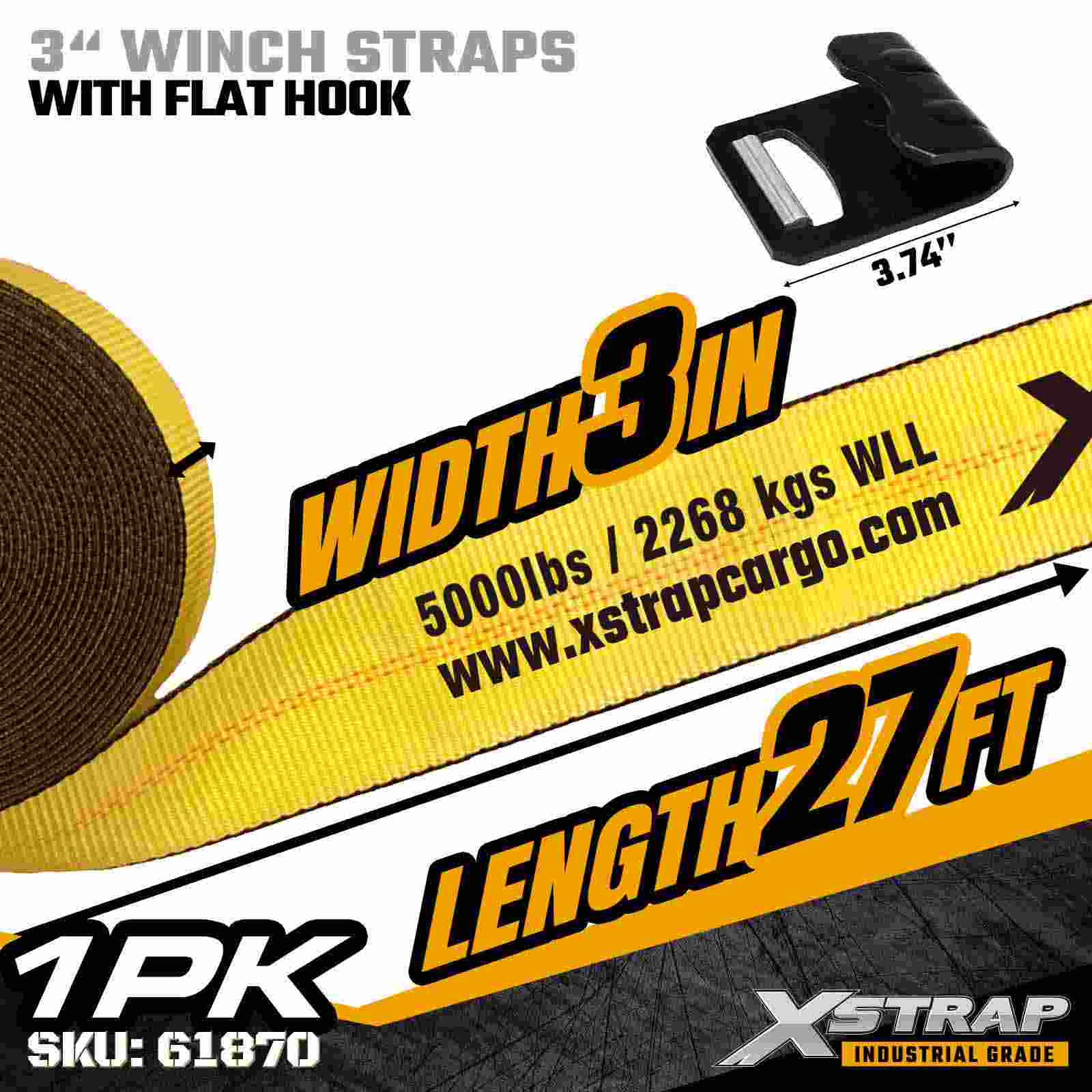 3 インチ × 27 フィートの標準ウインチ ストラップ、フラット フック付き