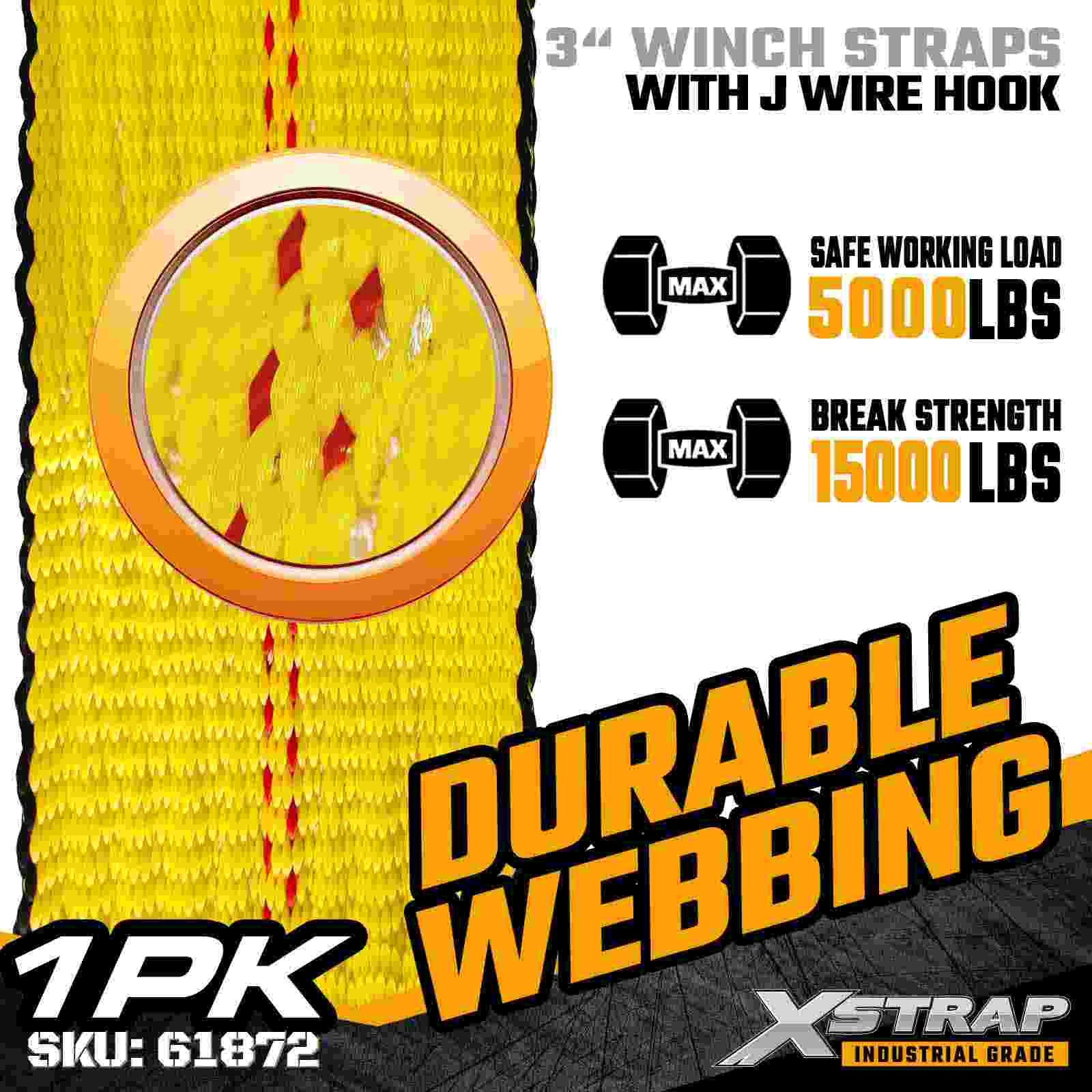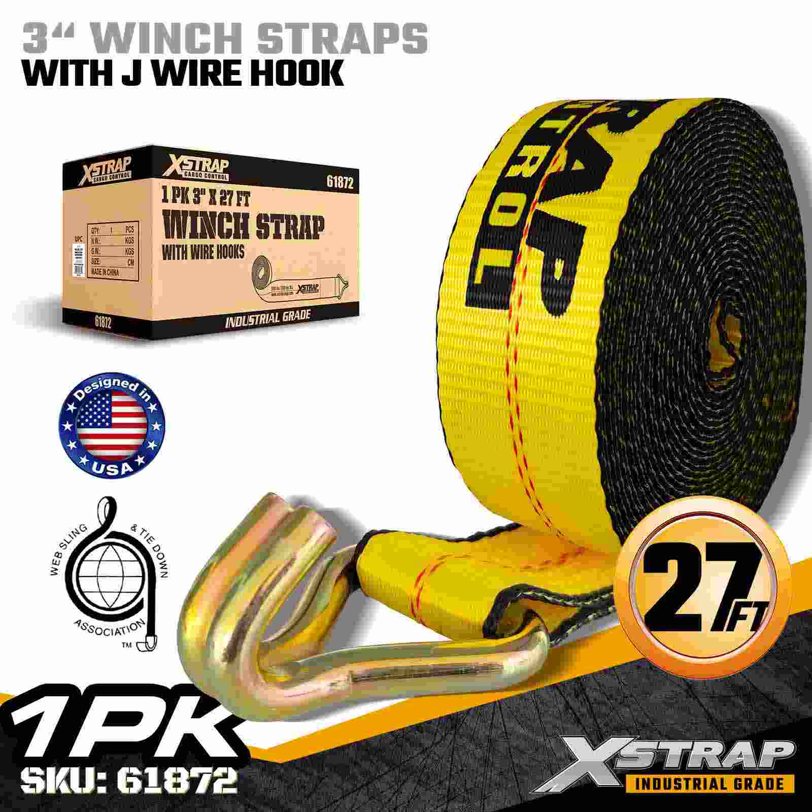 3 インチ × 27 フィートの標準ウィンチ ストラップ、ワイヤー フック付き