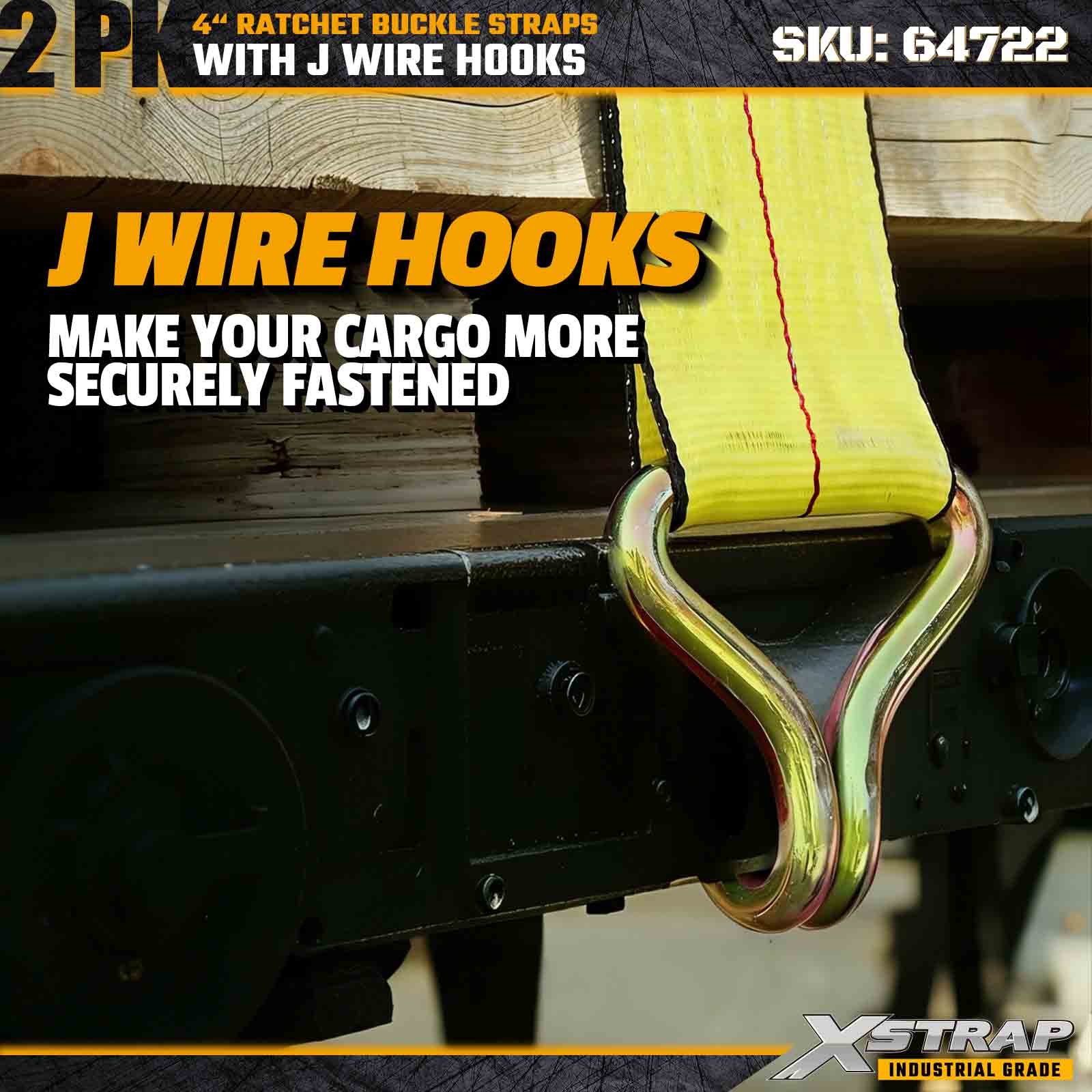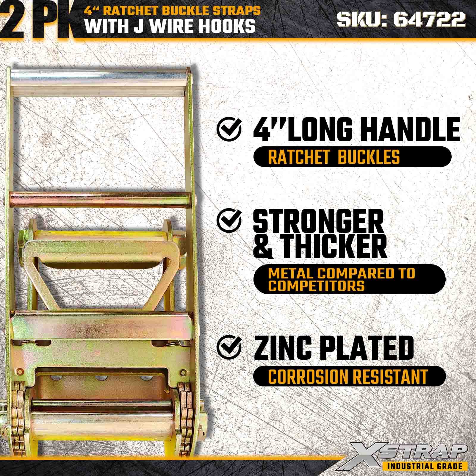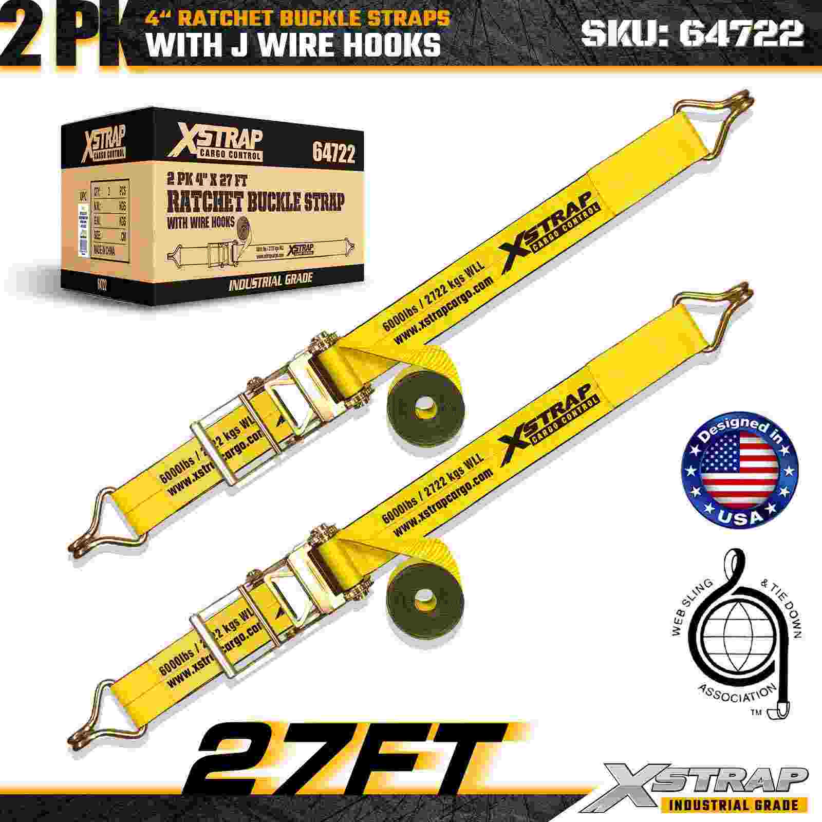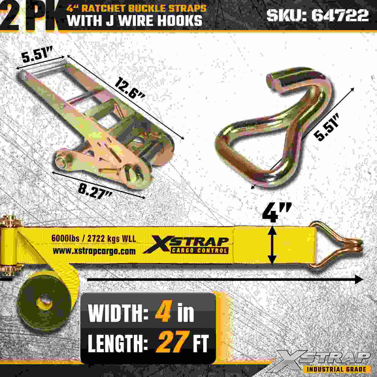 Xstrap 64722 4 インチ × 27 フィート ラチェット バックル ストラップ (2 パック) は、強化されたワイヤー フックと耐久性のあるラチェット機構を備え、頑丈な貨物固定用に設計されています。6,000 ポンドの使用荷重制限と 18,000 ポンドの破断強度を備えたこれらのストラップは、平台運搬、機械輸送、木材、鋼鉄荷物、産業用貨物の用途に最適です。