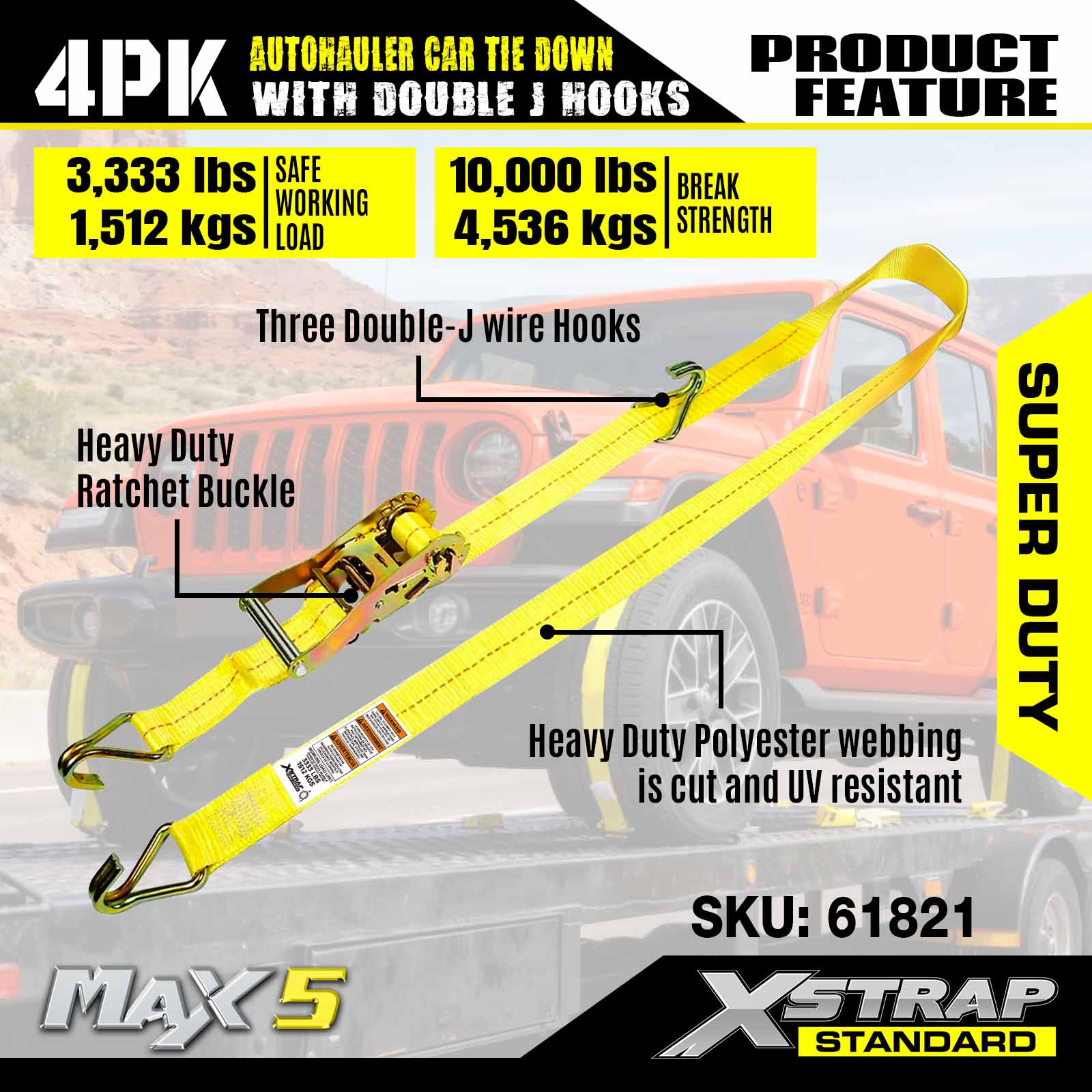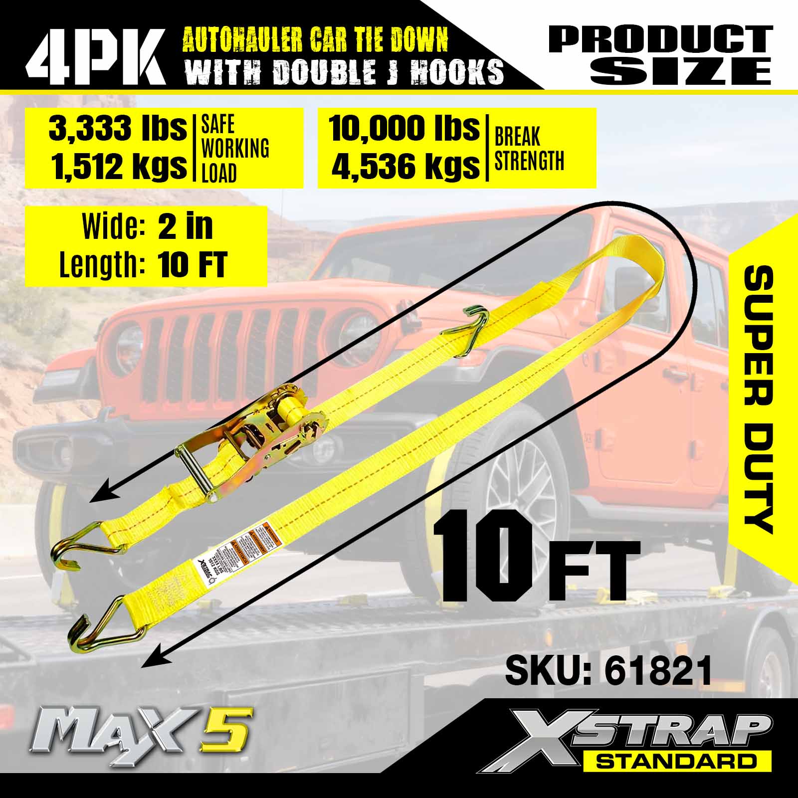 - 超高耐久性能: 3,333LBS の安全作業荷重と 10,000LBS の破壊強度の定格があり、大型車両や要求の厳しい輸送シナリオに対応できるように作られています。