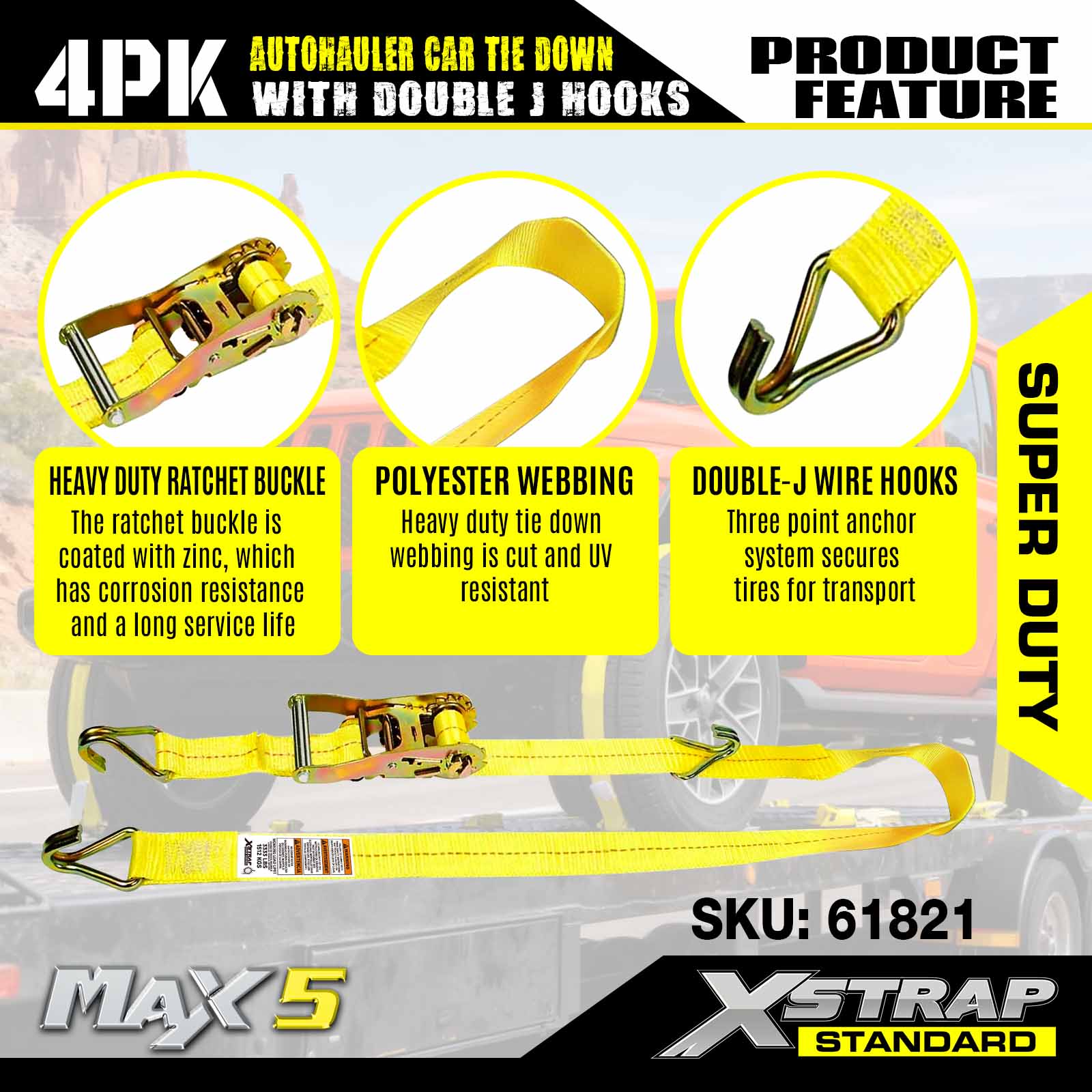 - ダブル J ワイヤー フック 3 点アンカー システム: 3 つのダブル J フックが車両のタイヤの周りに安定した 3 点アンカーを作成し、張力を均等に分散して輸送中のズレや滑りを防ぎます。フックは標準のトレーラーアンカーポイントにしっかりとフィットするように設計されています。