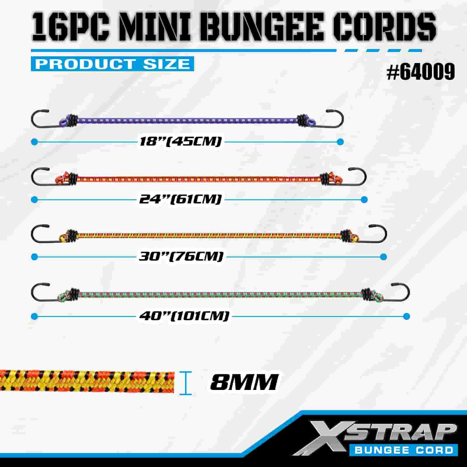 Xstrap 16PK バンジー コード 8mm x 18 インチ/24 インチ/30 インチ/40 インチ、保護チップ付きスチール フックと標準スプリング フック付き、破断強度 44 ~ 55 ポンド。