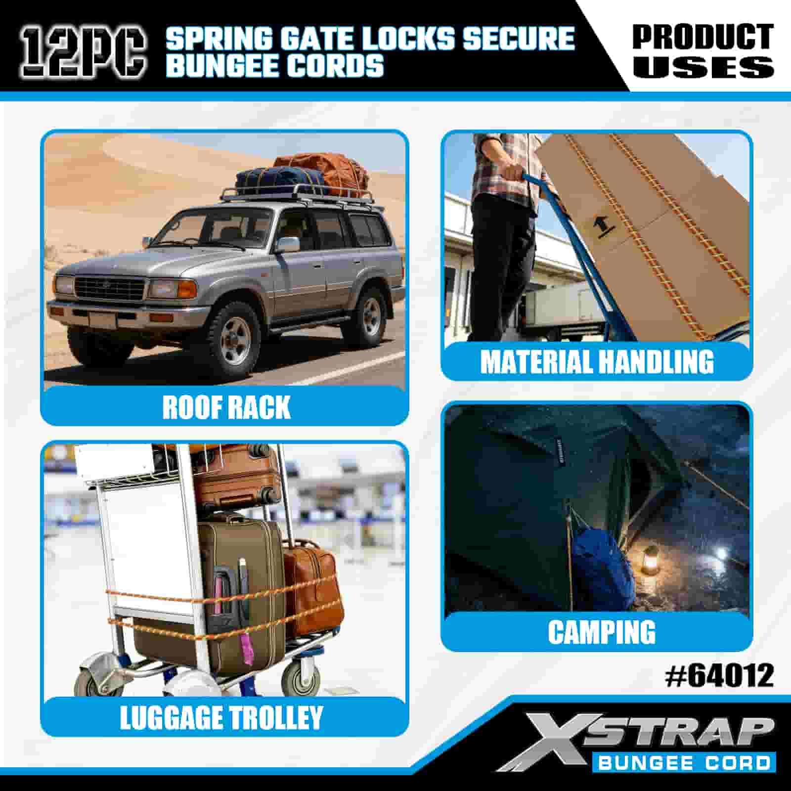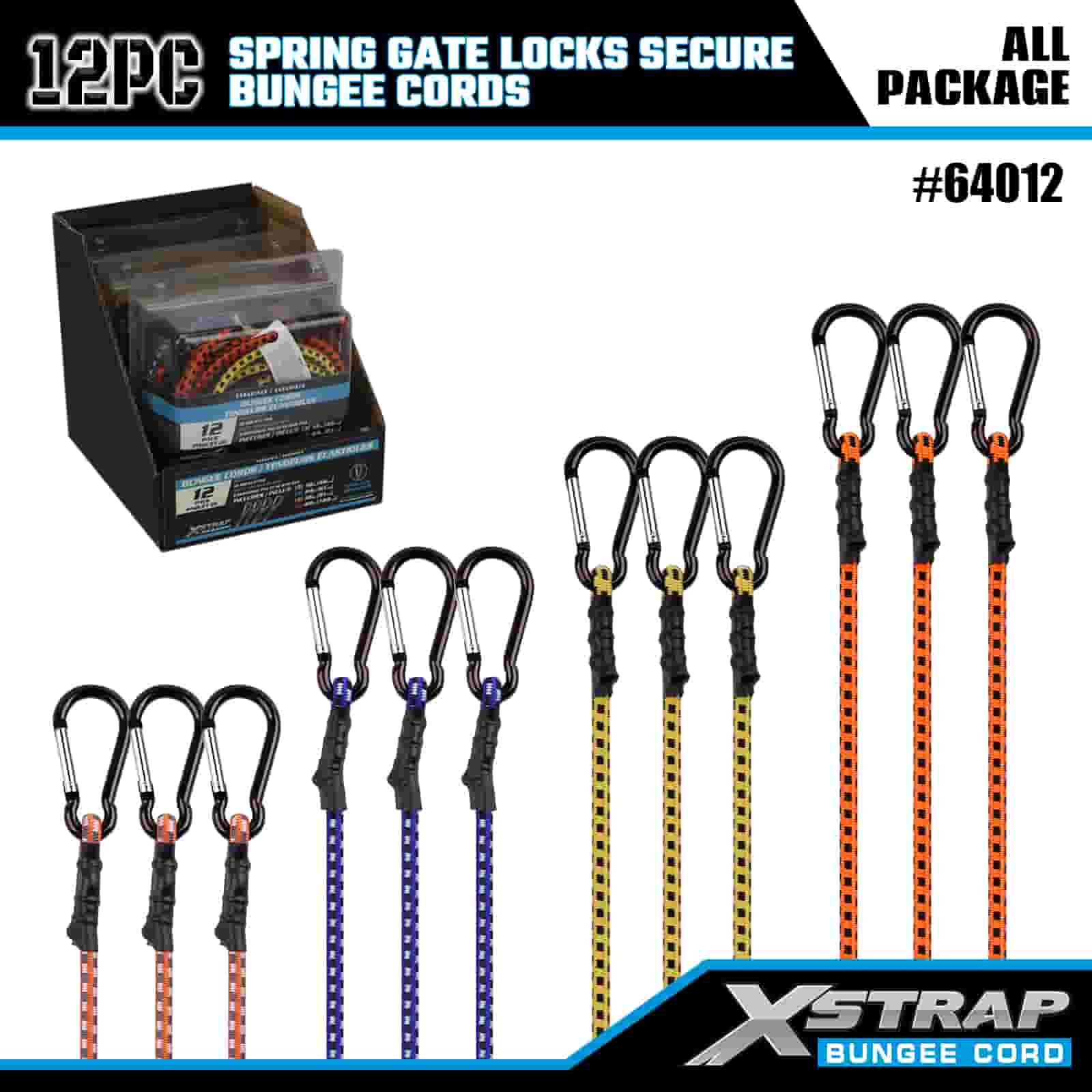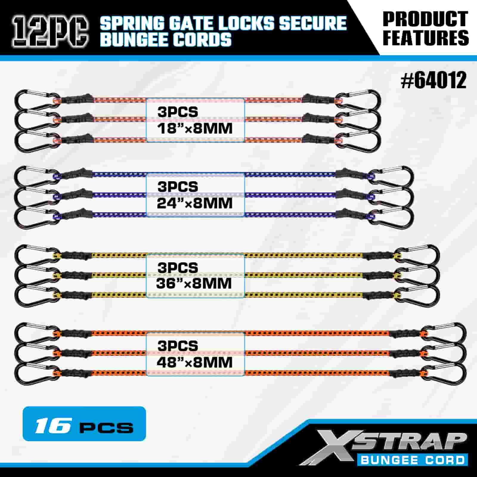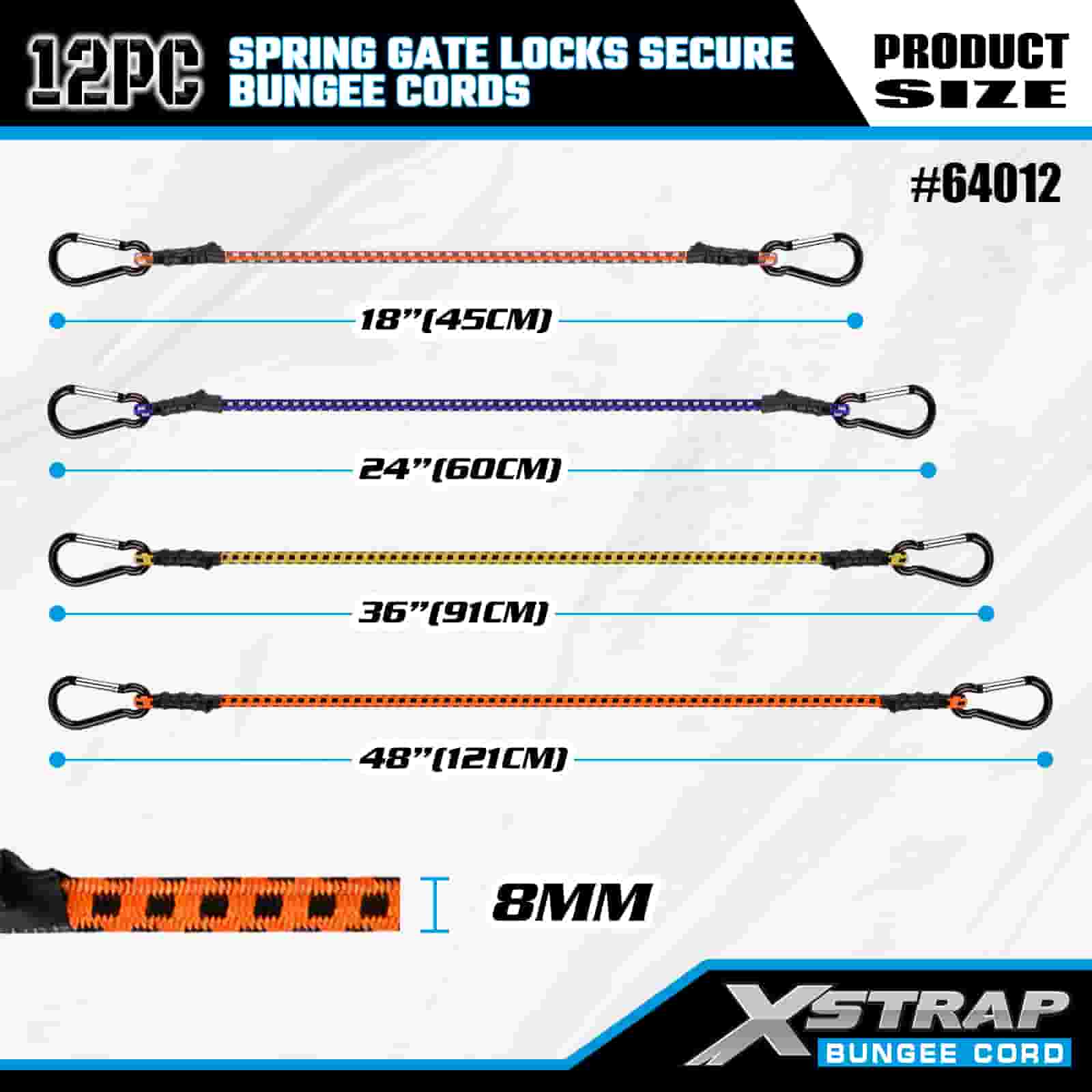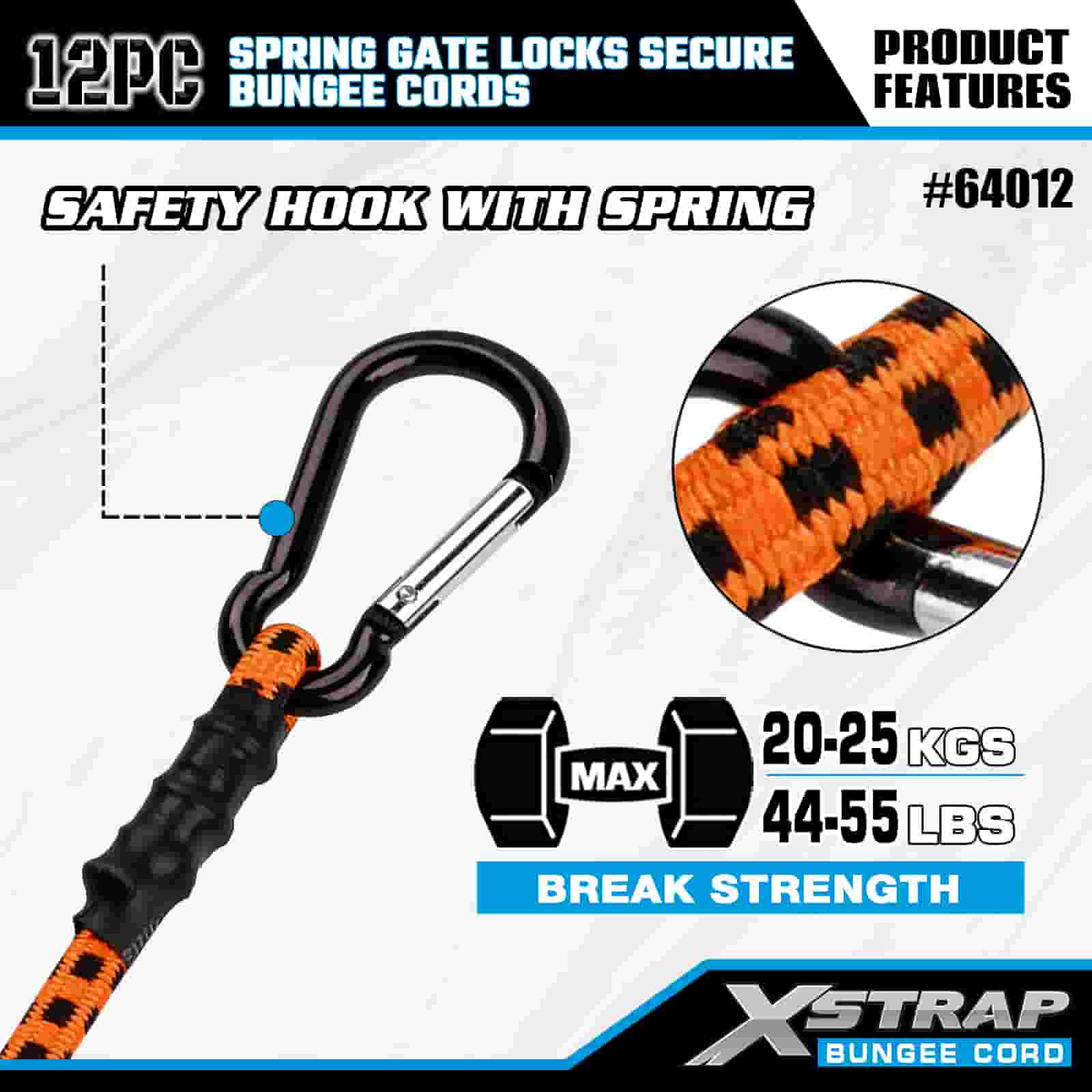 Xstrap 12PK スプリング ゲート ロックは安全なバンジー コード 8 mm x 18 インチ/24 インチ /36 インチ/48 インチ、88 ~ 110 ポンドの破壊強度、スプリング ゲート ロック付きカラビナ フックで安全です。