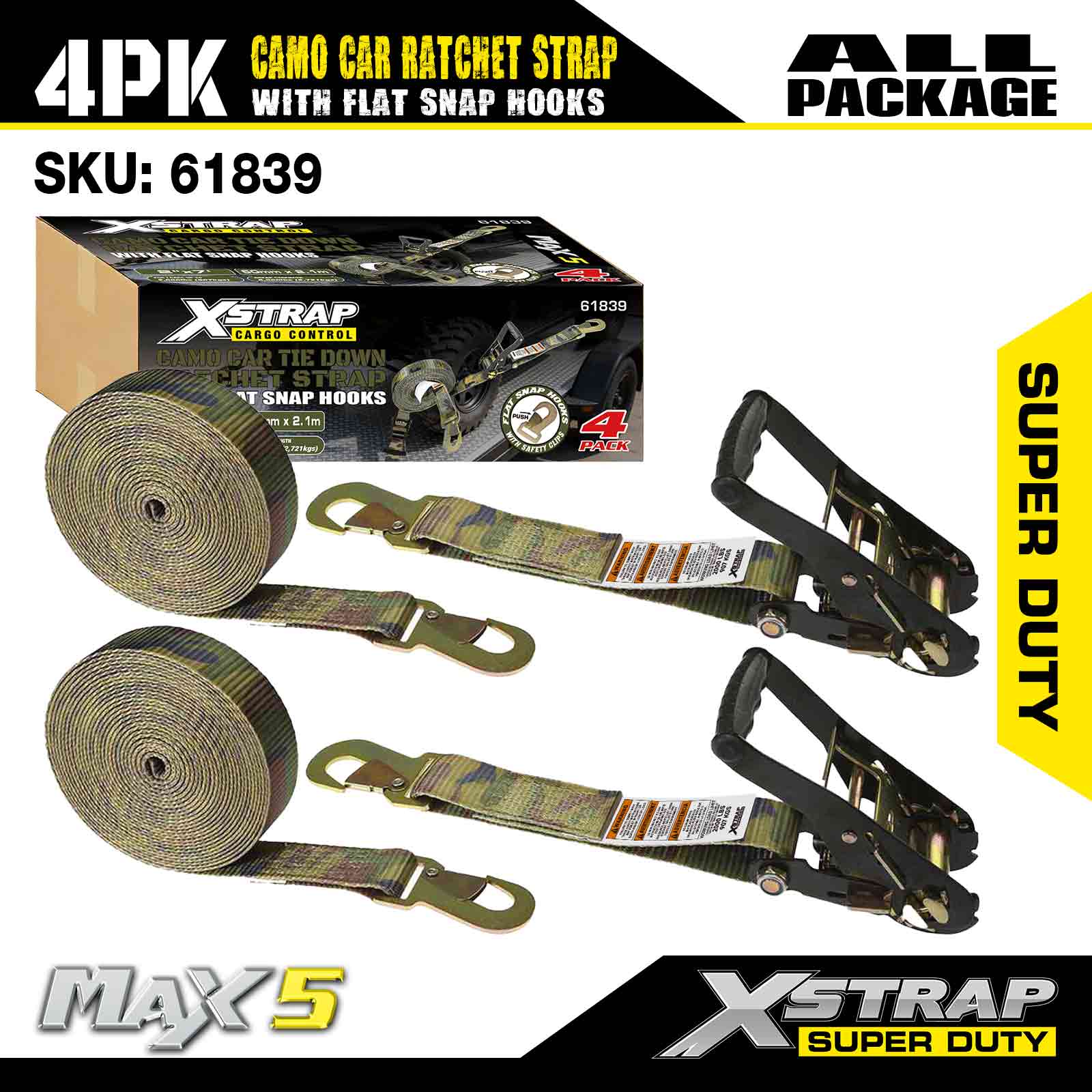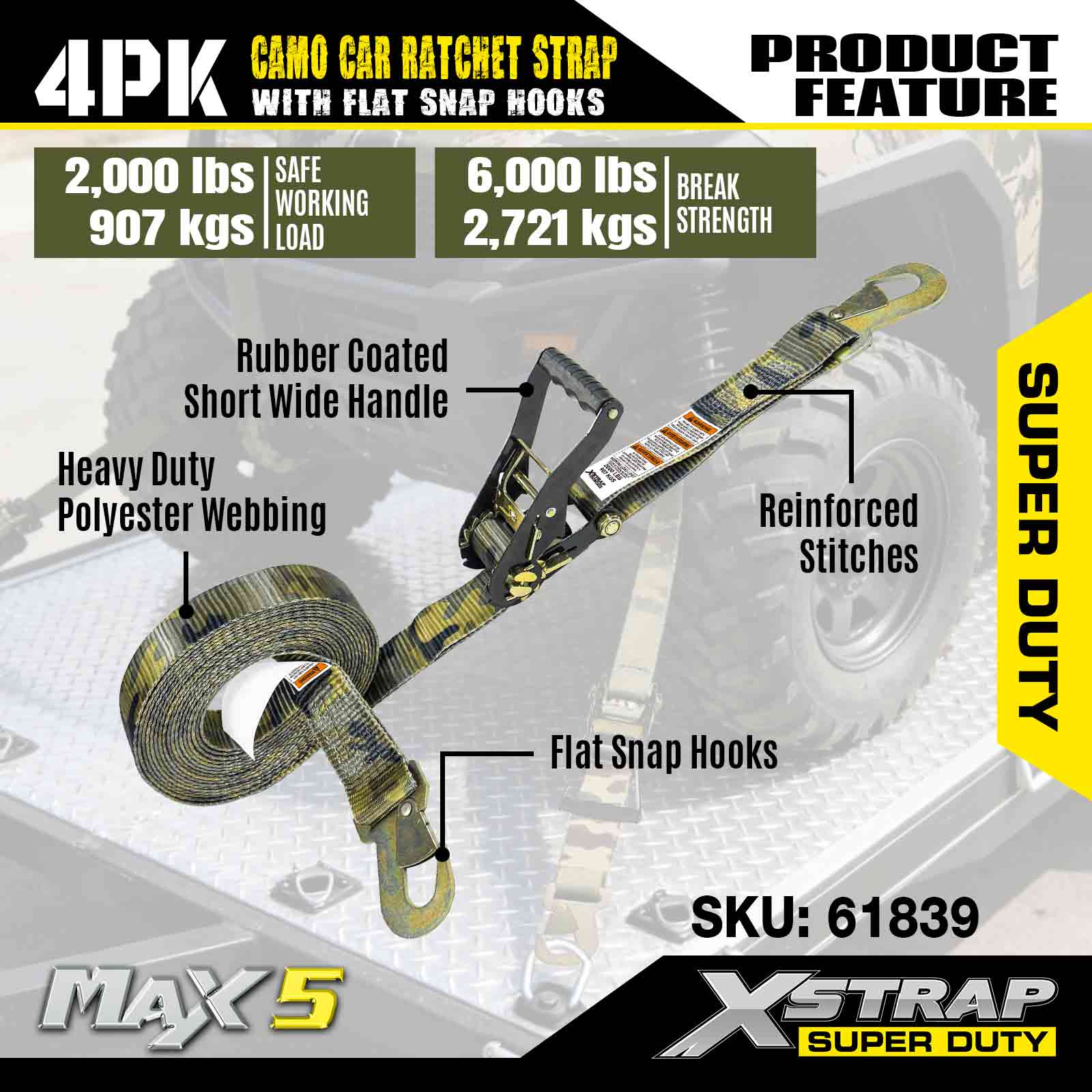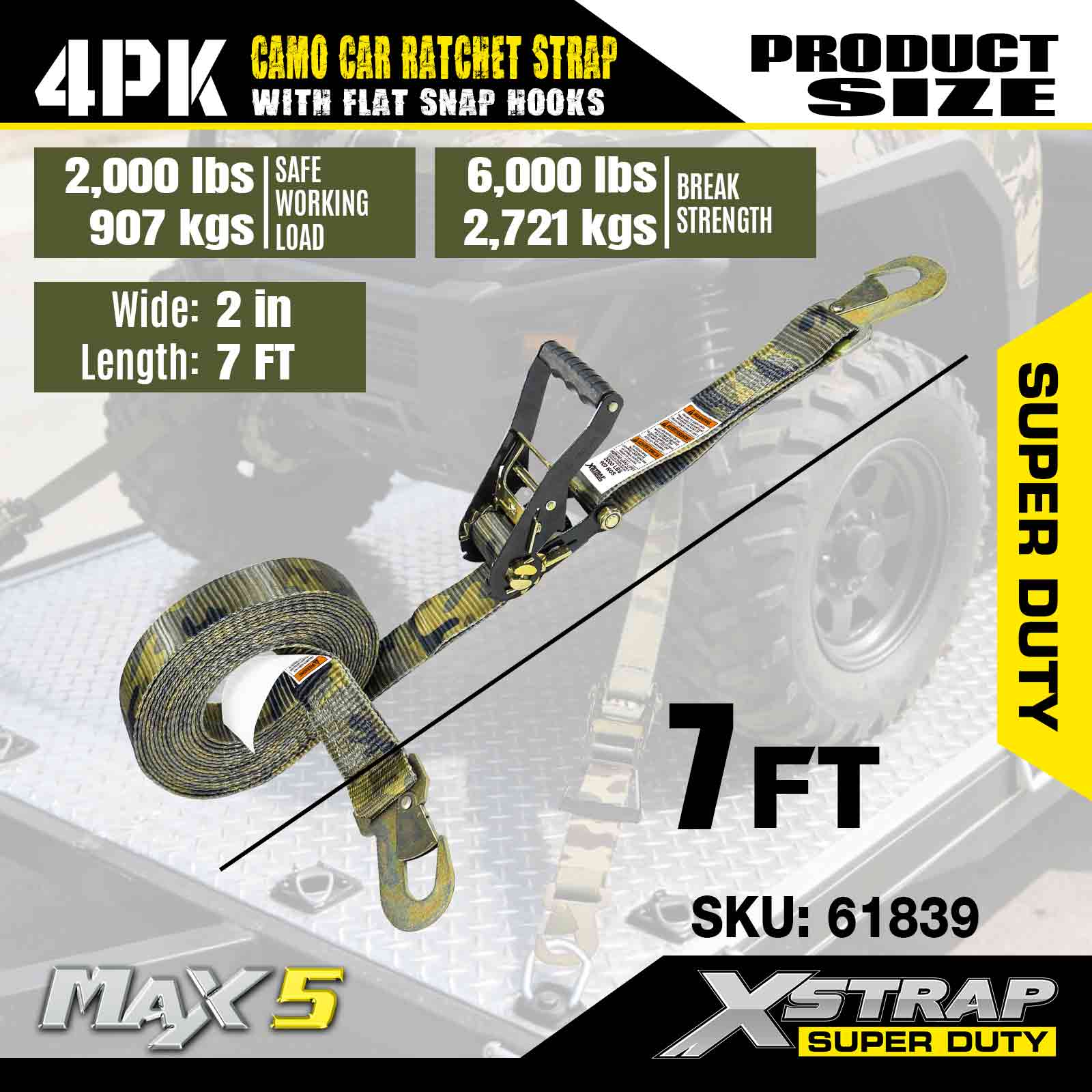 Xstrap カーゴ コントロール オート ラチェット ストラップ フラット スナップ フック付き 2 インチ x 7 フィート (4 パック)、破壊強度 6,000 ポンド、フラット ロック フック付き多用途ラチェット ストラップ、車、オートバイ、その他の車両を固定します。