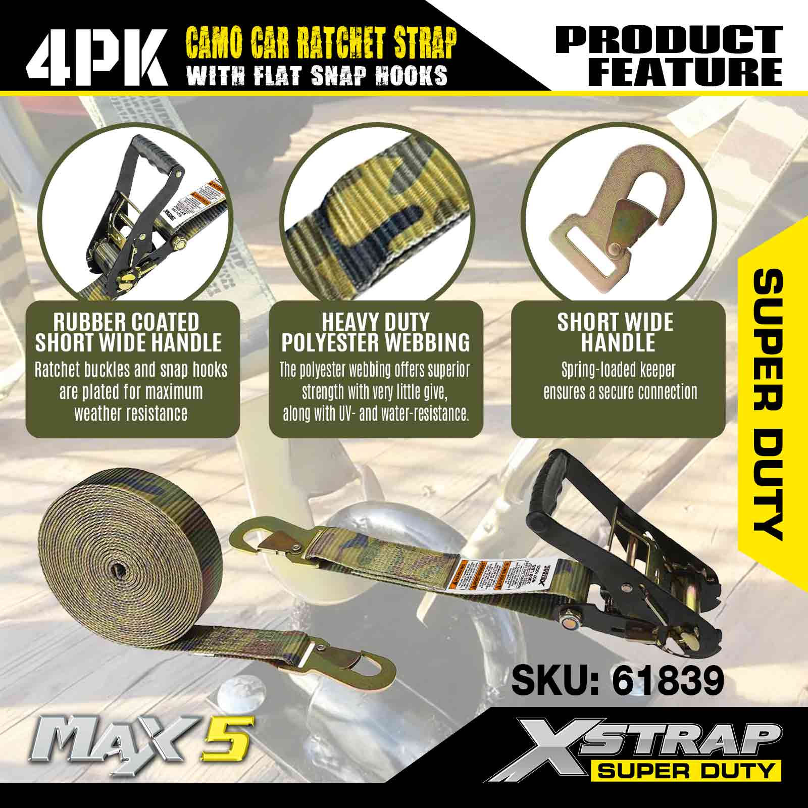 - 天候に安全な保護 - このタイダウンのストラップは天候に安全なポリエステルで作られています。このストラップは水の近くや直射日光の当たる場所でも安全に使用できます。このラチェット ストラップの金具は保護のために亜鉛メッキされています。