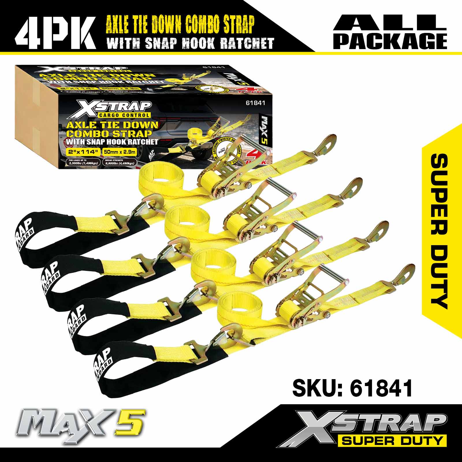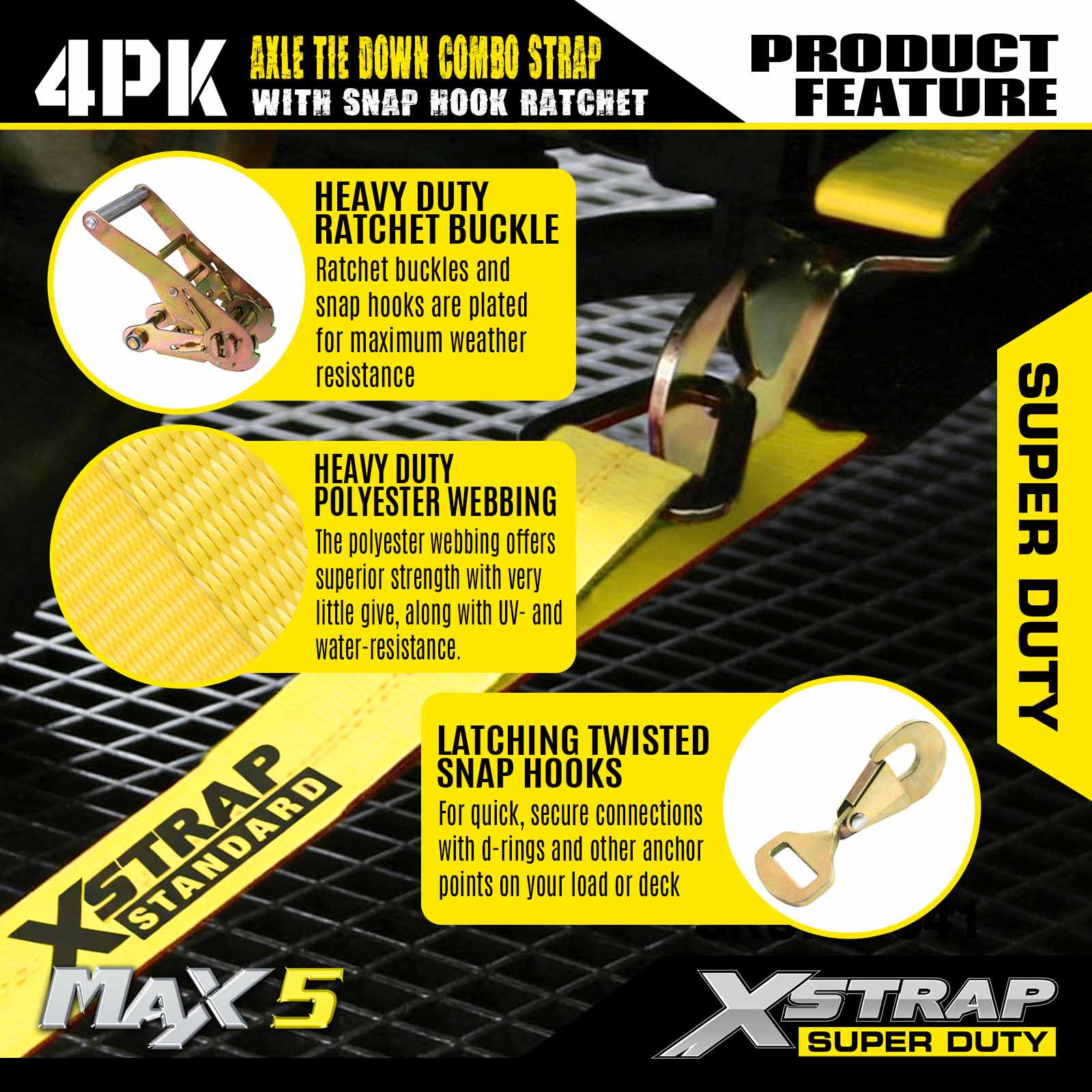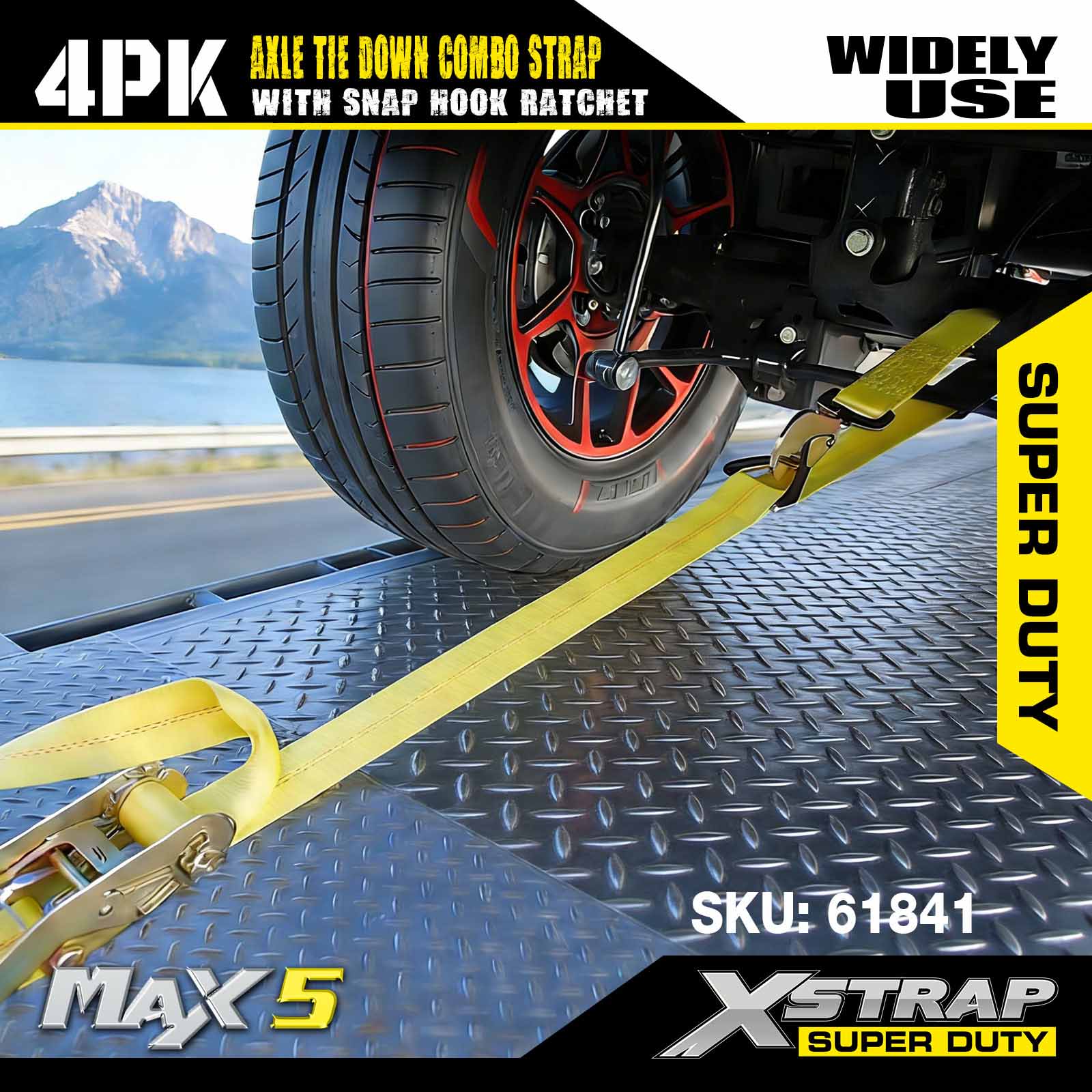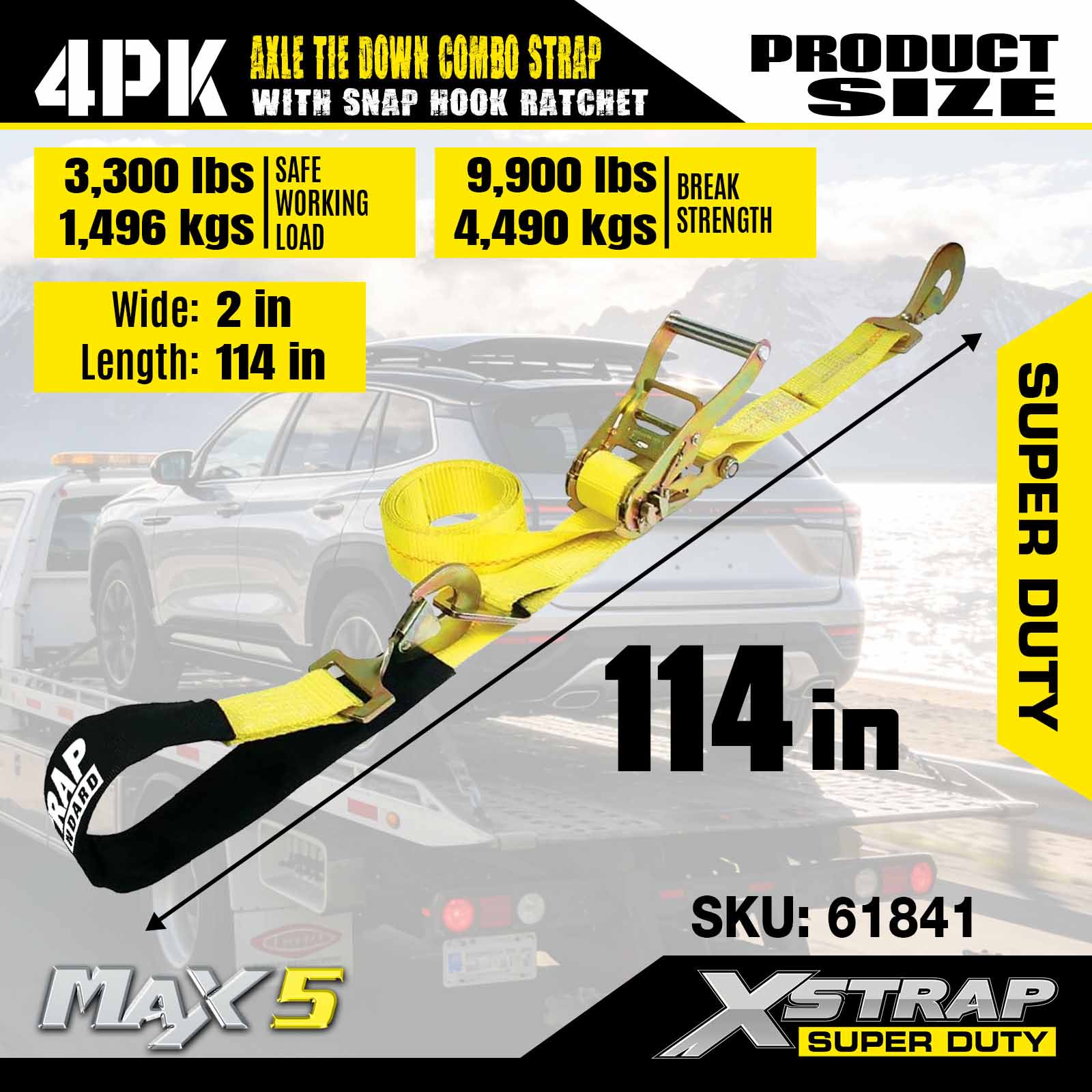 - 114 インチのアクスルストラップ 4 個パック: 多用途のなげなわ自動タイダウンは、輸送車両のリムに通すために使用され、ホイール、車軸、またはフレームの固い部分に固定することもできます。