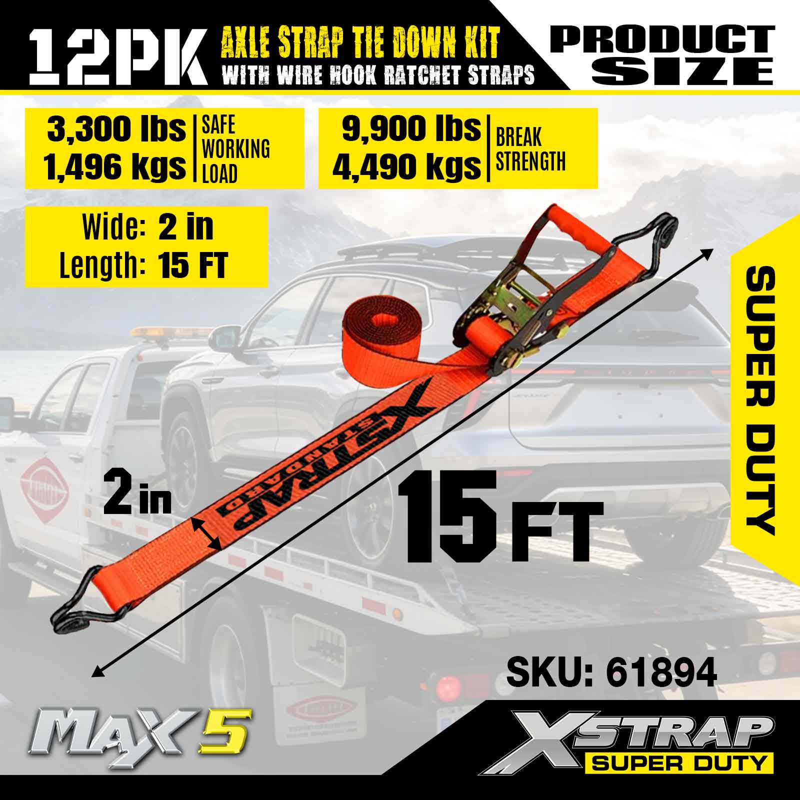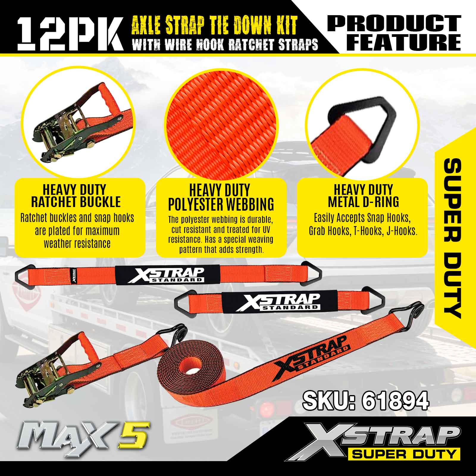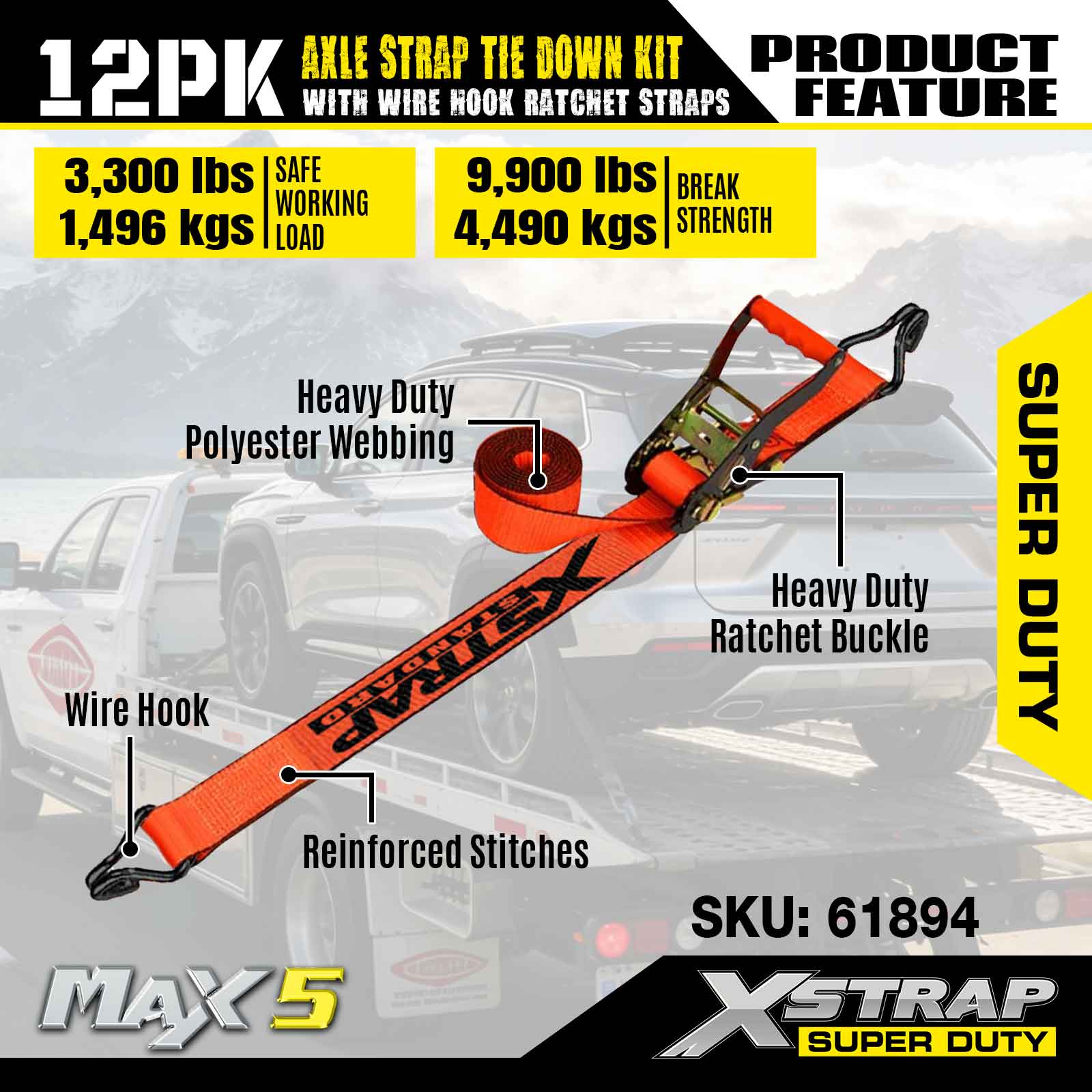 Xstrap 12PK アクスル ストラップ タイダウン キット (ワイヤー フック ラチェット ストラップ付き) – 超耐久性。安全使用荷重は 3,300LBS (1,496KG)、破壊強度は 9,900LBS (4,490KG) です。