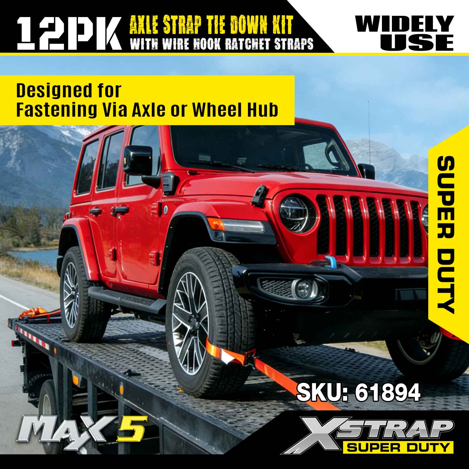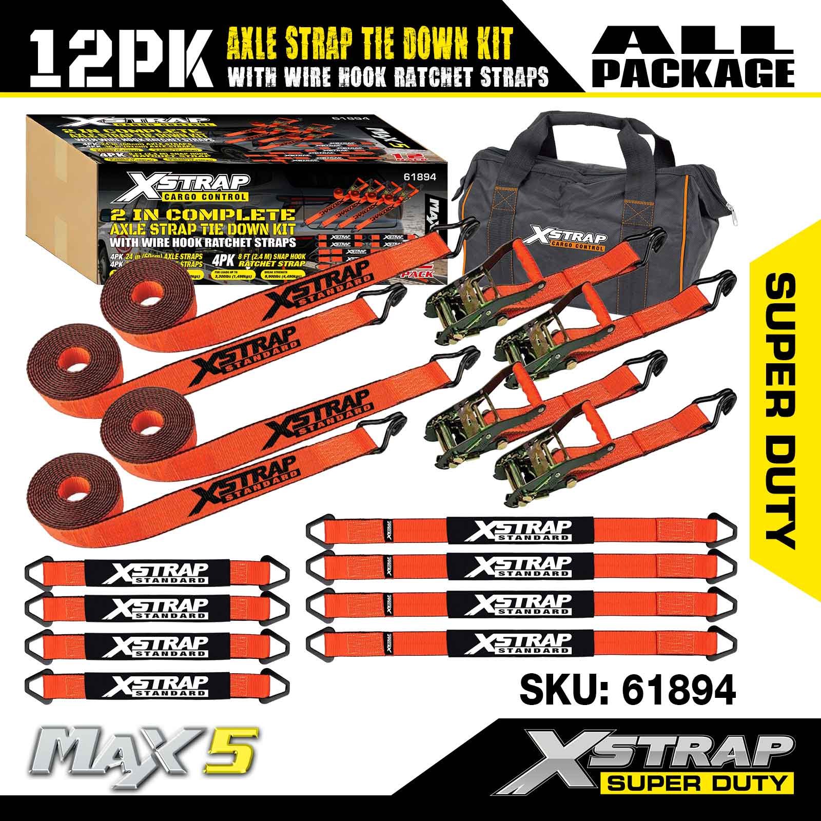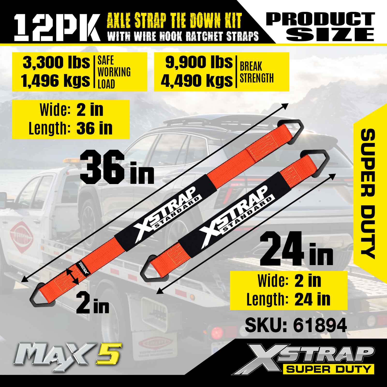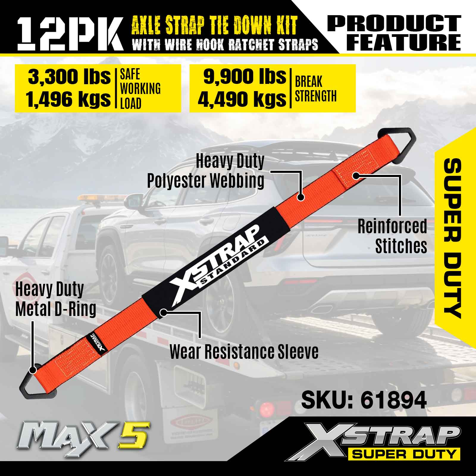 Xstrap 12PK アクスル ストラップ タイダウン キット (ワイヤー フック ラチェット ストラップ付き) – 超耐久性。安全使用荷重は 3,300LBS (1,496KG)、破壊強度は 9,900LBS (4,490KG) です。