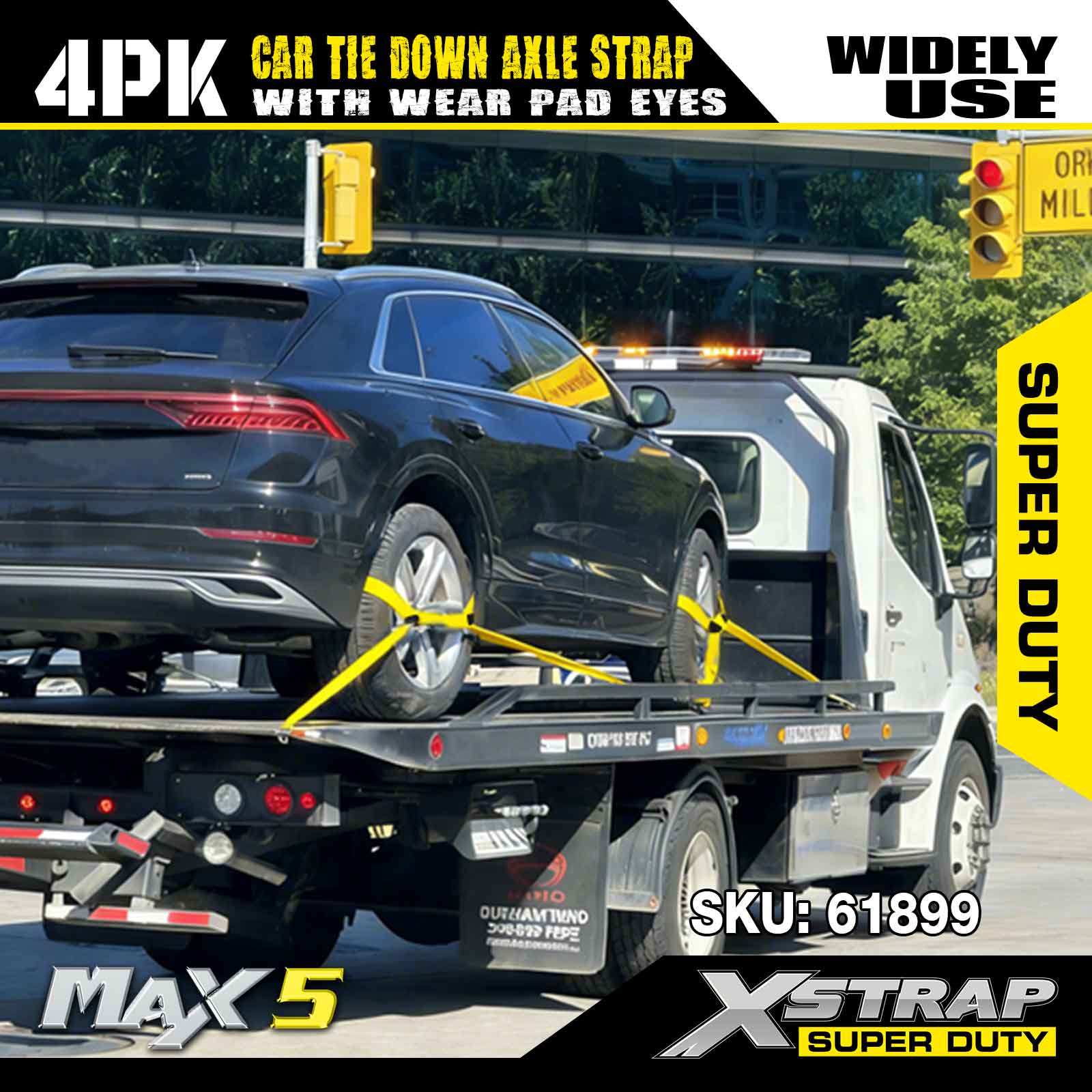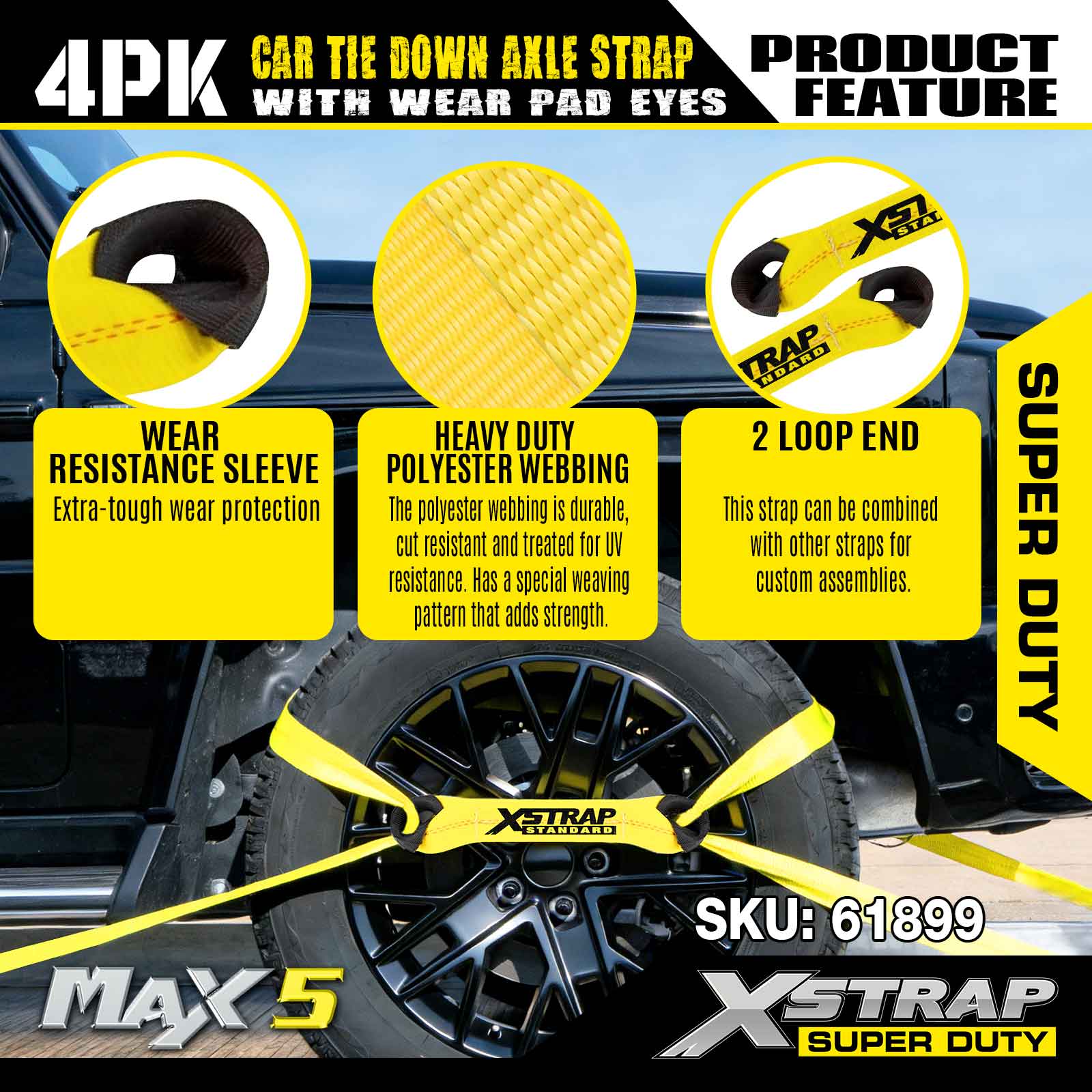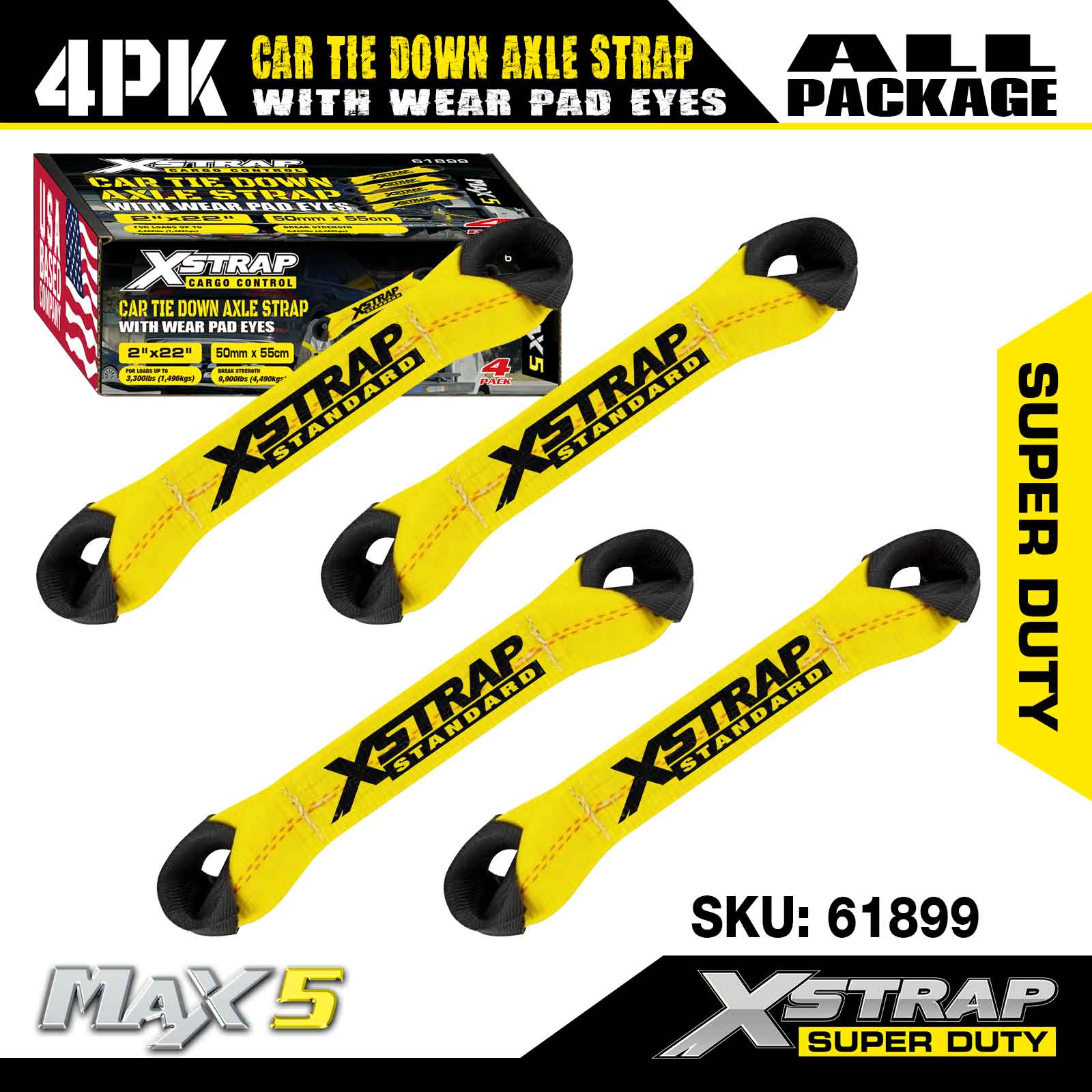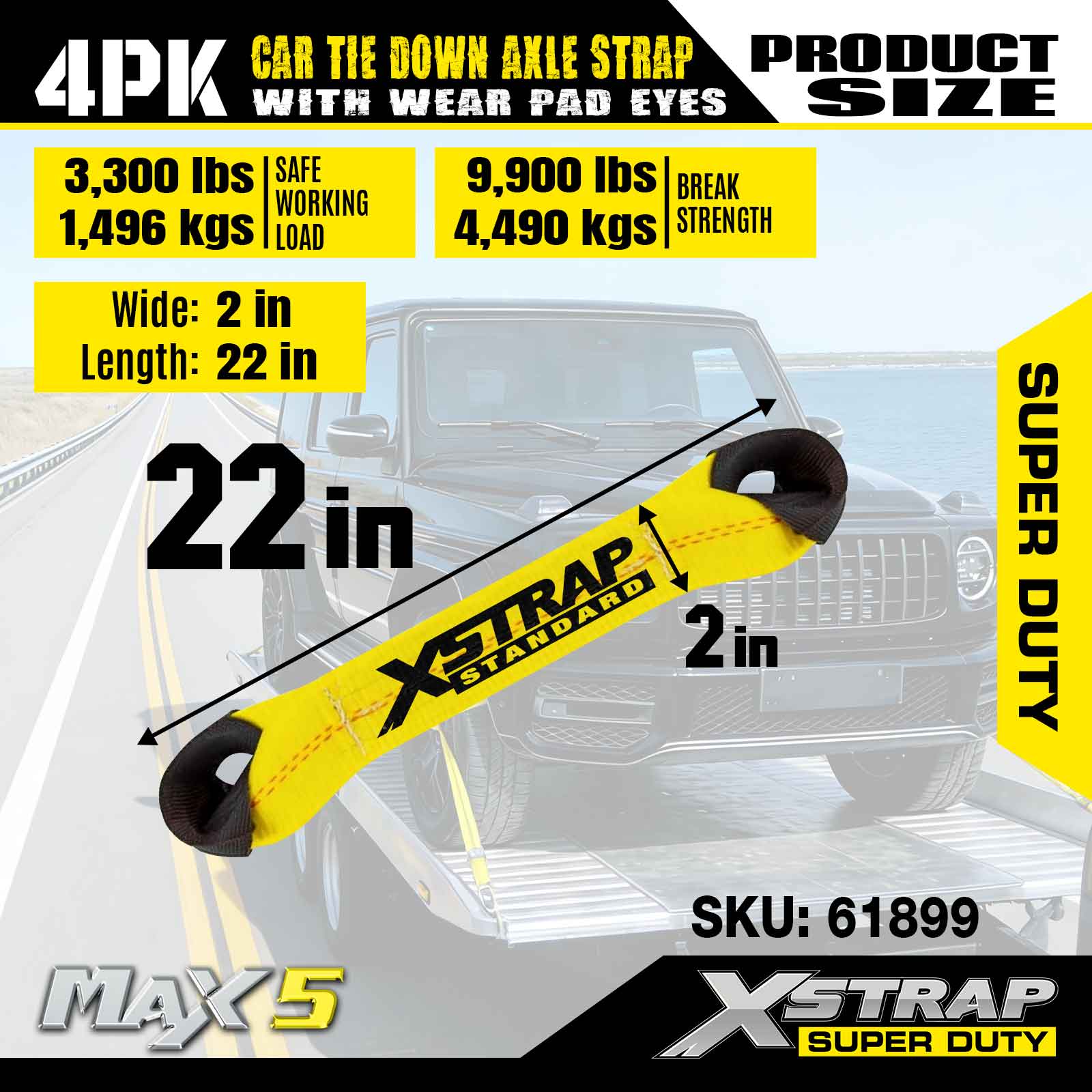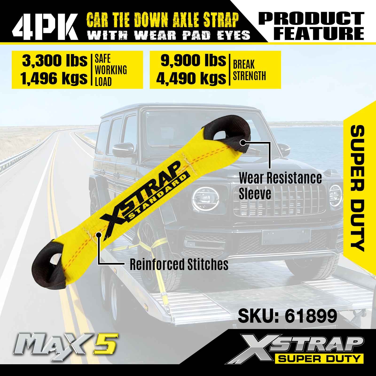 Xstrap 4PK 車用タイダウンアクスルストラップ (摩耗パッドアイ付き) – 超耐久性。安全使用荷重は 3,300LBS (1,496KG)、破壊強度は 9,900LBS (4,490KG) です。