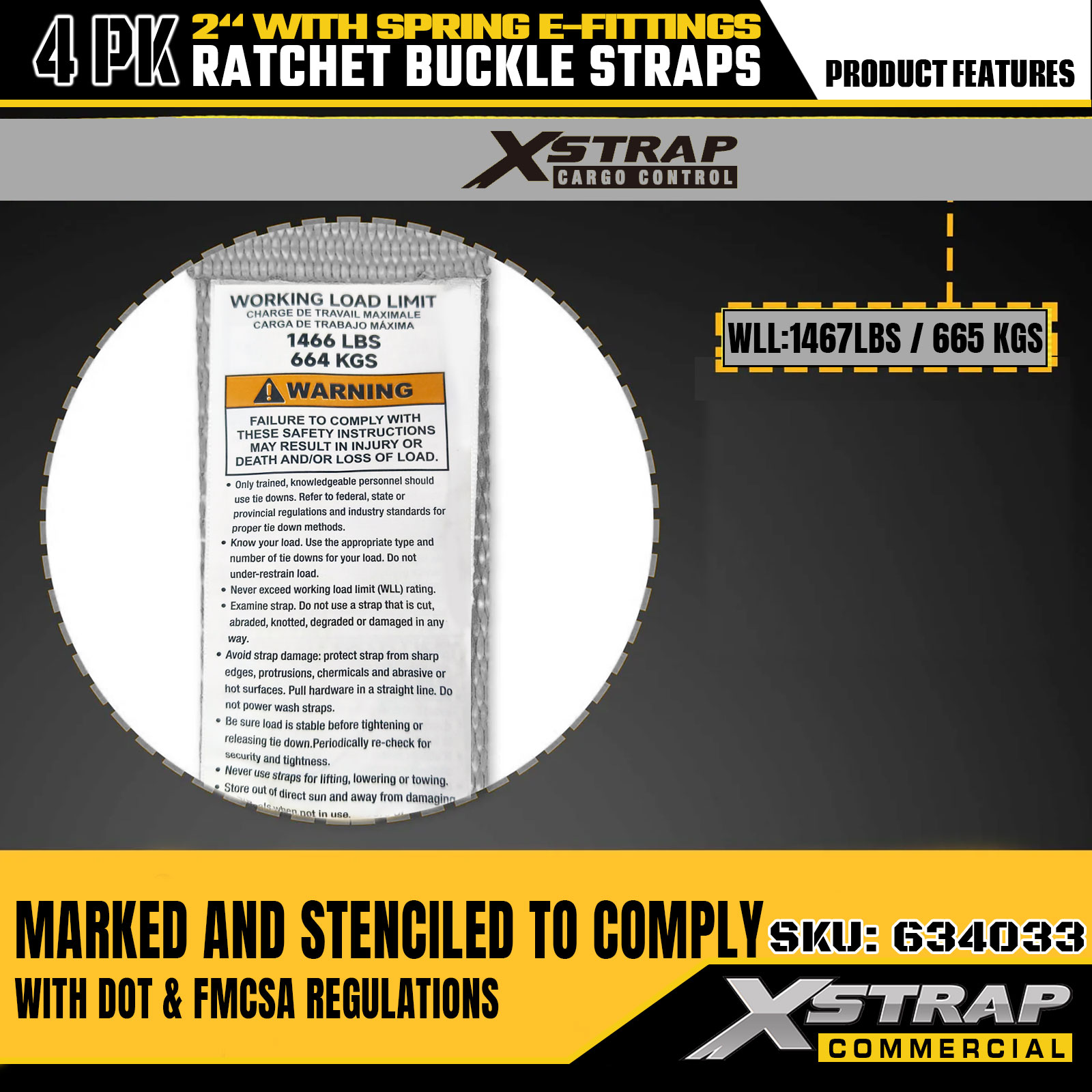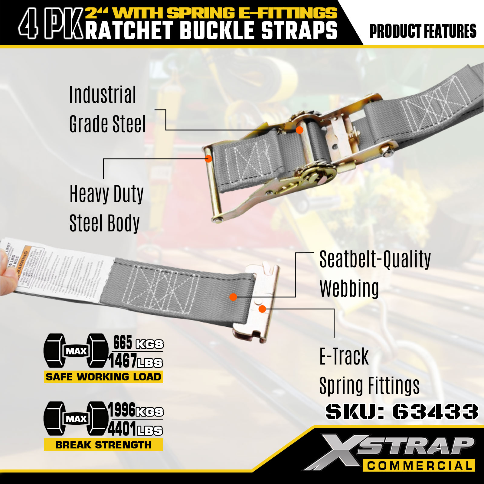 Xstrap ラチェットタイダウンストラップ 4 個パック、2 インチ x 16 フィートのポリエステル貨物固定ストラップ、安全使用荷重 1467 ポンド & 破断強度 4401 ポンド、トラック、芝刈り機、ATV 用メタル E フック付き2.製品仕様: