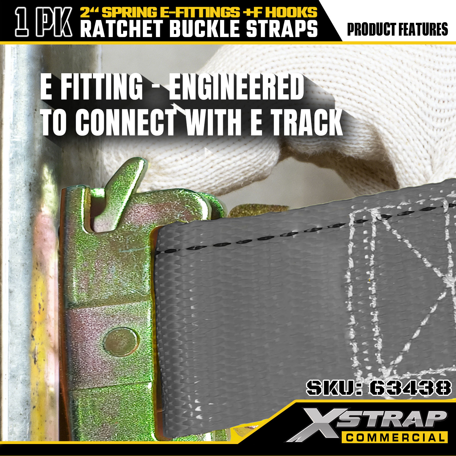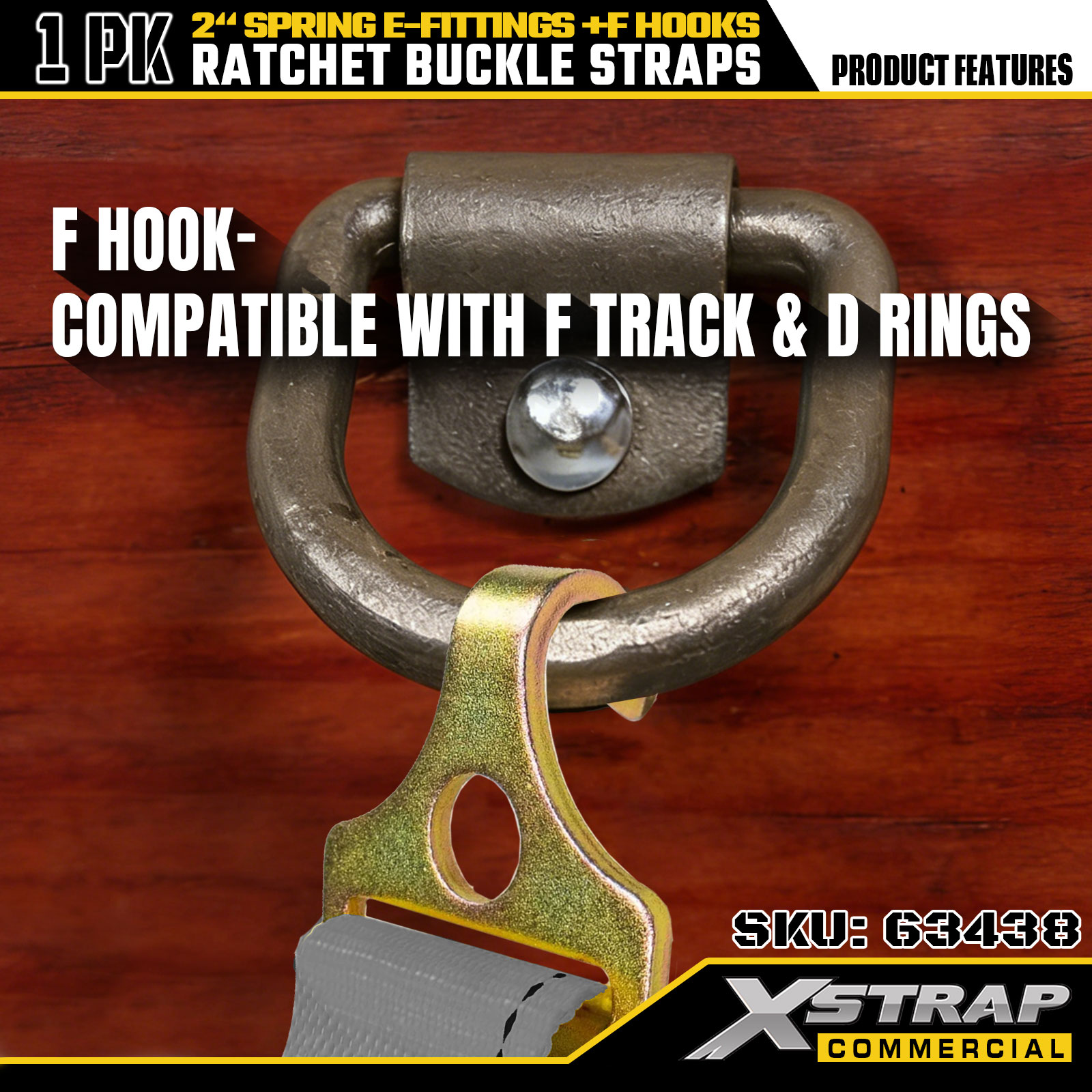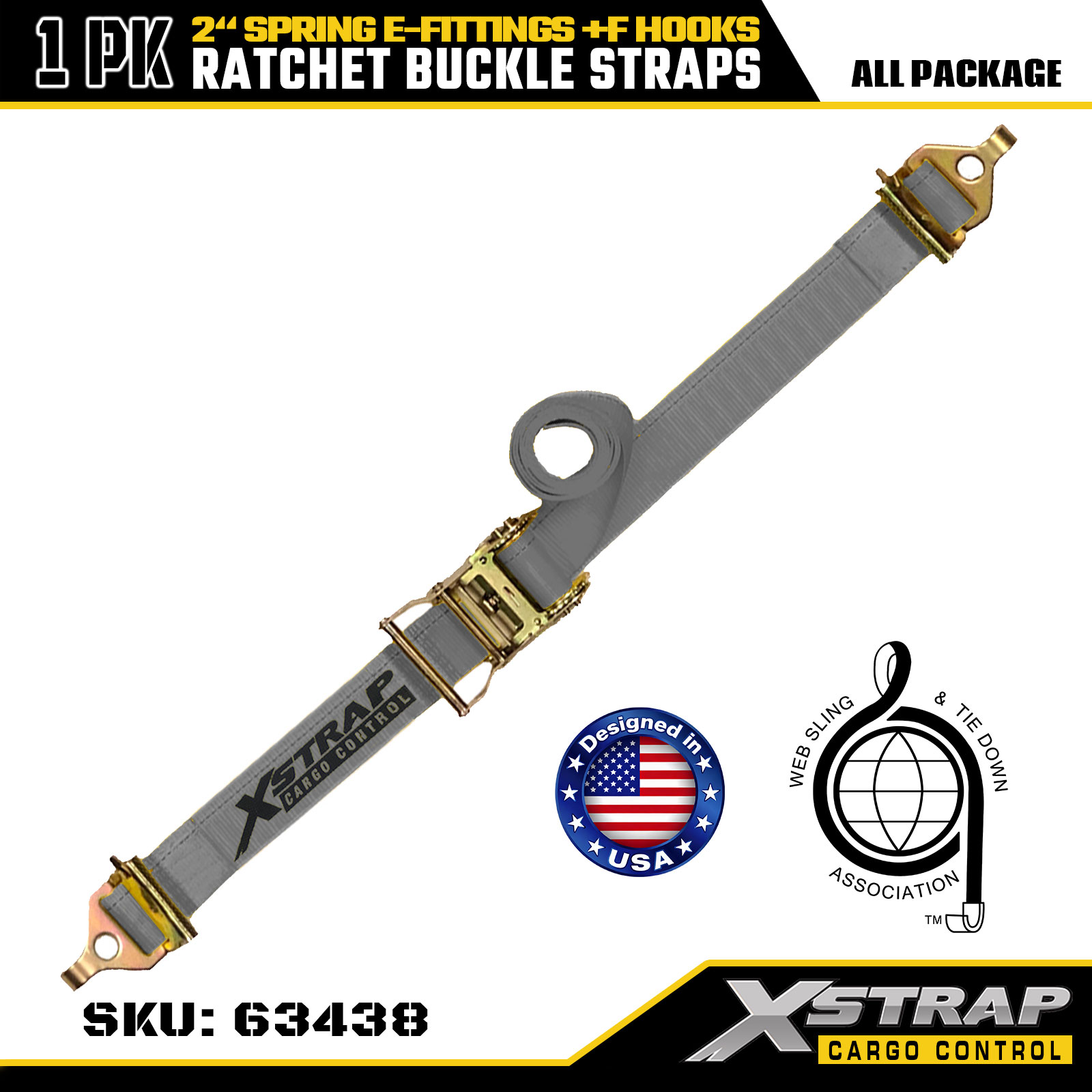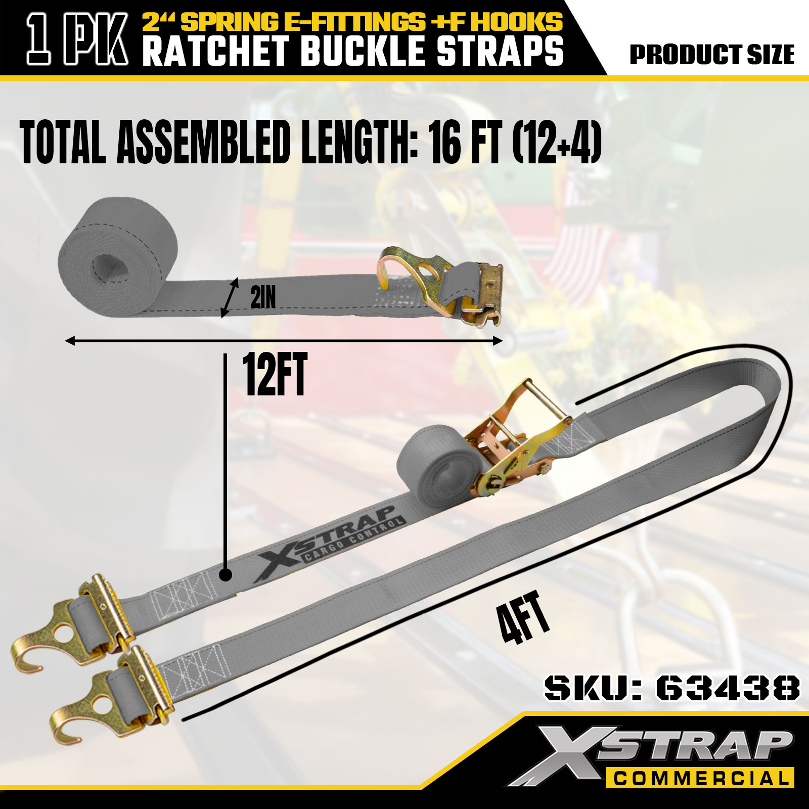 2 インチ x 16 フィート 1PK ラチェット ストラップ、スプリング E フィッティングと F フック付き