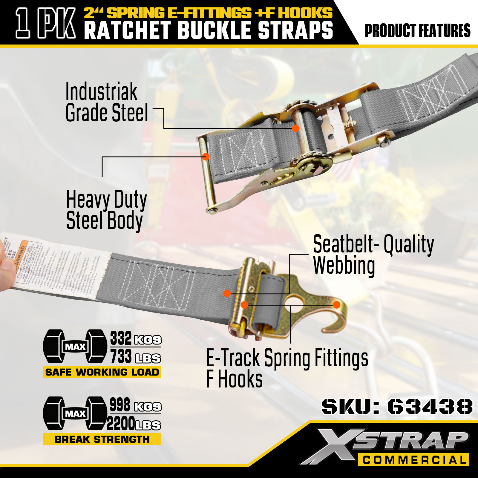 Xstrap ラチェットタイダウンストラップ 1 パック 2 インチ x 16 フィート ポリエステル、スプリング E フィッティングと F フック付き、SWL 733 ポンドおよび破断強度 332 ポンド トラック、引越し、一般貨物輸送用