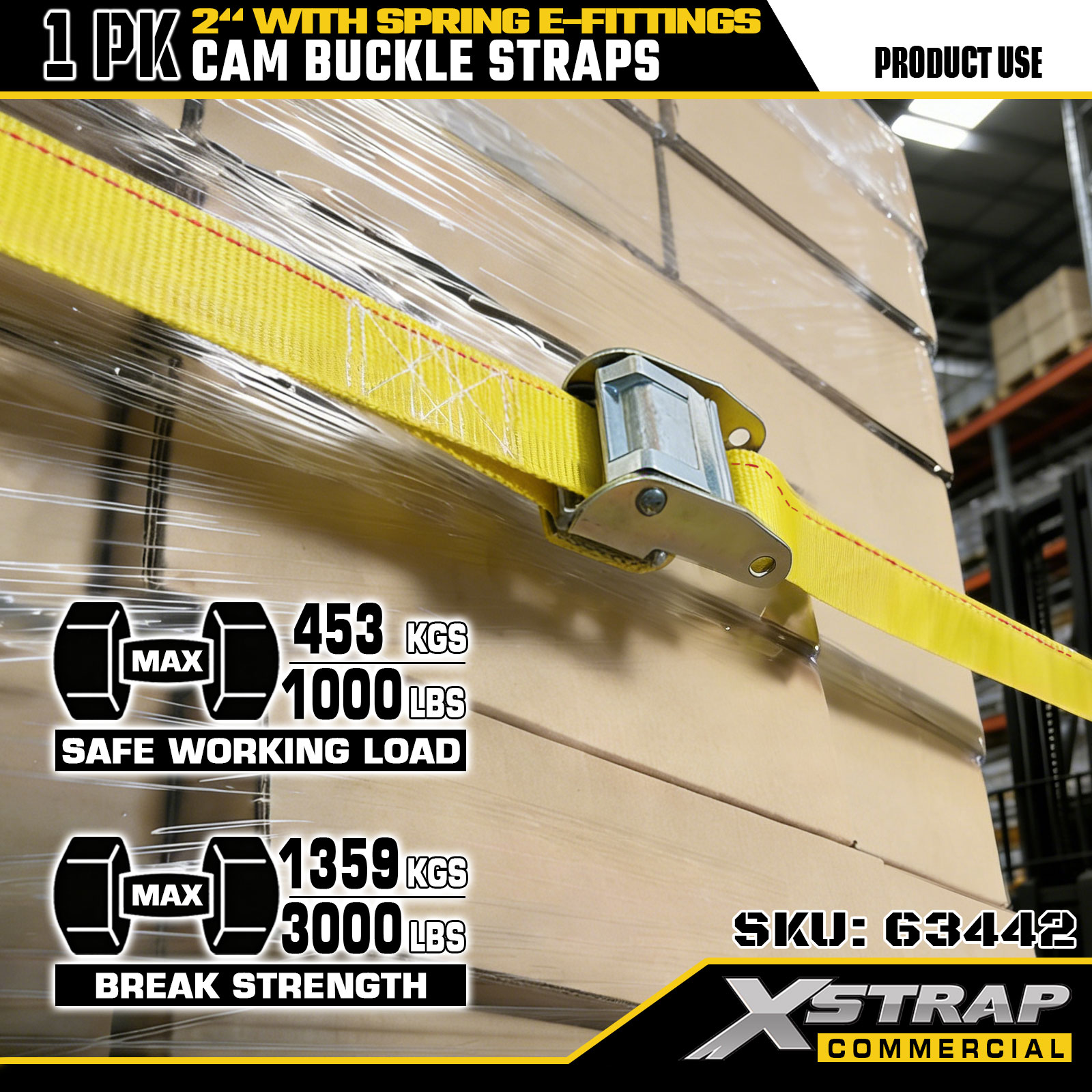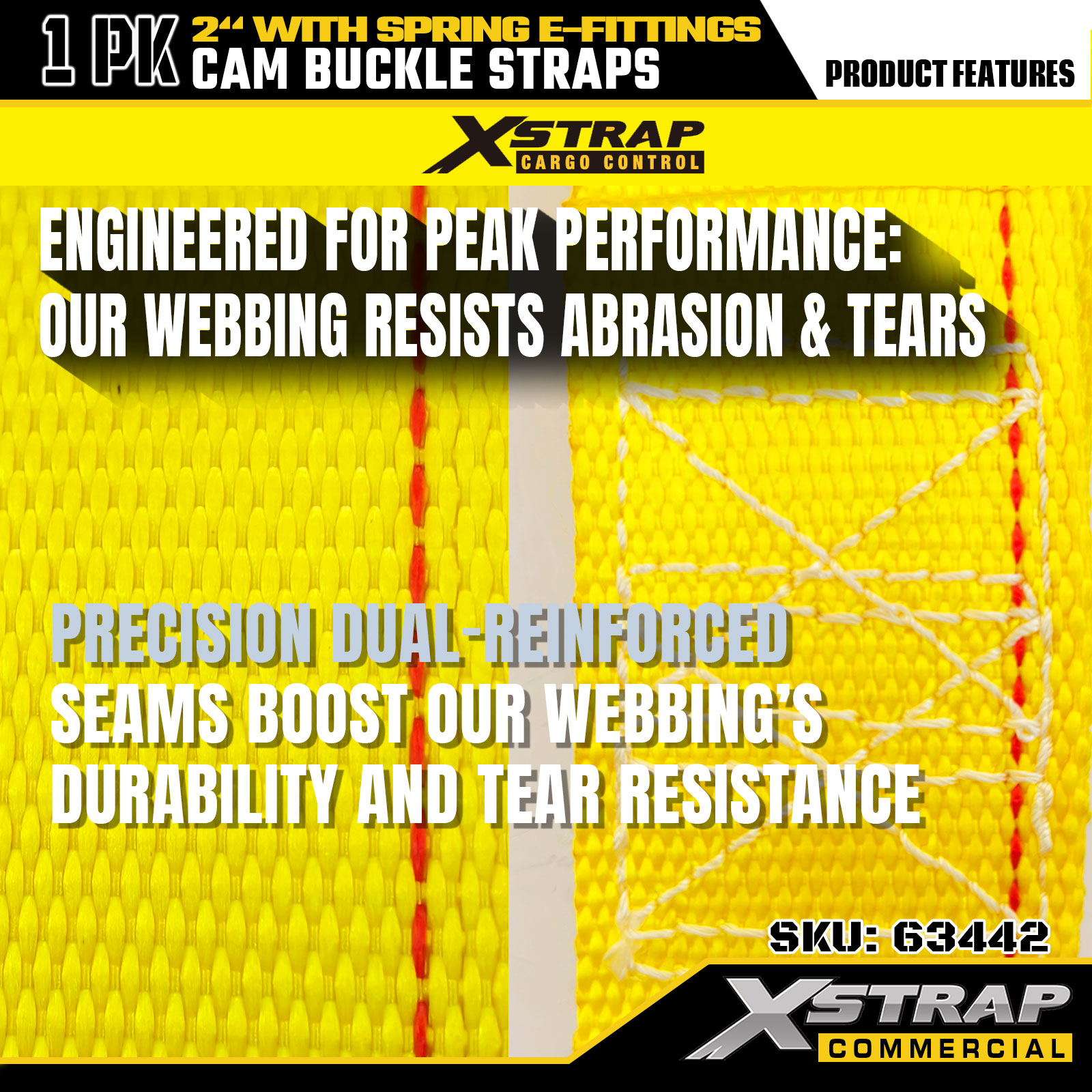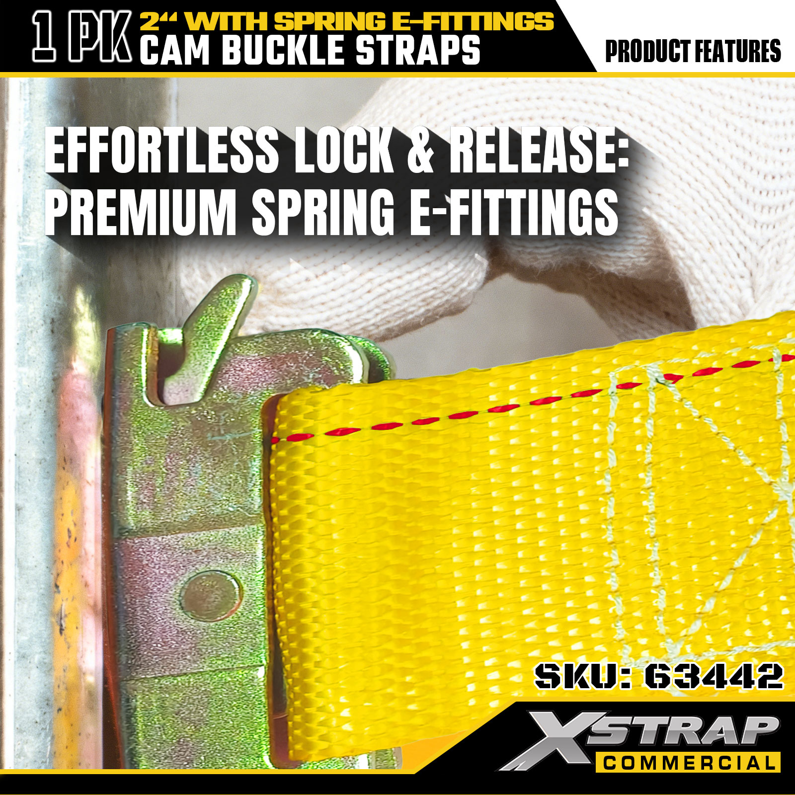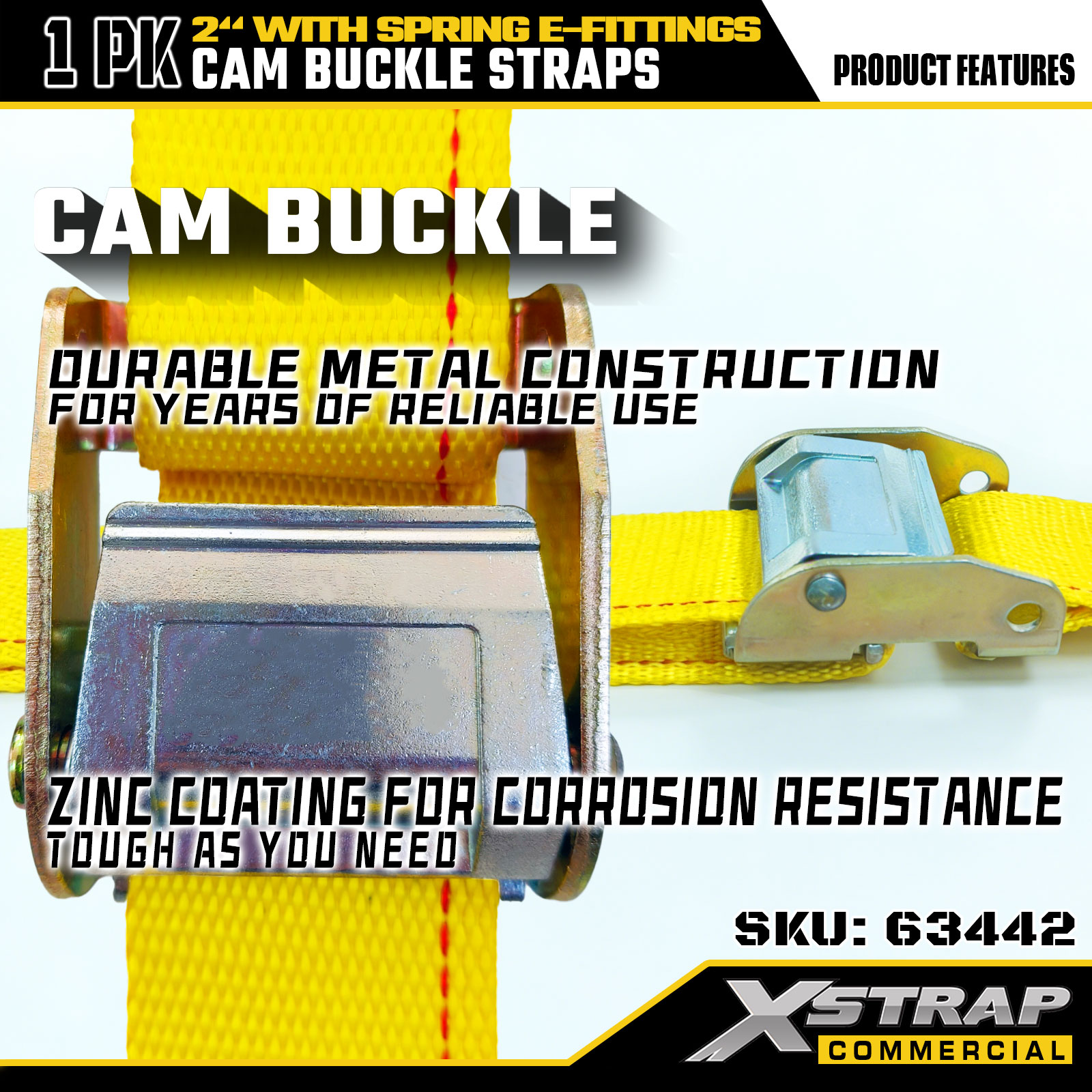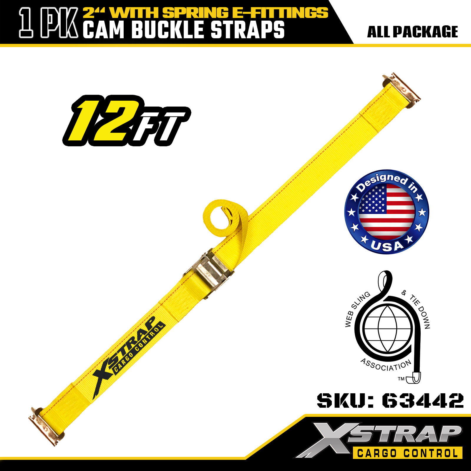Xstrap 63442 高耐久カムバックルストラップ 2 インチ x 12 フィート (1PK) - スプリング E フィッティング付きイエロー ポリエステル、1000 ポンド SWL および 453 ポンド破断強度、移動、貨物制御、輸送用