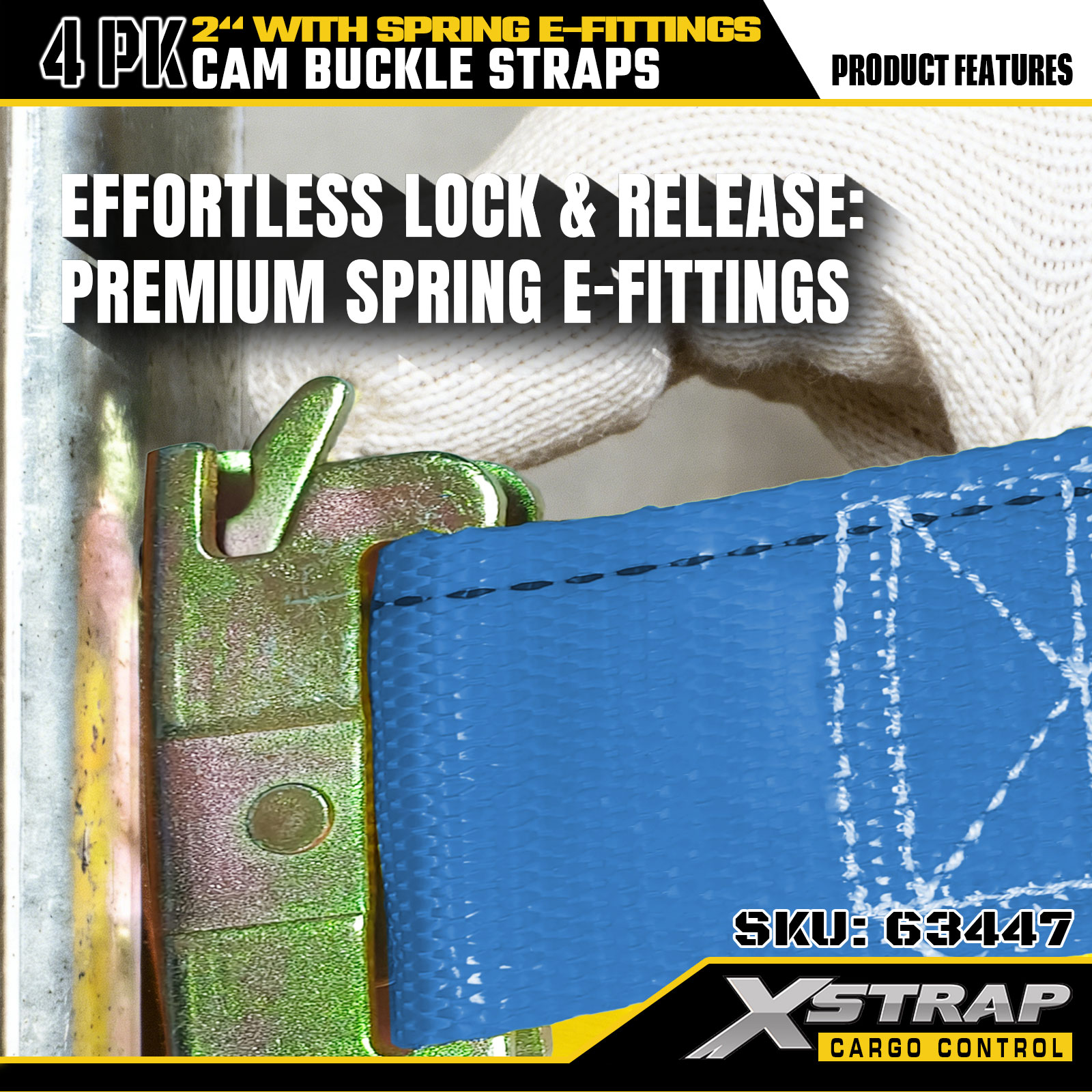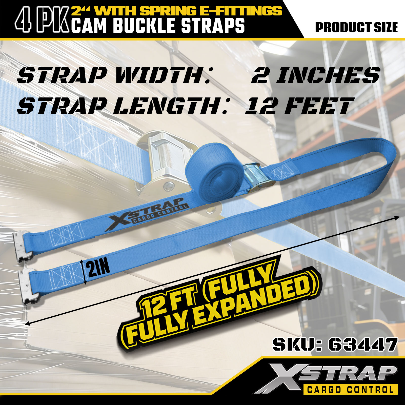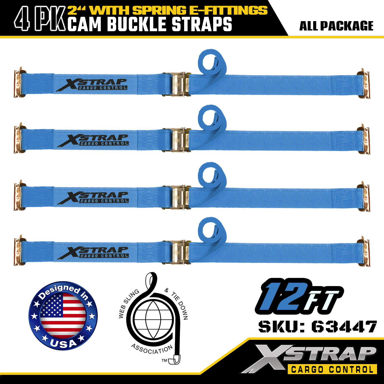 Xstrap 63447 4パック 2インチ x 12フィート ブルー ラチェット ストラップ スプリング E-フィッティング & F フック付き、SWL 733 ポンド、破断強度 332 ポンド 貨物管理、移動、輸送用