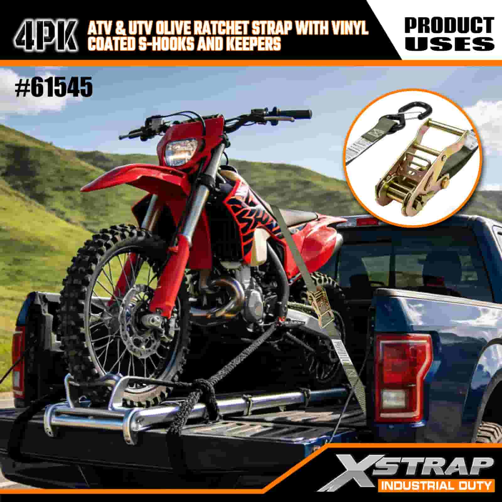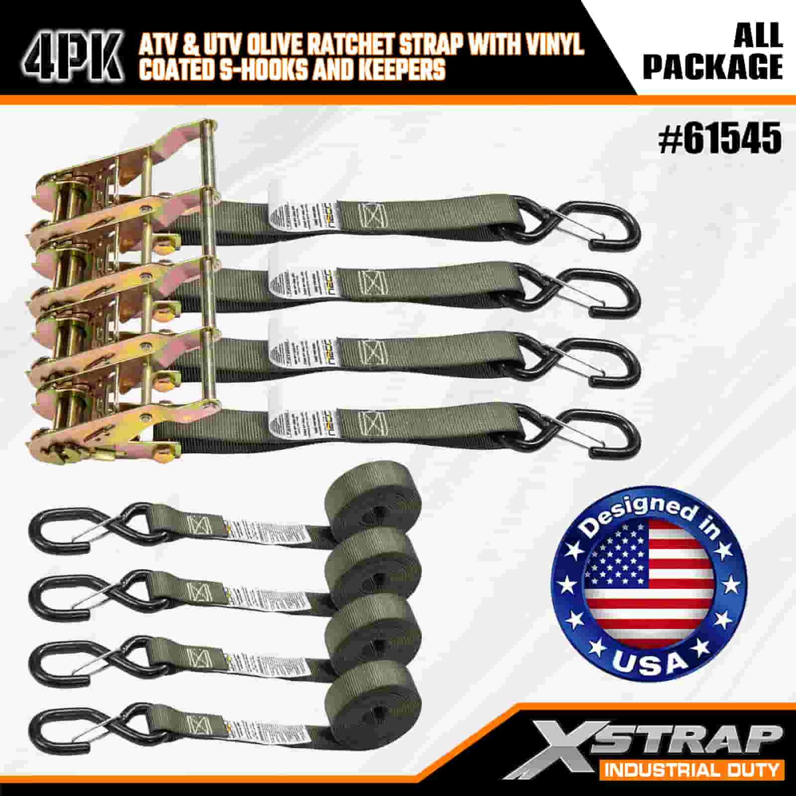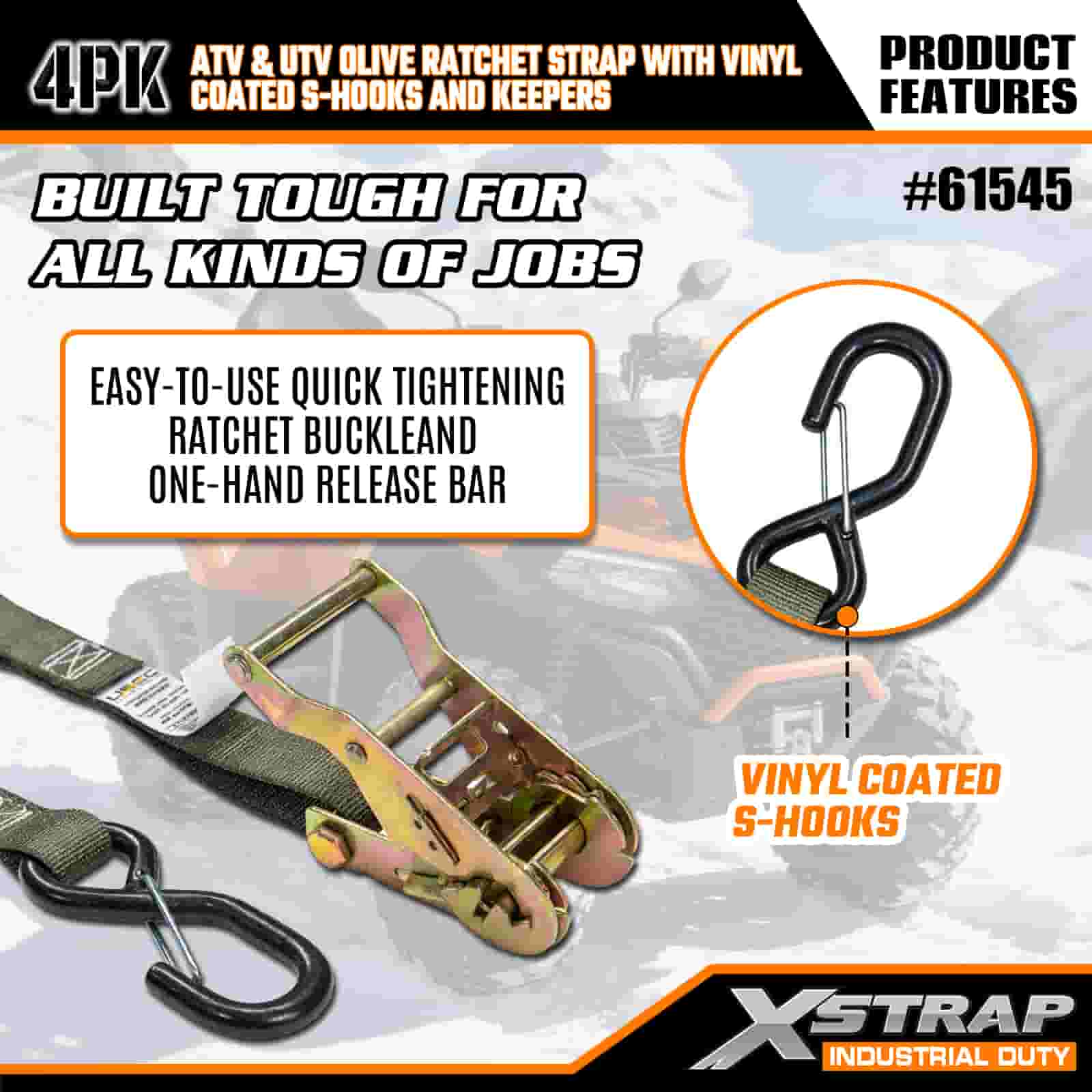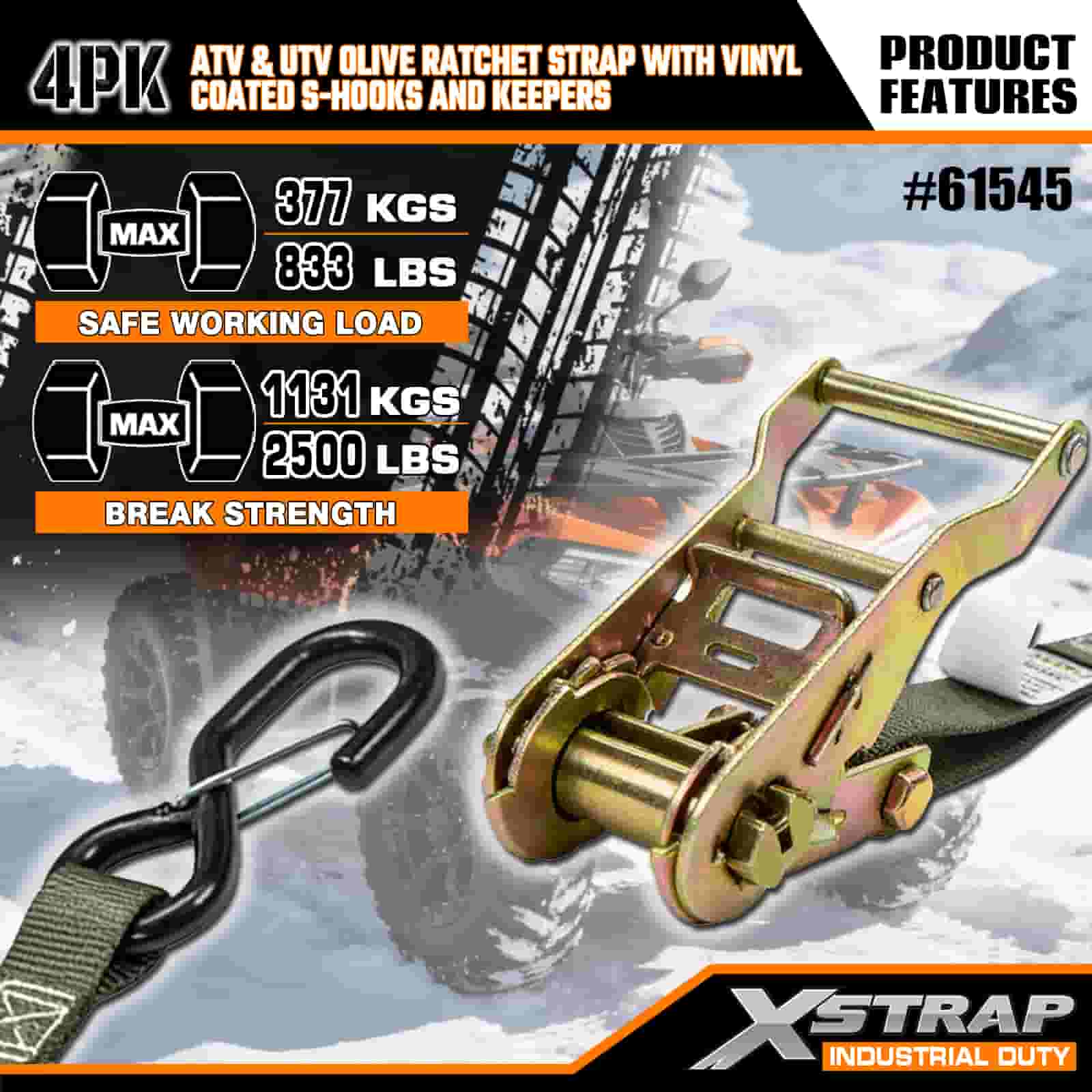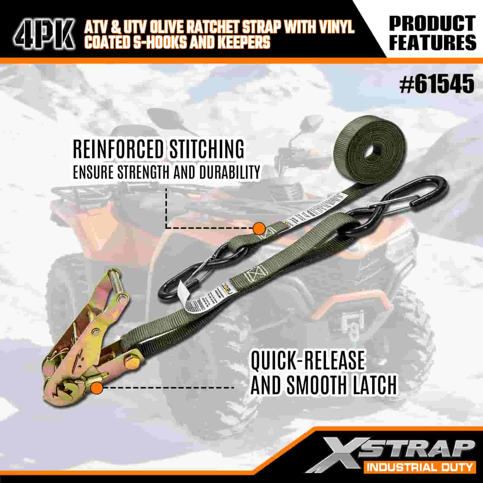 - 完全にカバーする4本パック: このセットには4本のストラップが含まれており、ATVまたはUTVの前面と背面の両方を固定するのに十分です。 8 フィートの長さはトラックの荷台、トレーラー、またはタイダウンポイントにフィットするため、いつでも安定したホールドを得ることができます。