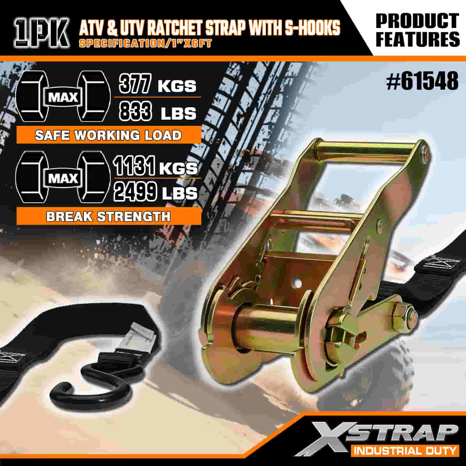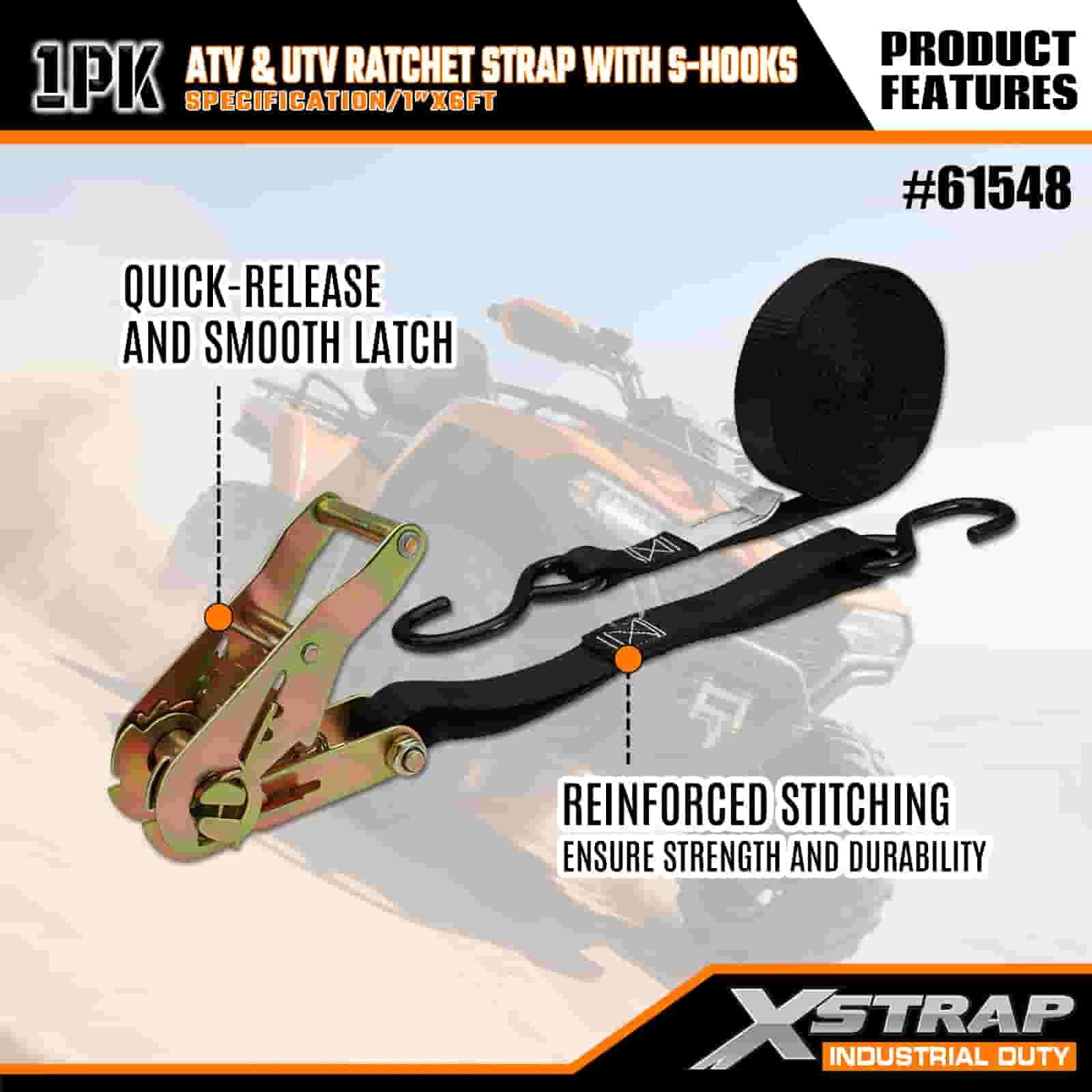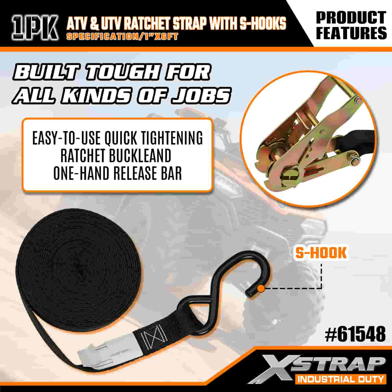 Xstrap ATV & AUV ラチェットストラップ S フック付き、1 インチ x 6 フィート ポリエステル製タイダウンストラップ ラチェットストラップ、耐荷重 833 ポンドのカーゴラッシング固定ストラップ、S フック付き、トレーラー、フラットベッドトレーラー、スキーボート、小型車、重機用。