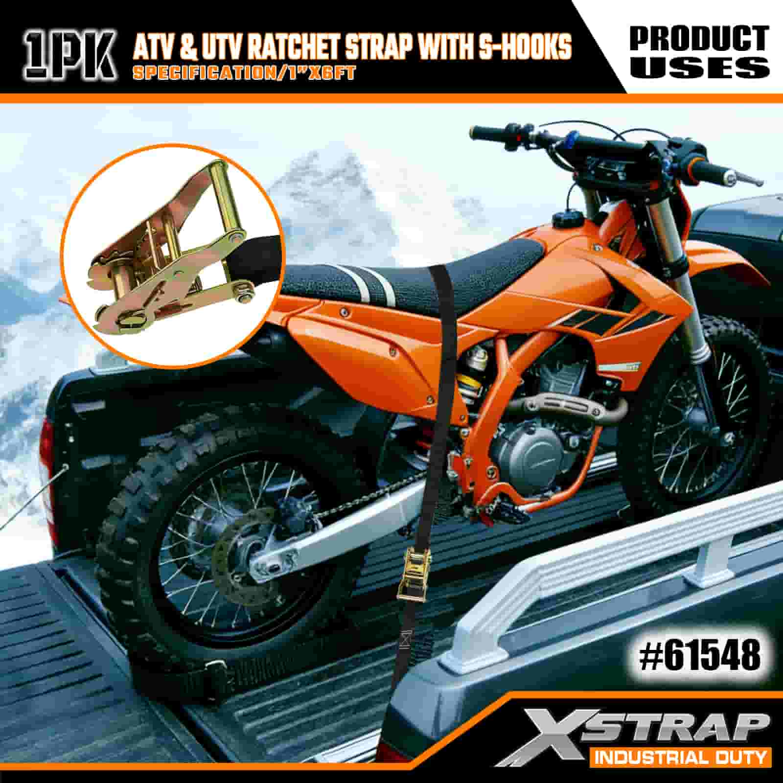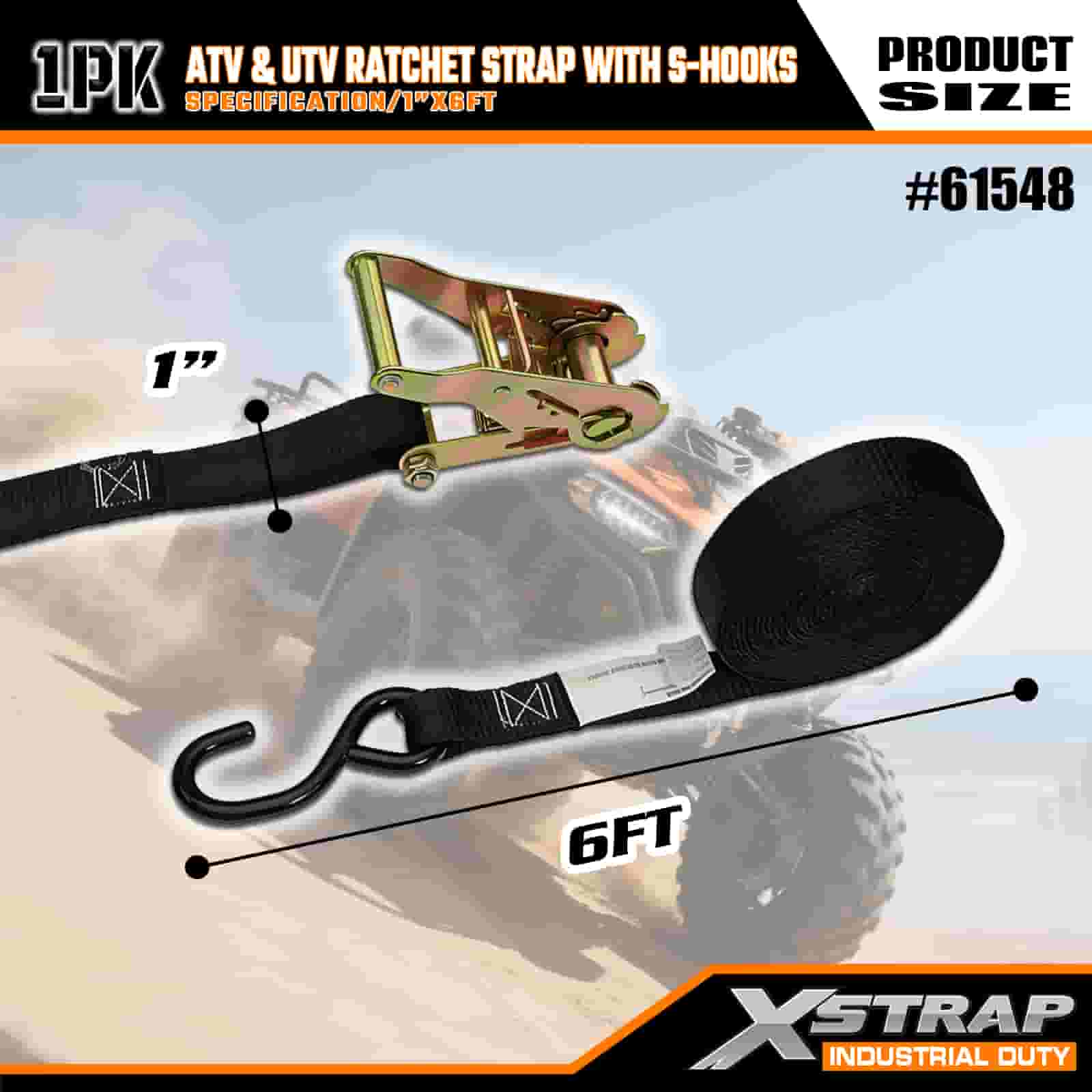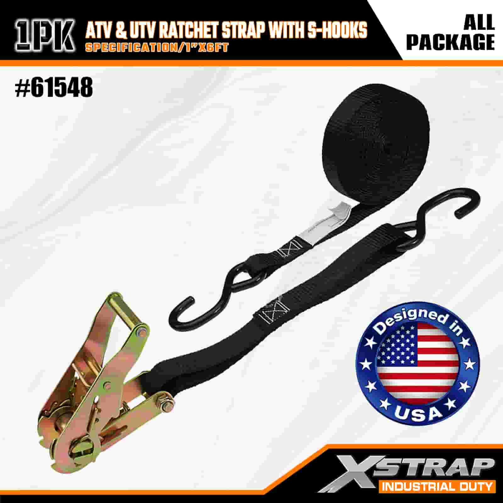 Xstrap ATV & AUV ラチェットストラップ S フック付き、1 インチ x 6 フィート ポリエステル製タイダウンストラップ ラチェットストラップ、耐荷重 833 ポンドのカーゴラッシング固定ストラップ、S フック付き、トレーラー、フラットベッドトレーラー、スキーボート、小型車、重機用。
