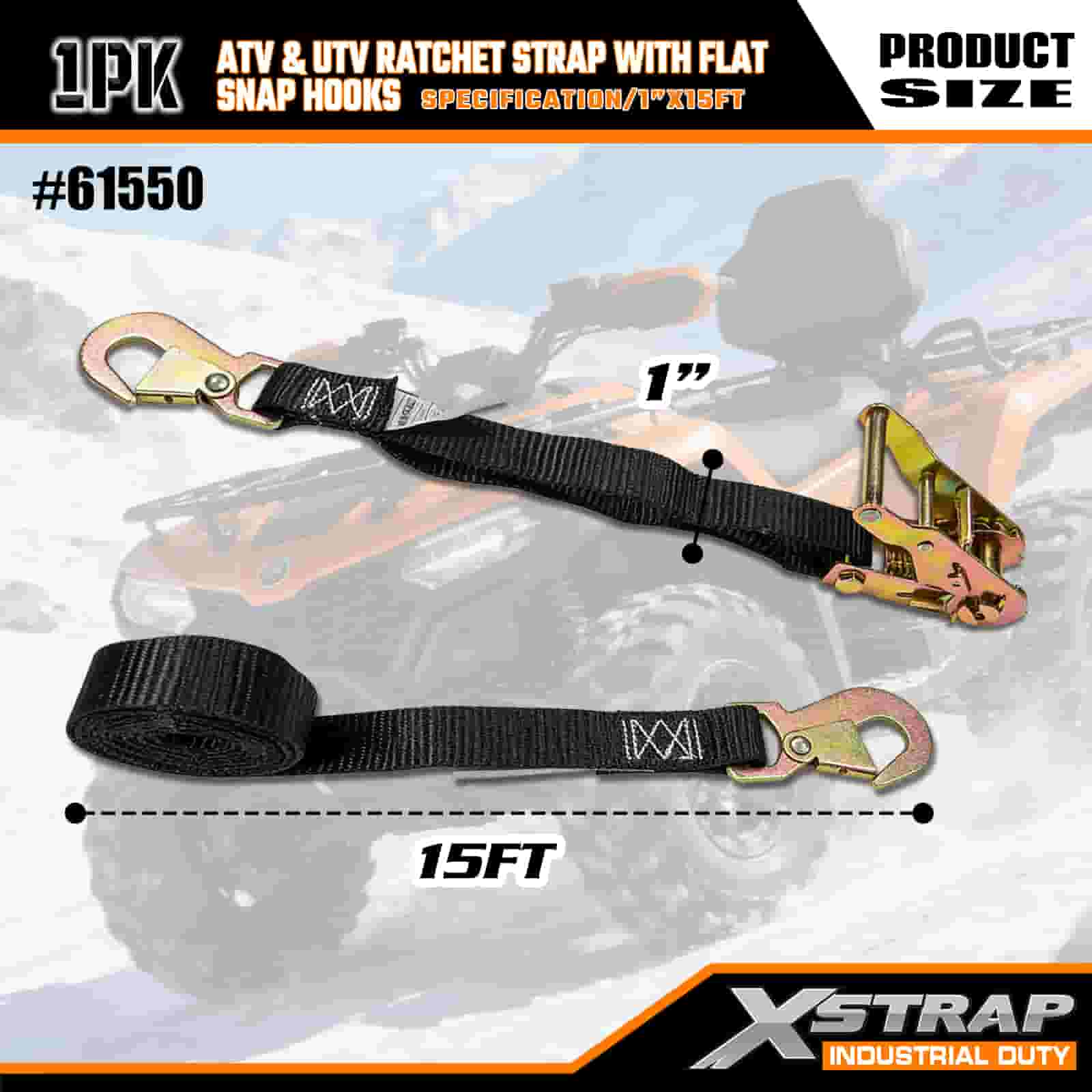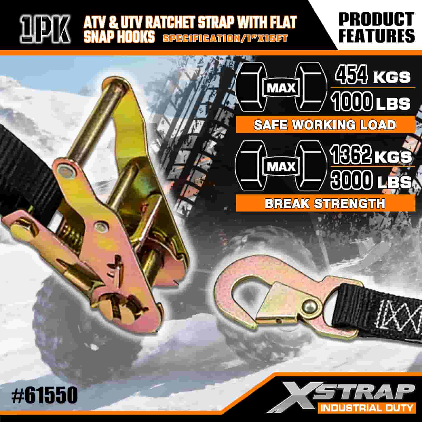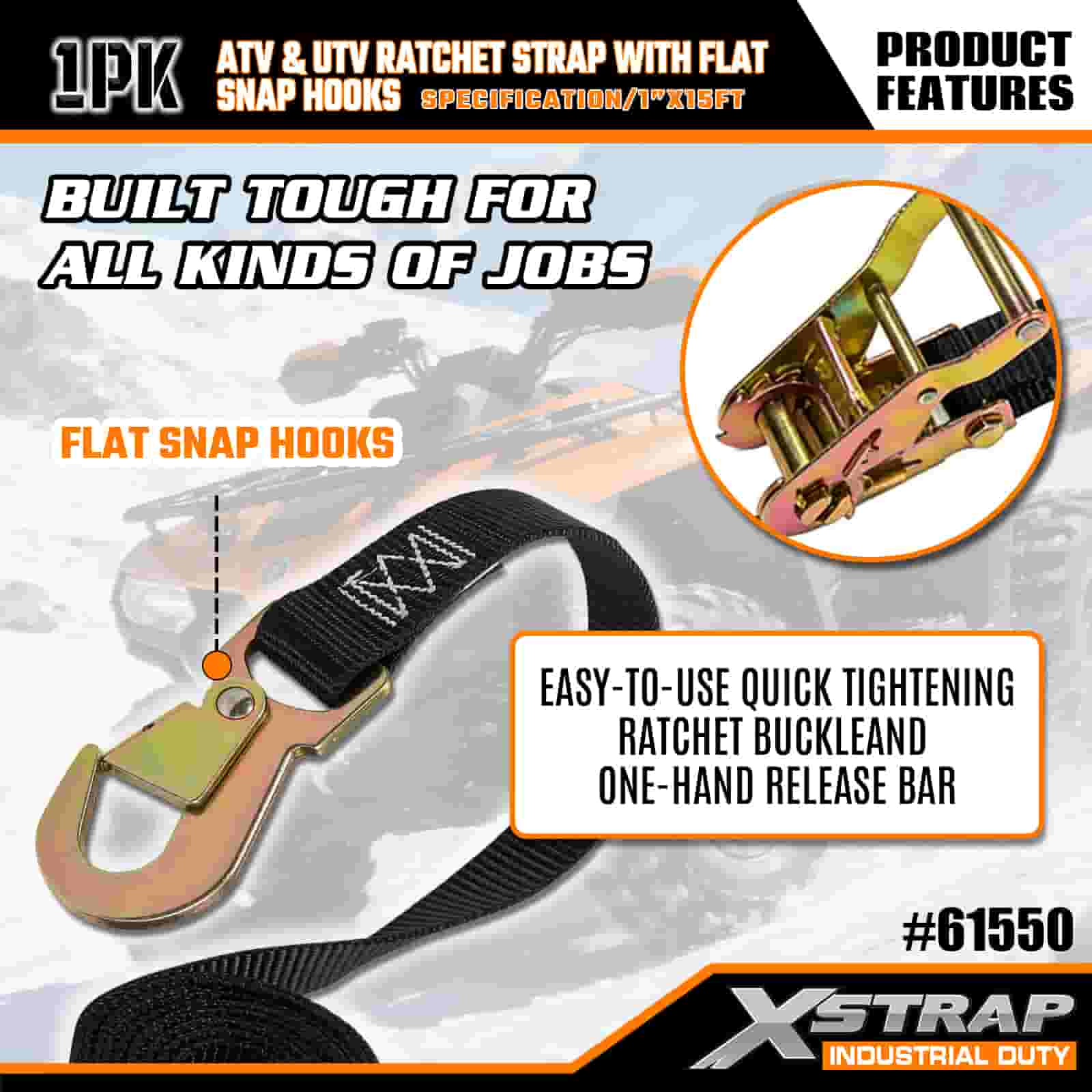 Xstrap ATV & AUV ラチェット ストラップ フラット スナップ フック付き、1 インチ x 15 フィート ポリエステル製タイダウン ストラップ ラチェット ストラップ、耐荷重 1000 ポンドの貨物ラッシング固定ストラップ、フラット スナップ付き、トレーラー、フラット ベッド トレーラー スキー ボート、小型車、重機用。