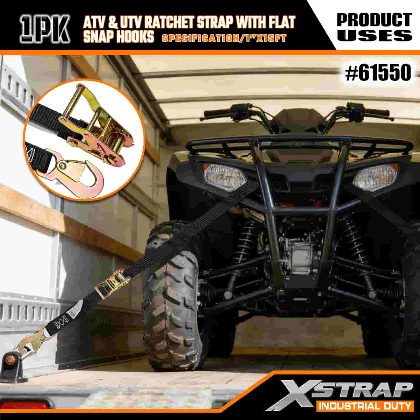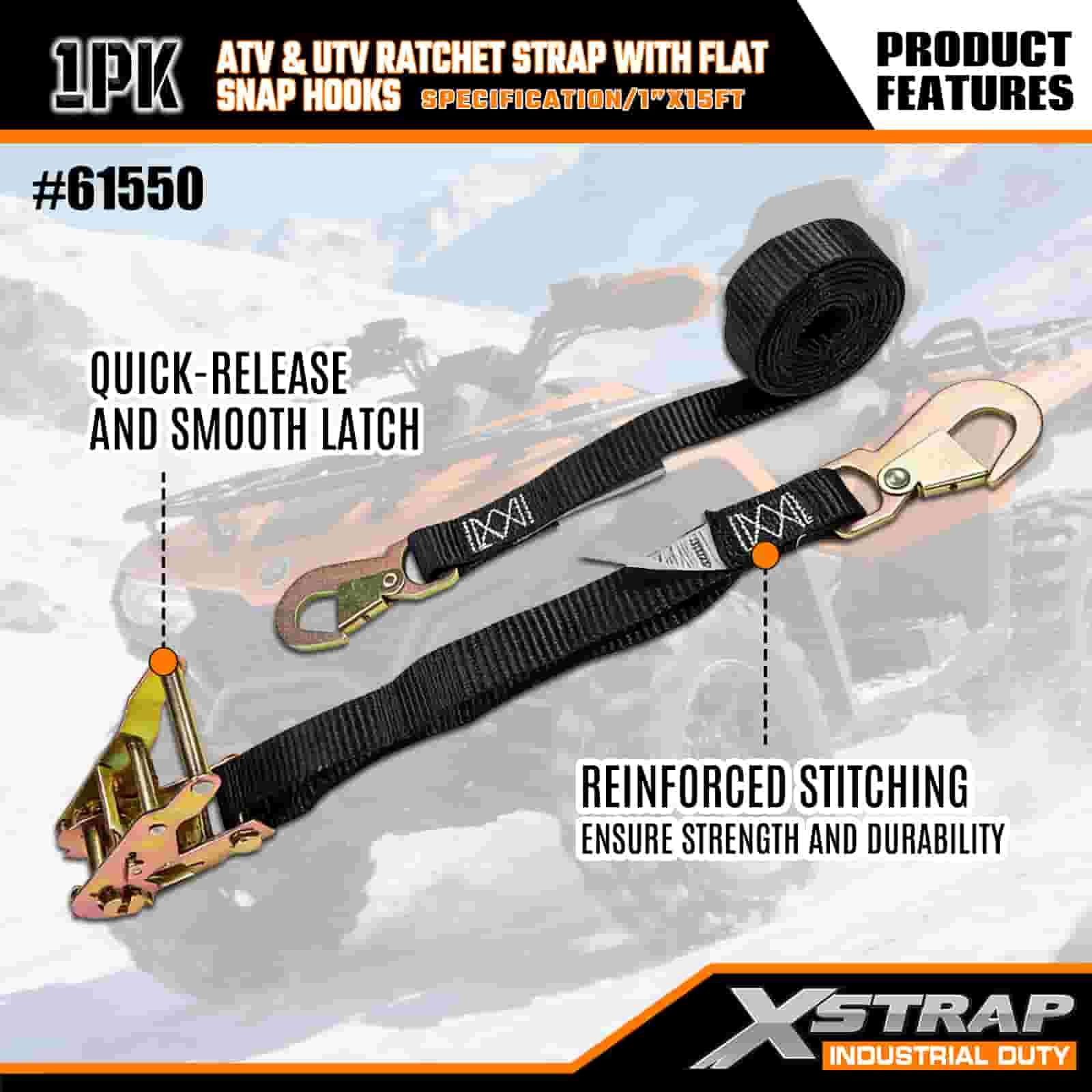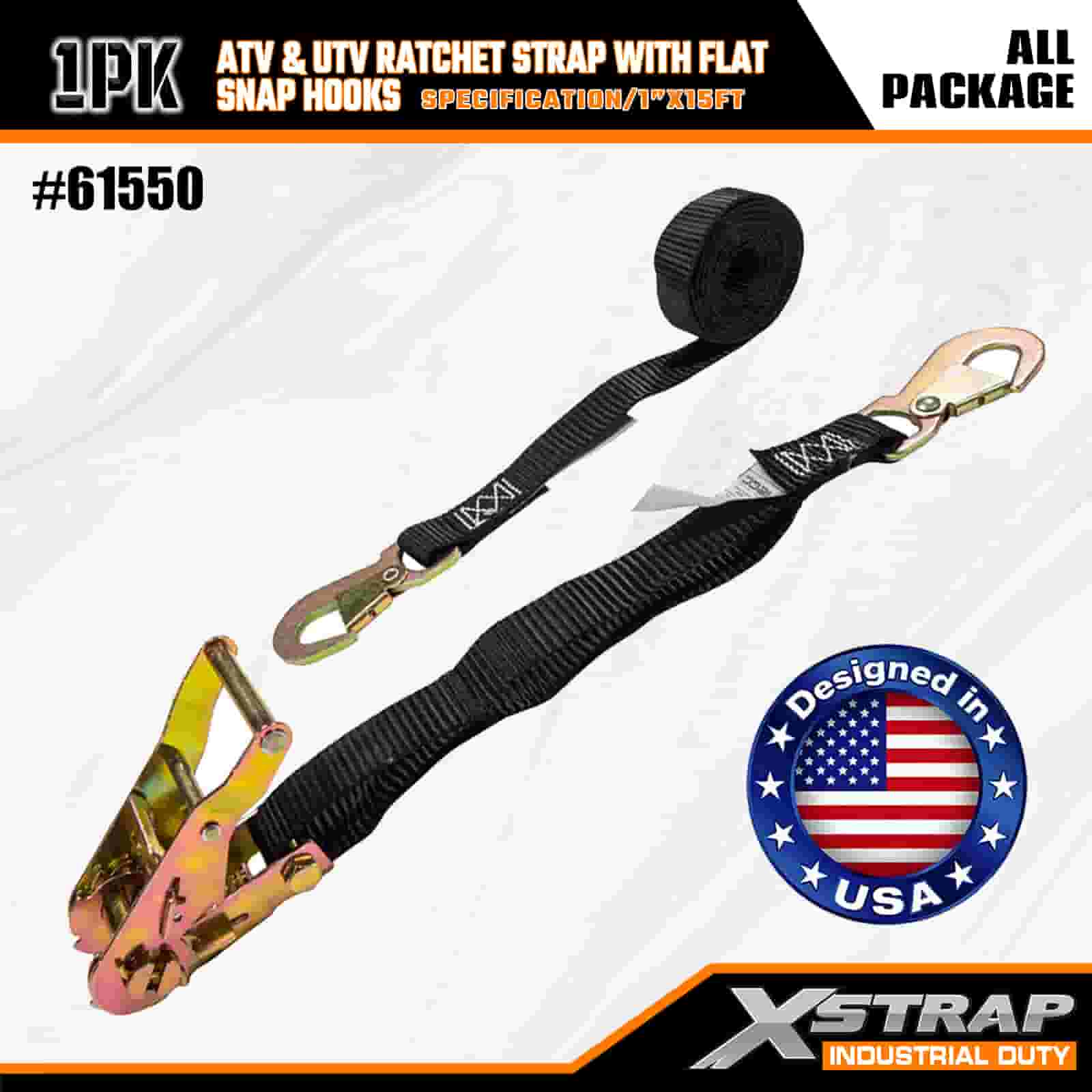 Xstrap ATV & AUV ラチェット ストラップ フラット スナップ フック付き、1 インチ x 15 フィート ポリエステル製タイダウン ストラップ ラチェット ストラップ、耐荷重 1000 ポンドの貨物ラッシング固定ストラップ、フラット スナップ付き、トレーラー、フラット ベッド トレーラー スキー ボート、小型車、重機用。