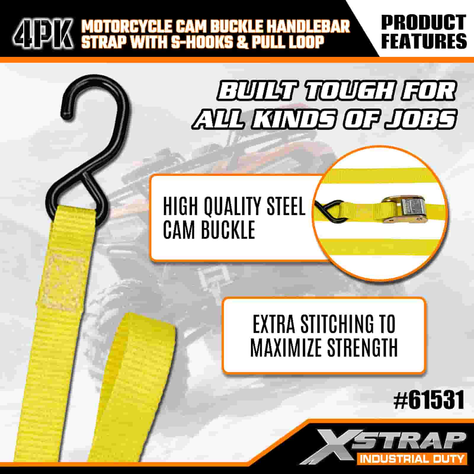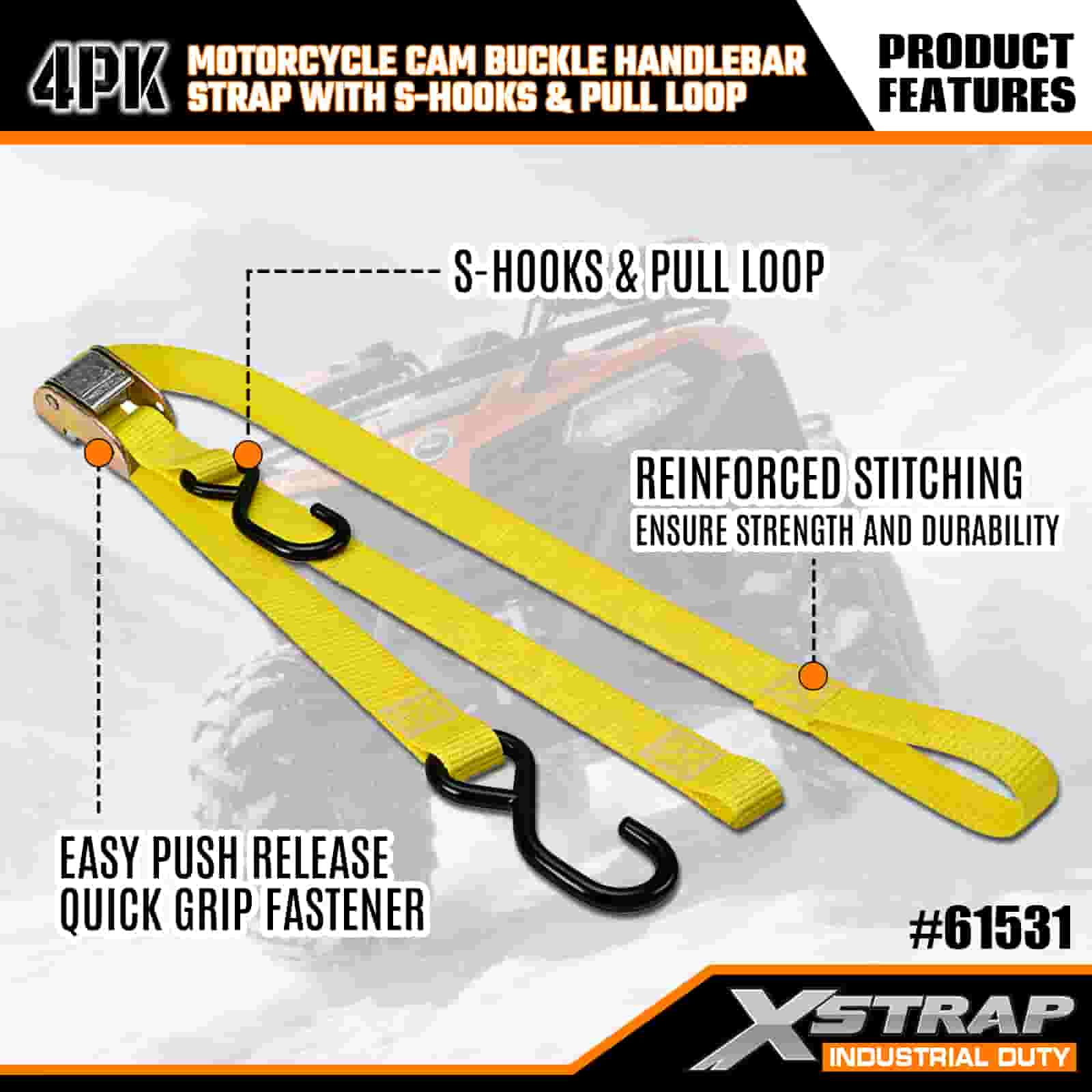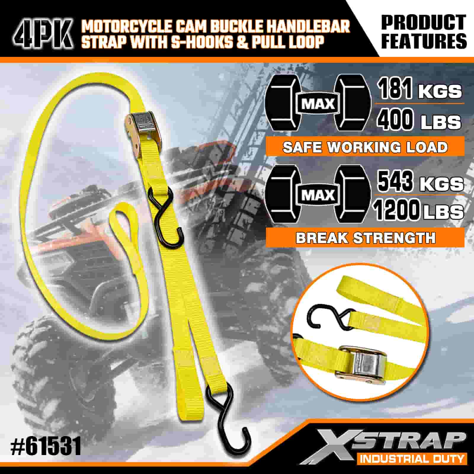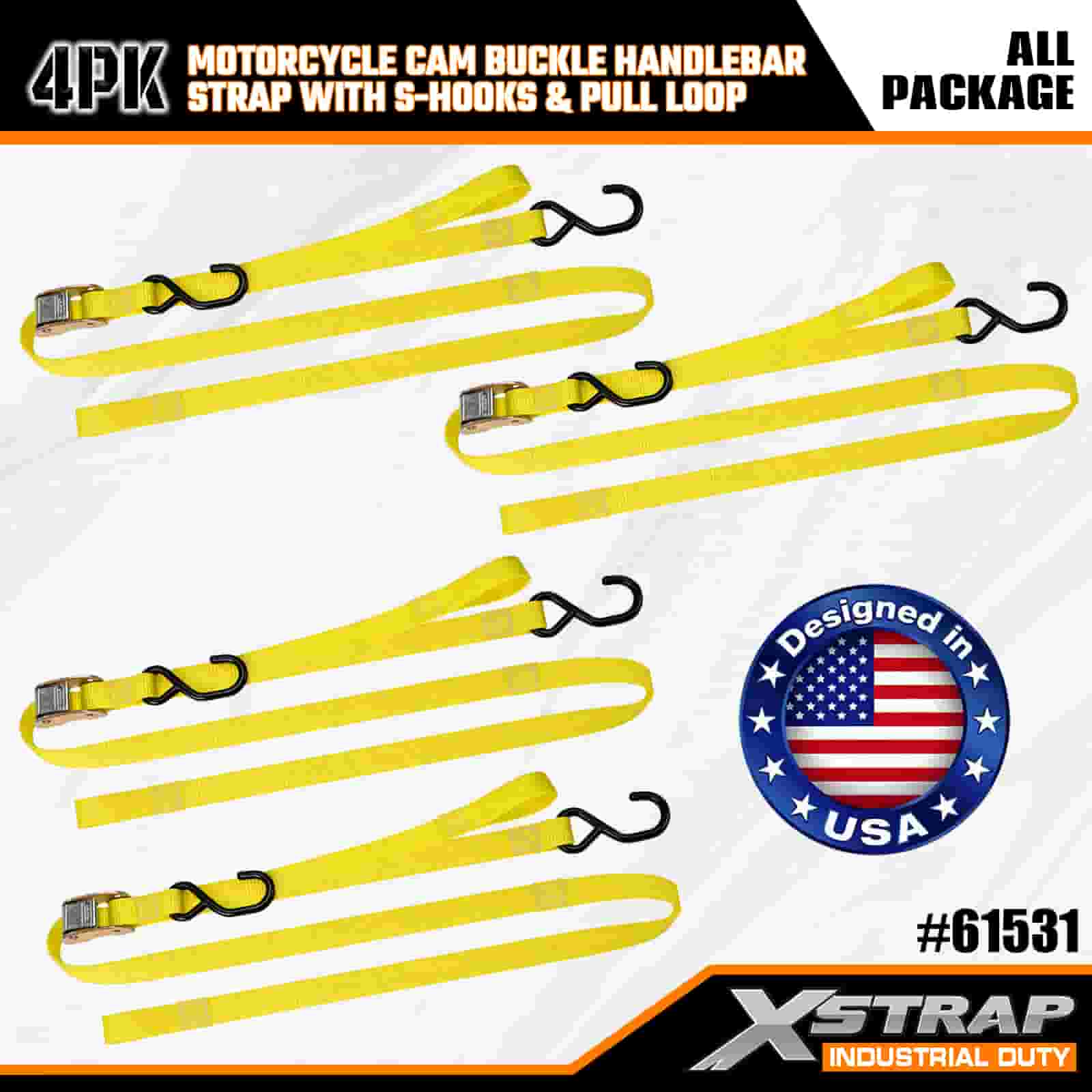 Xstrap 4PK オートバイ用カムバックルハンドルバーストラップ Sフック&プルループ付き 1インチ x 6フィート ポリエステルタイダウンストラップ プルカムバックルストラップ 耐荷重400ポンド カーゴラッシング固定ストラップ Sフック付き 本格的なプロフェッショナルが貨物トレーラー、フラットベッドトレーラー、スキーボート、小型車を固定します。
