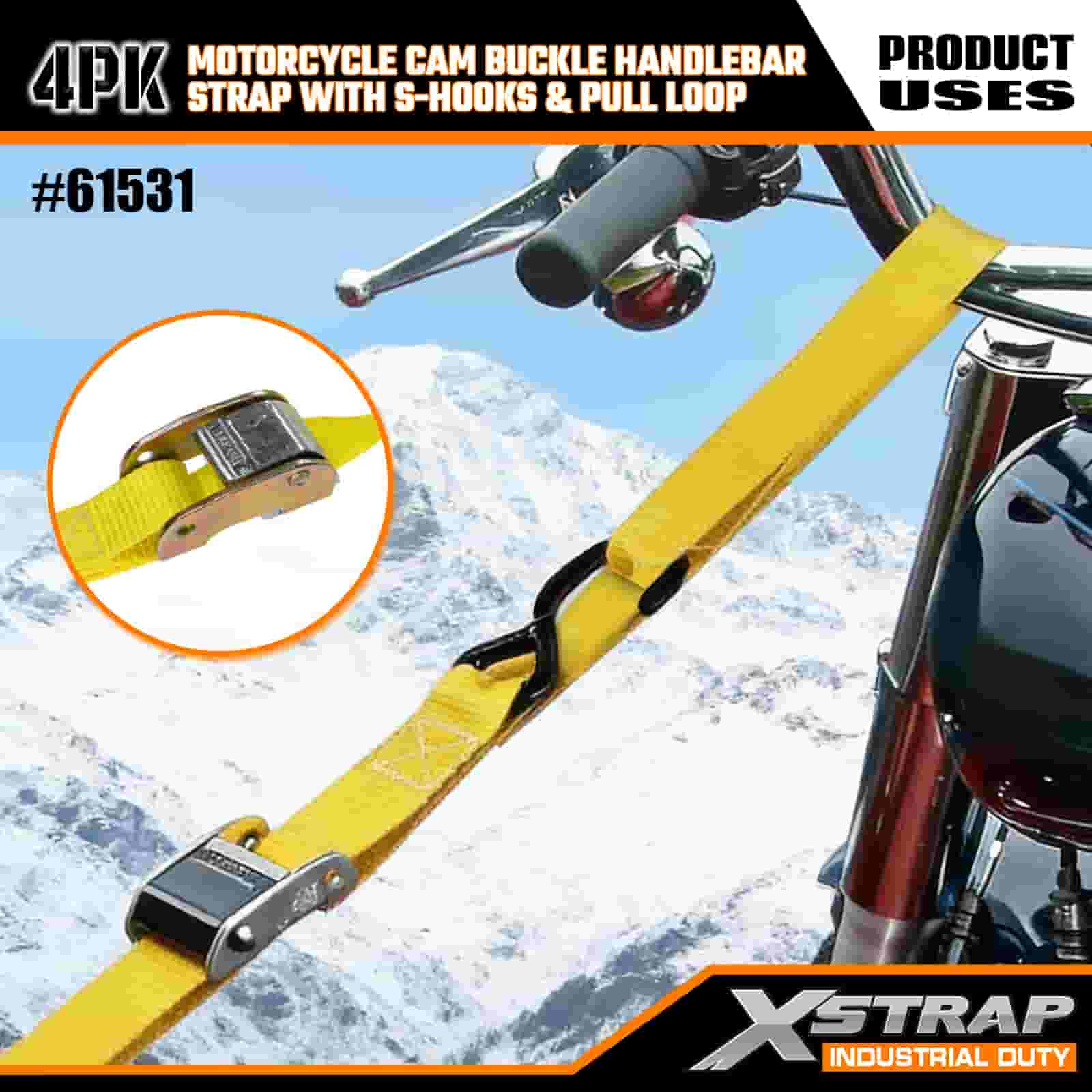 - オートバイ用6フィートストラップ4本パック: 4本ストラップセット(幅1インチ×長さ6フィート)として販売されており、オートバイ、ハンドルバー、小型ギアをトラックの荷台や輸送中に固定するのに最適です。