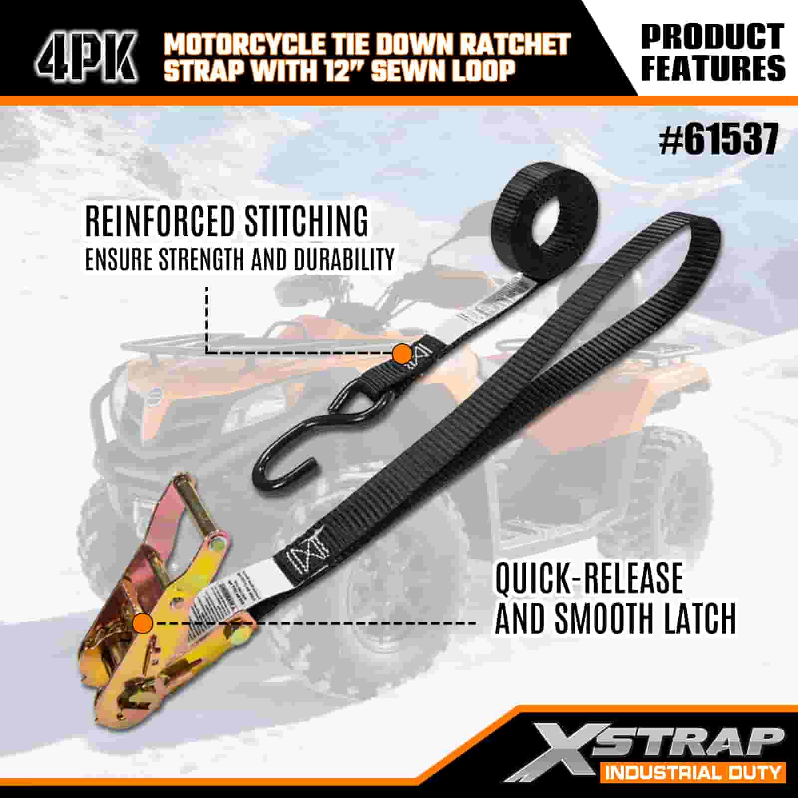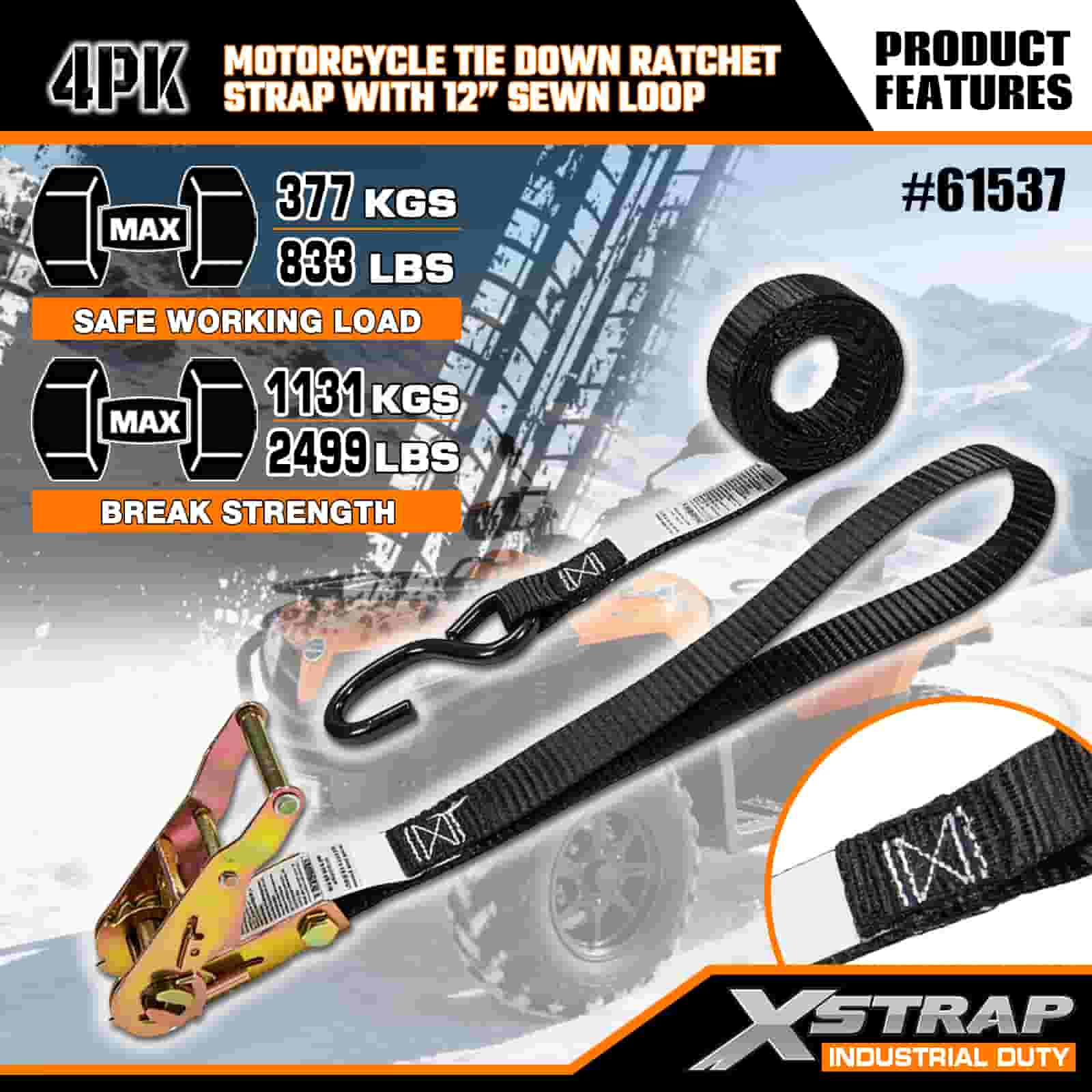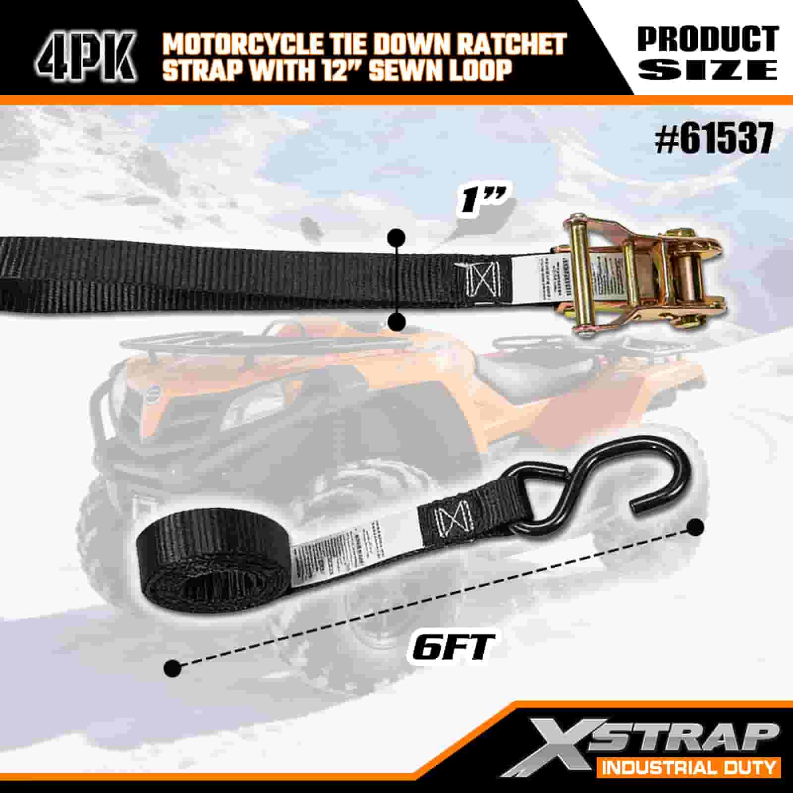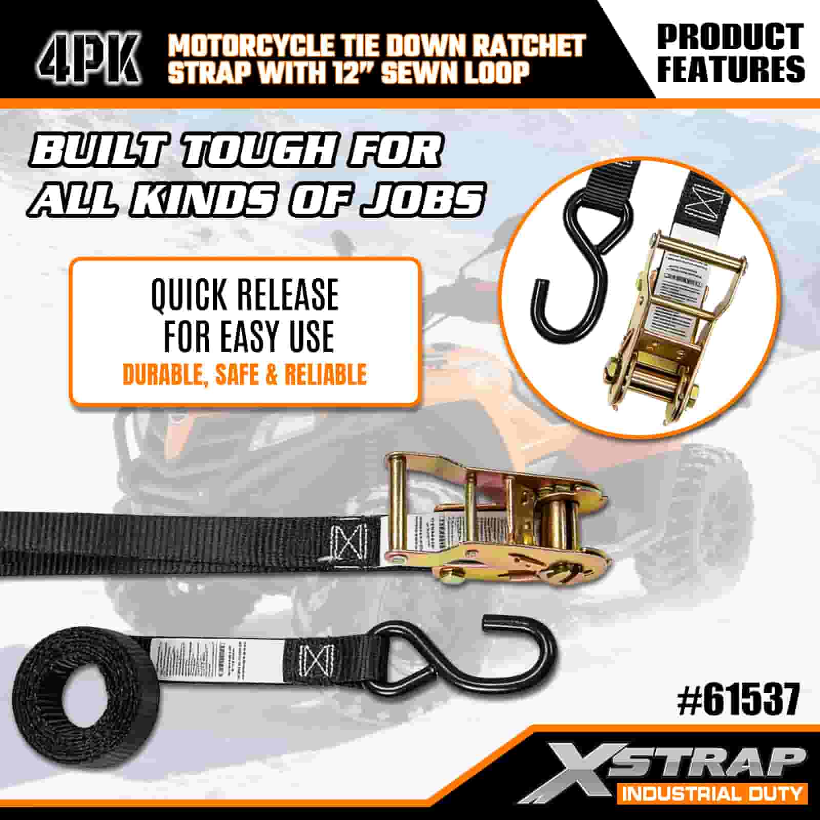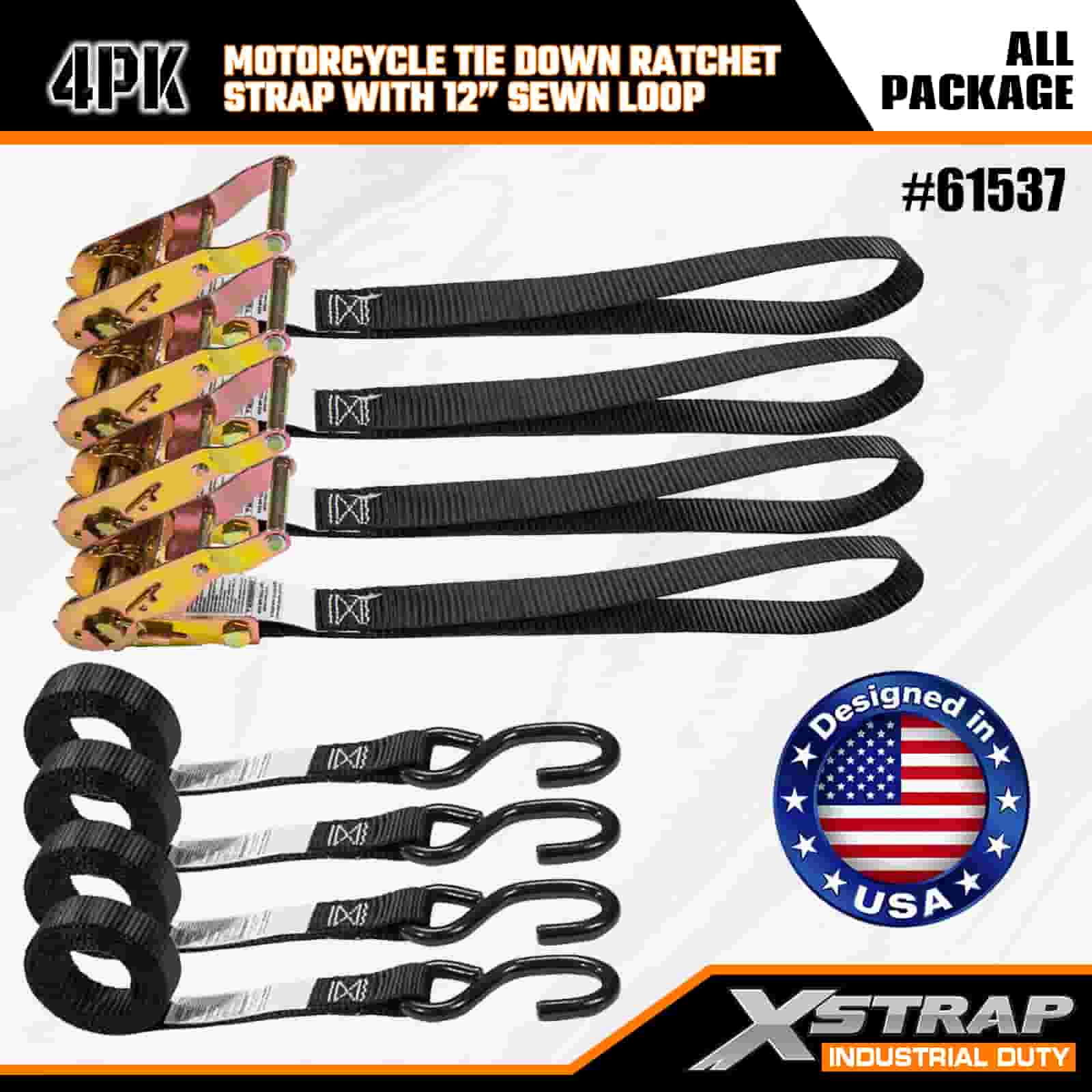 Xstrap 4PK オートバイタイダウンラチェットストラップ、12インチの縫い付けループ付き、1インチ x 6フィートのポリエステル製タイダウンストラッププルラチェットストラップ、833ポンドの耐荷重カーゴラッシング固定ストラップ、Sフック付き、本格的なプロフェッショナルが貨物トレーラー、フラットベッドトレーラー、スキーボート、小型車を固定します。