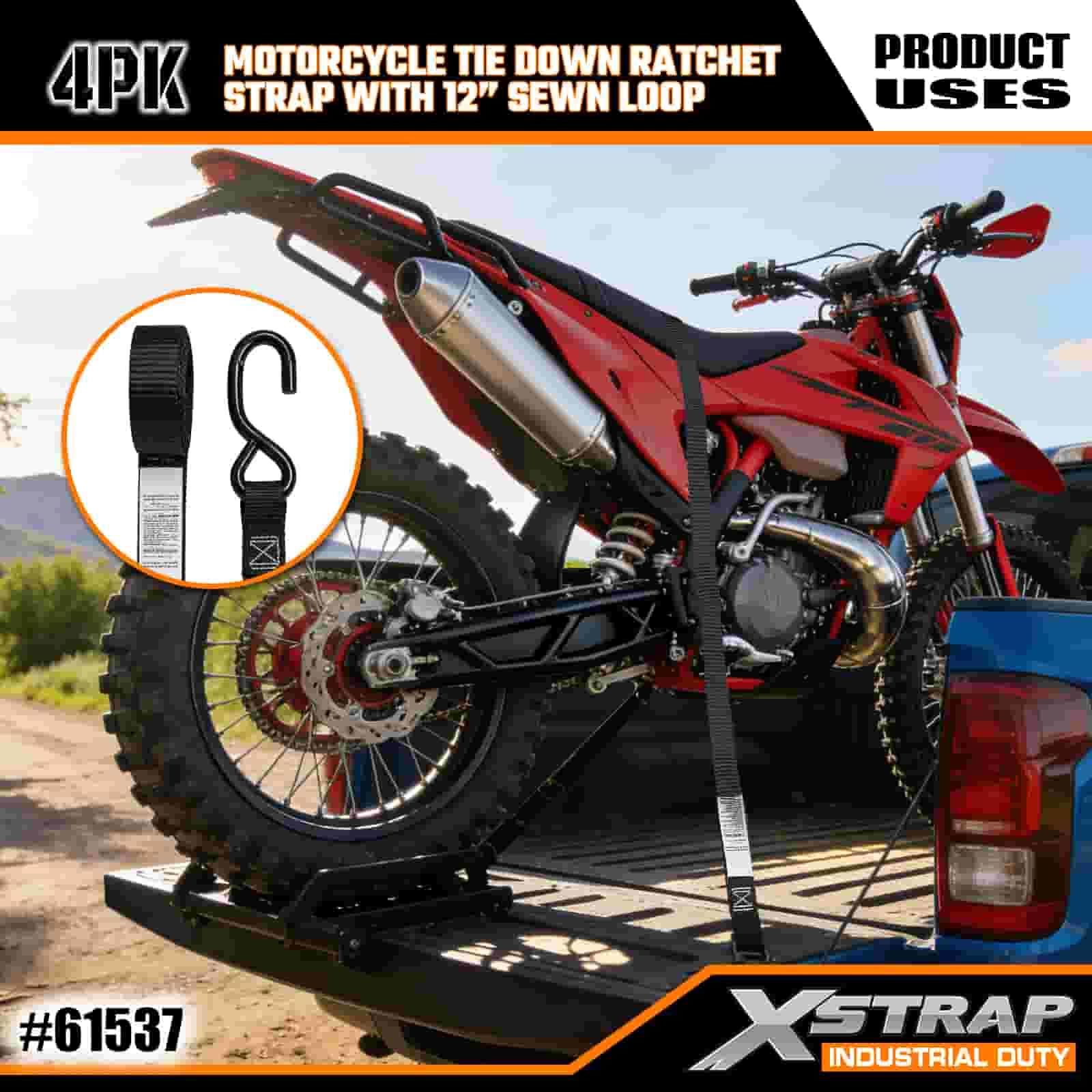 - オートバイ固定用6フィートストラップ4本パック: 4本ストラップセット(幅1インチ×長さ6フィート)として販売されており、オートバイ、ATV、小型ギアをトラックの荷台や輸送中に固定するのに最適です。