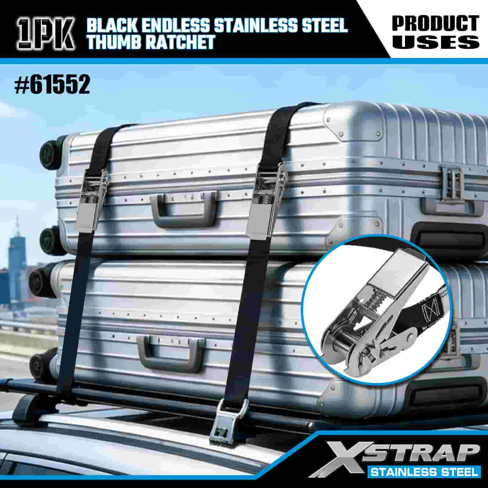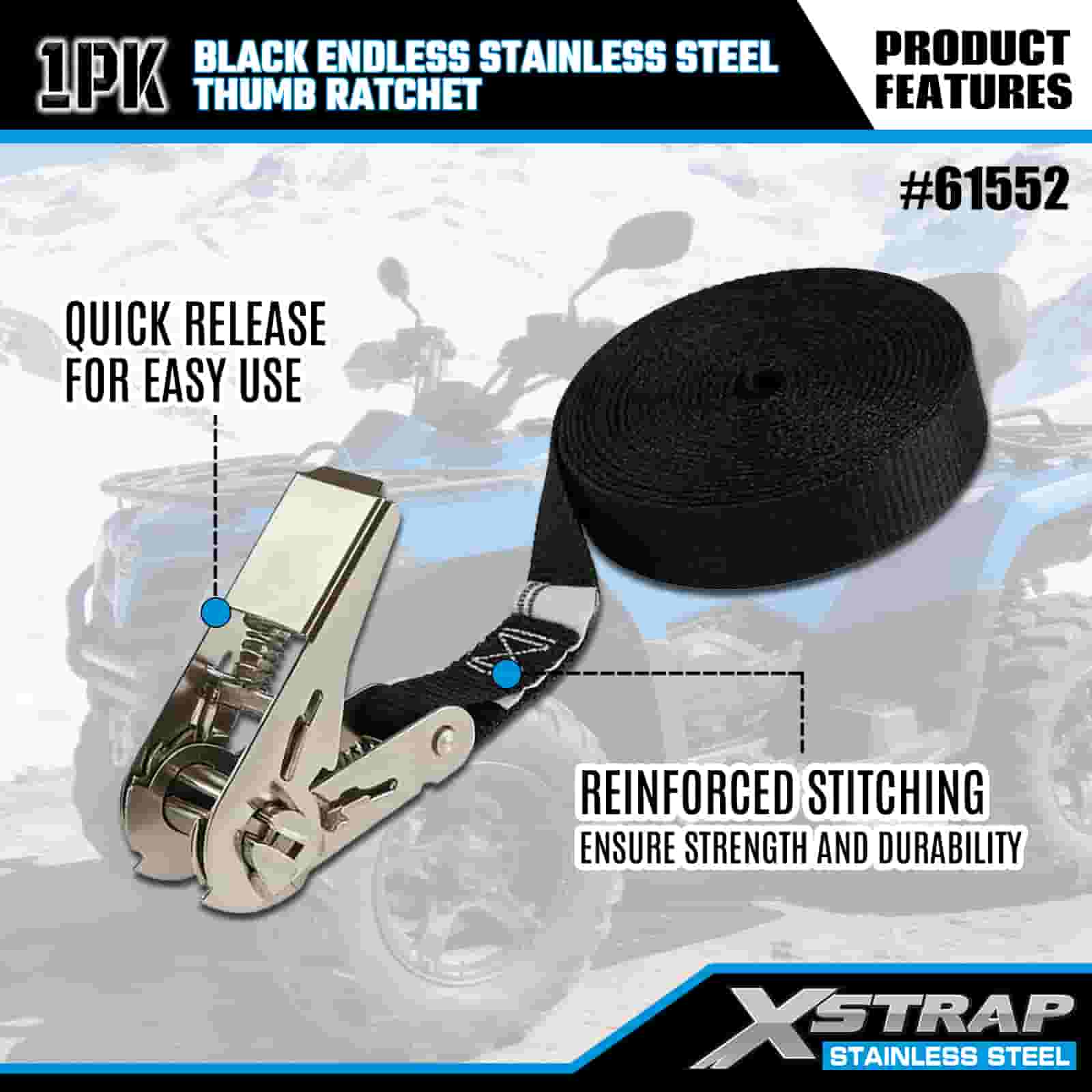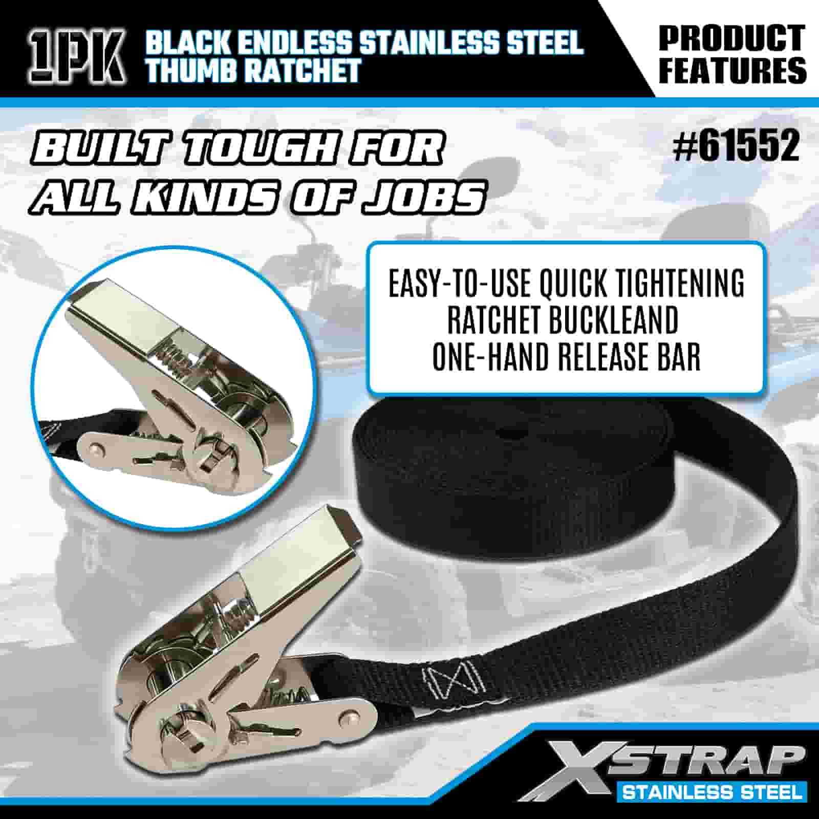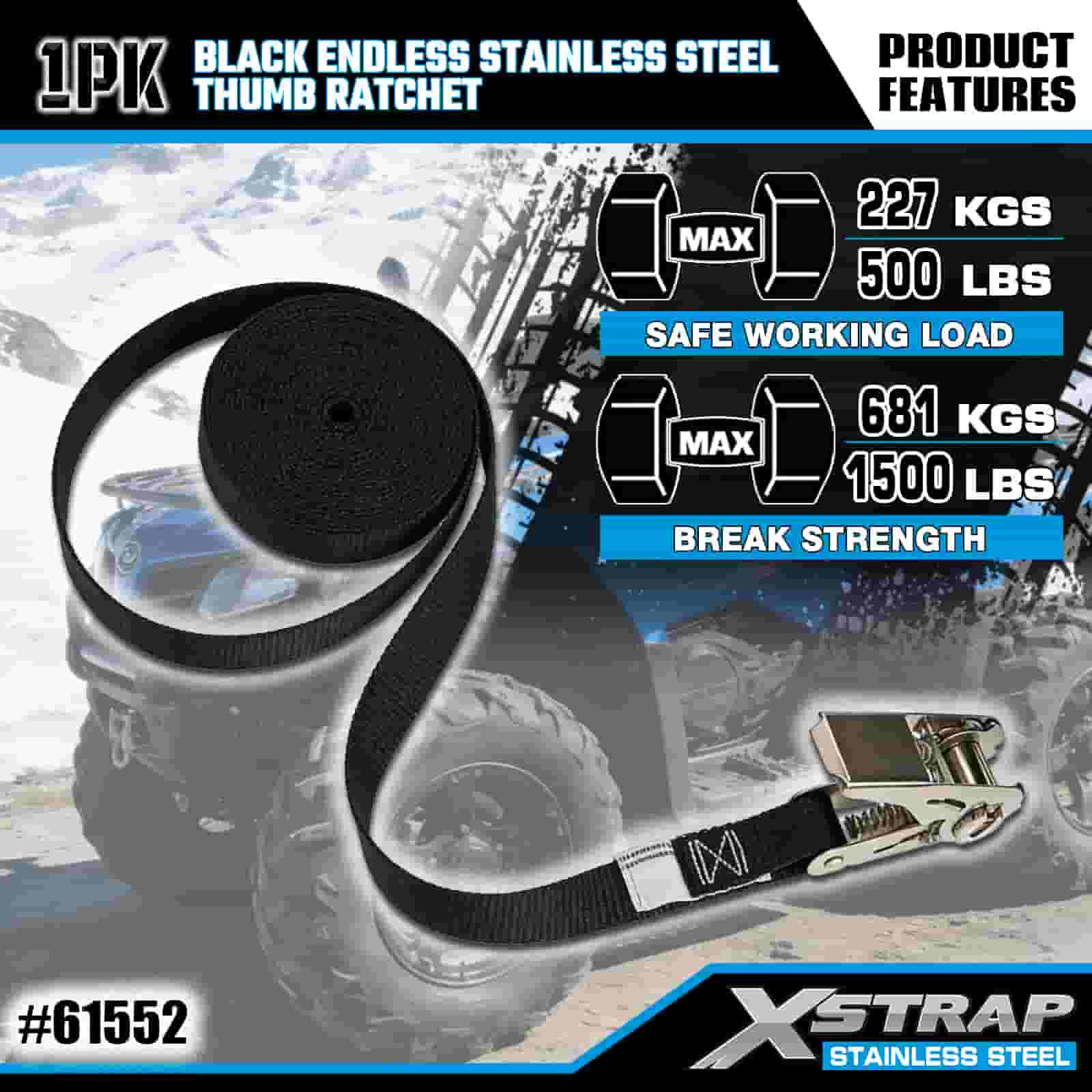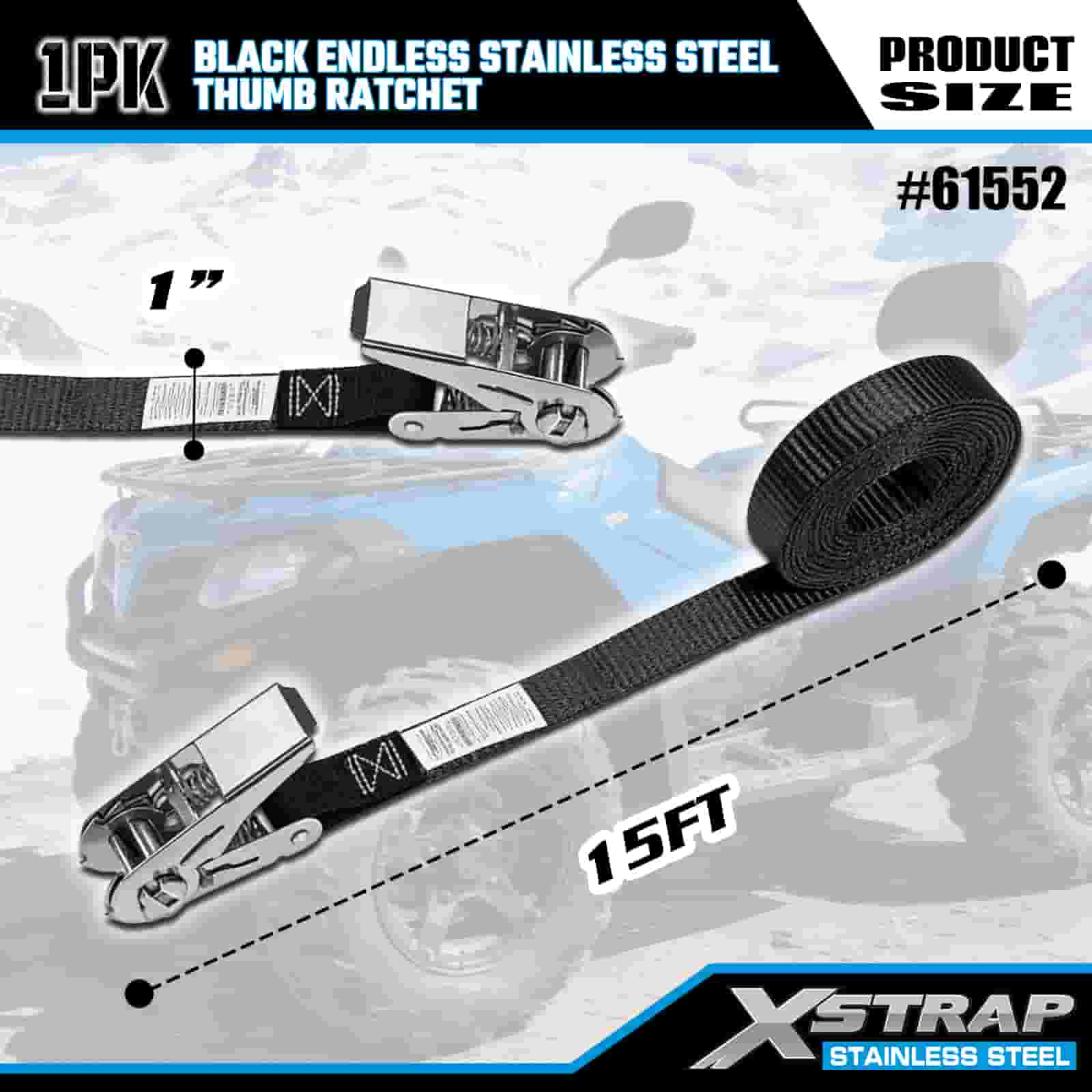 Xstrap ブラックエンドレスステンレススチールサムラチェット、1インチ x 15フィートポリエステルタイダウンストラップラチェットストラップ、耐荷重500ポンドの貨物ラッシング固定ストラップ、トレーラー、フラットベッドトレーラースキーボート、小型車、重機用。