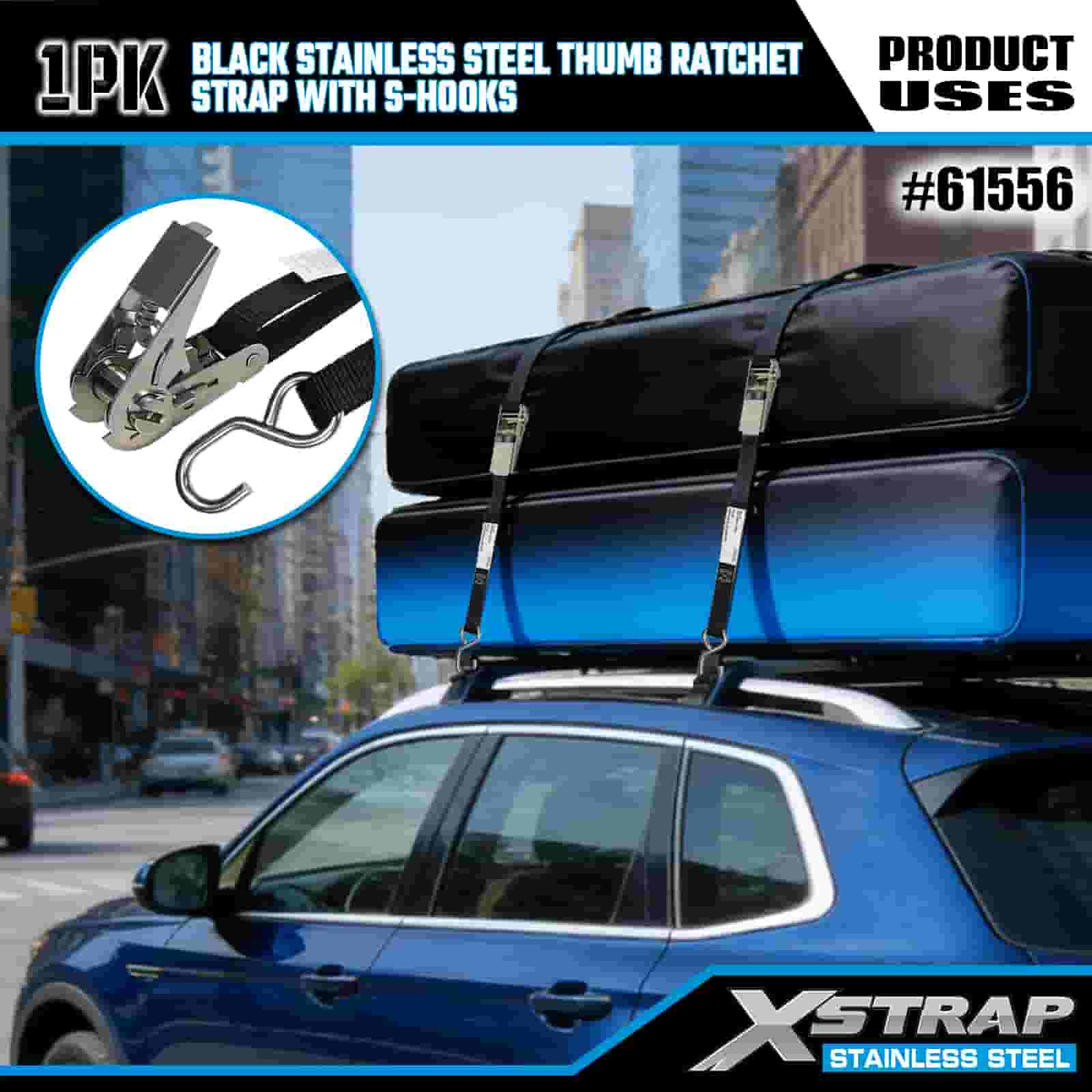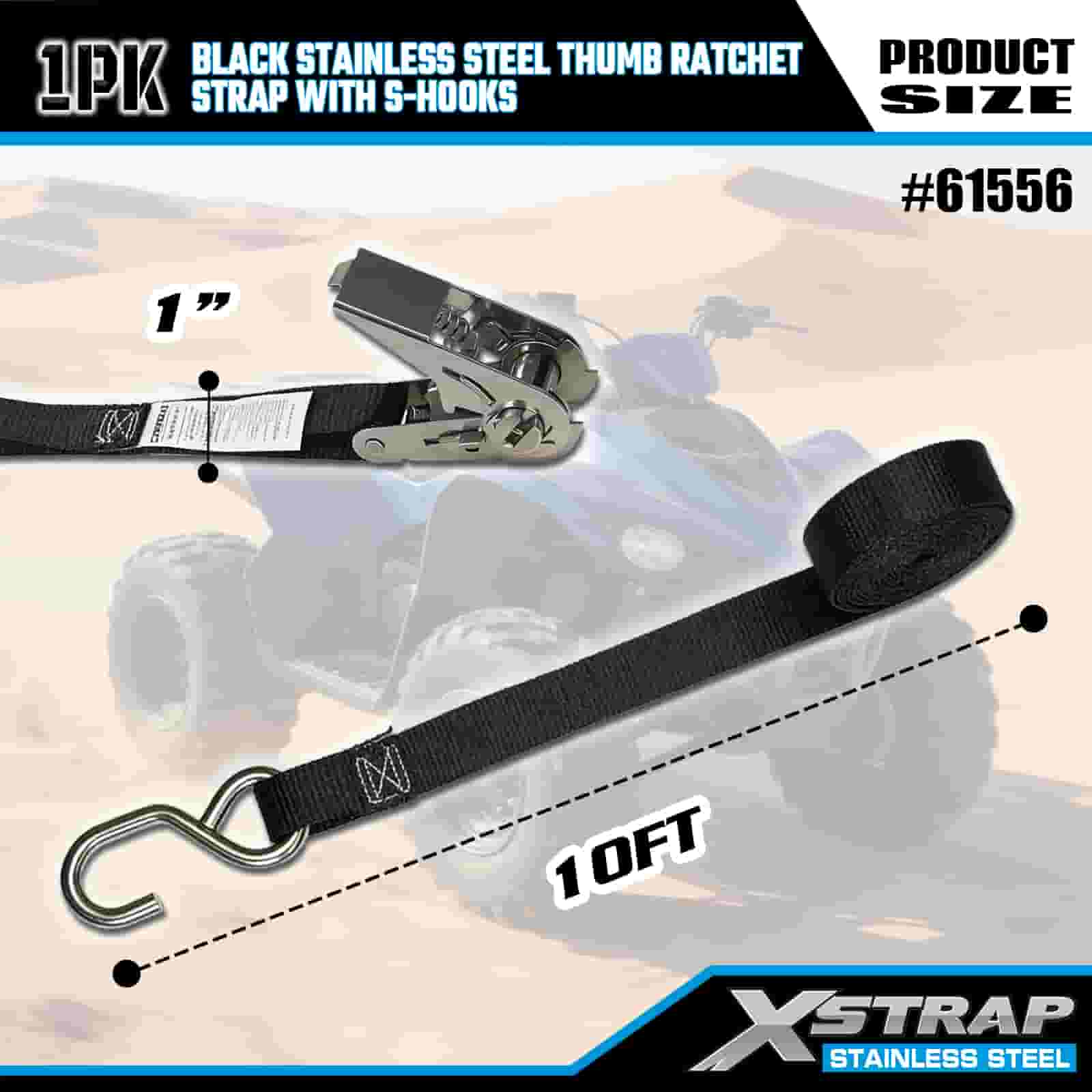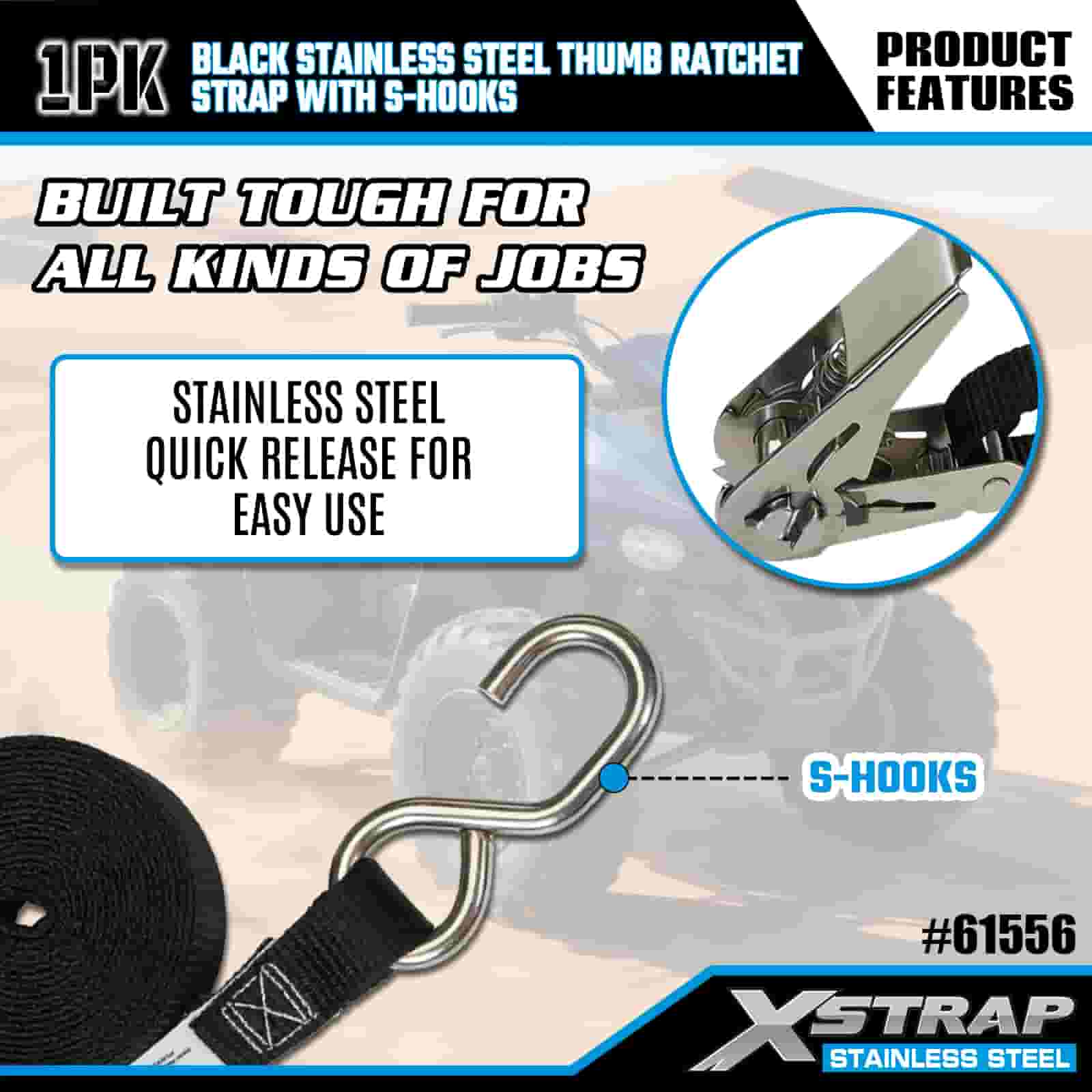 Xstrap ブラック ステンレススチール サムラチェット S フック付き、1 インチ x 10 フィート ポリエステル タイダウン ストラップ ラチェット ストラップ、耐荷重 255 ポンドの貨物ラッシング固定ストラップ、S フック付き、トレーラー、フラットベッドトレーラー スキーボート、小型車、重機用。