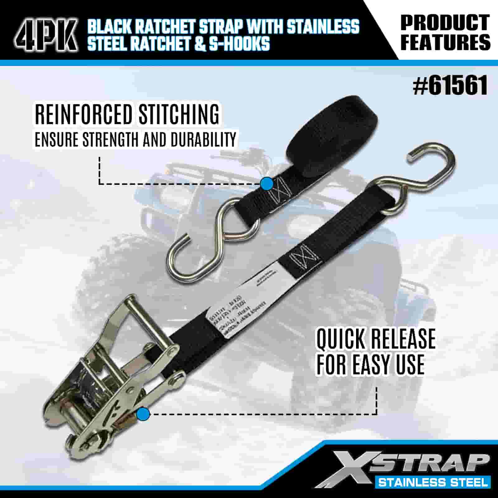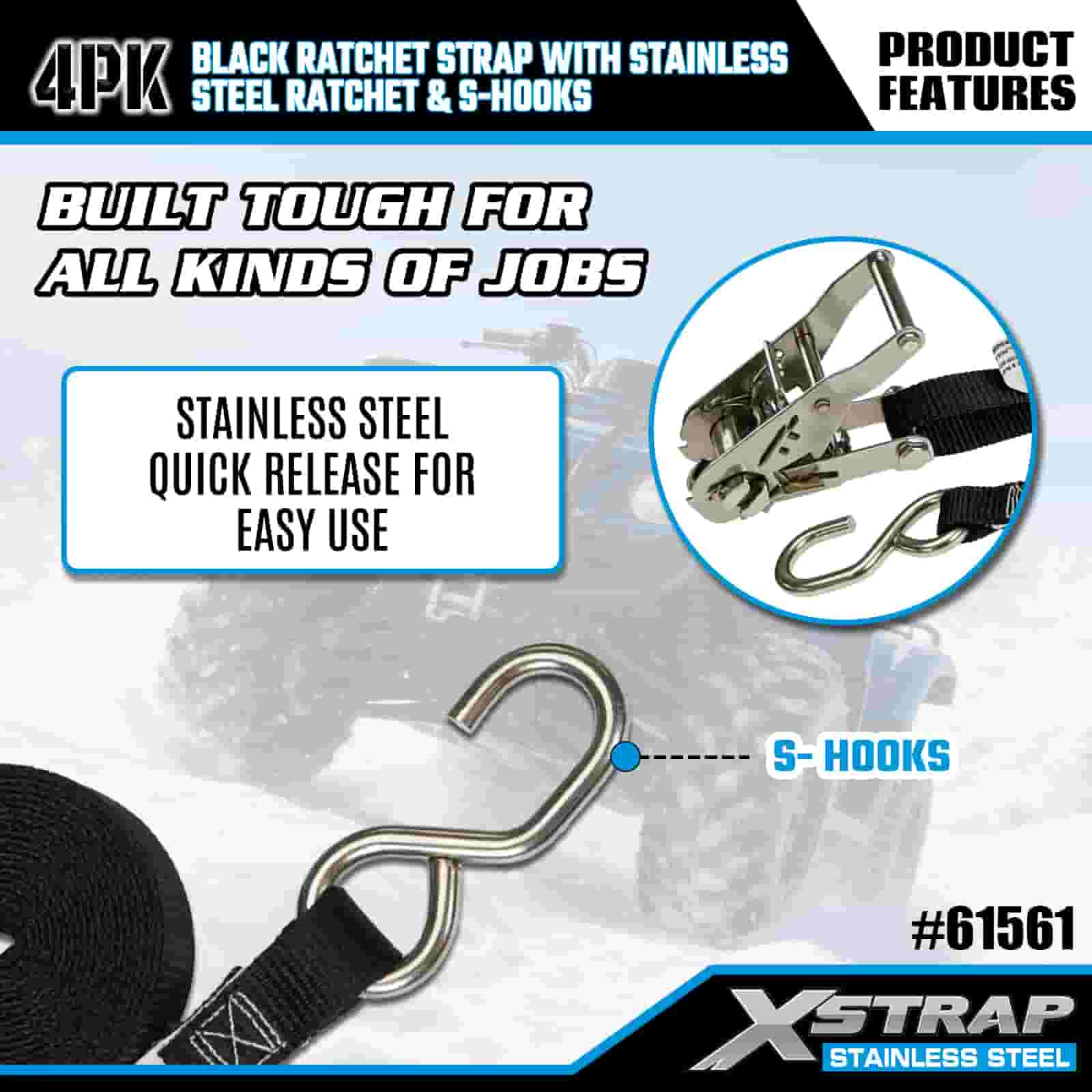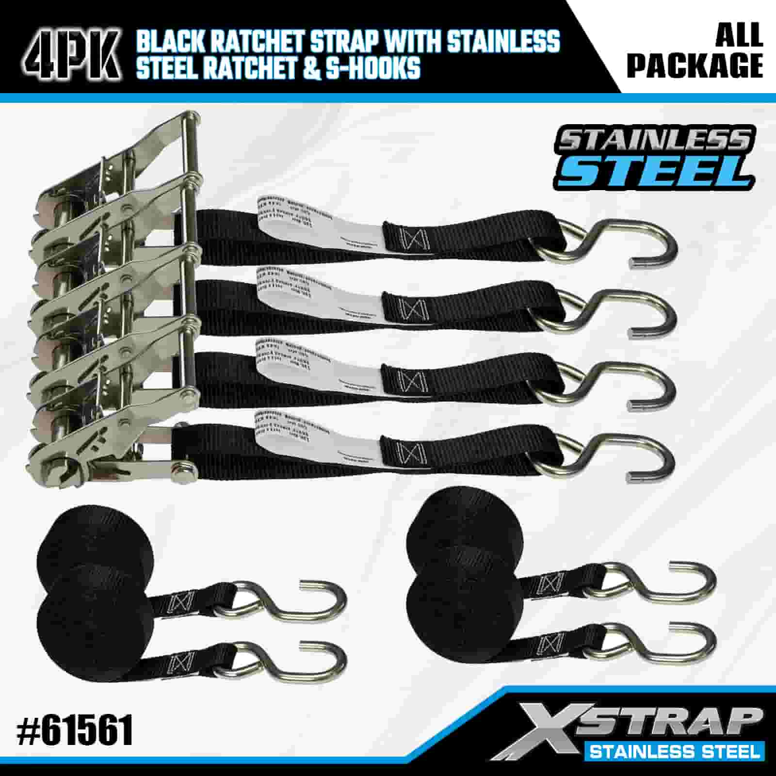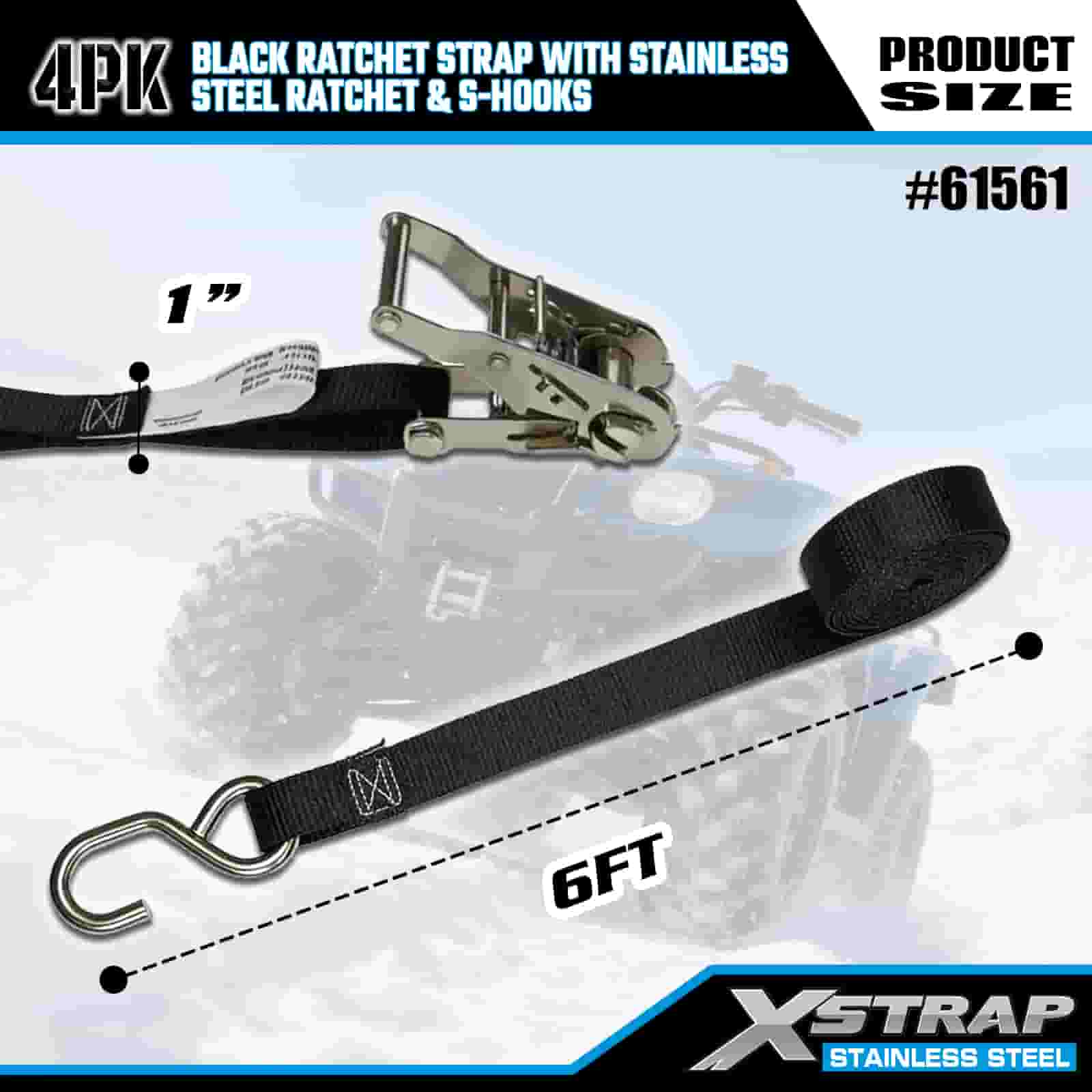 Xstrap 4PK ブラック ラチェット ストラップ ステンレススチール ラチェットと S フック付き、1 インチ x 6 フィート ポリエステル タイダウン ストラップ ラチェット ストラップ、耐荷重 400 ポンドの貨物ラッシング固定ストラップ、S フック付き、トレーラー、フラットベッドトレーラー スキーボート、小型車、重機用。