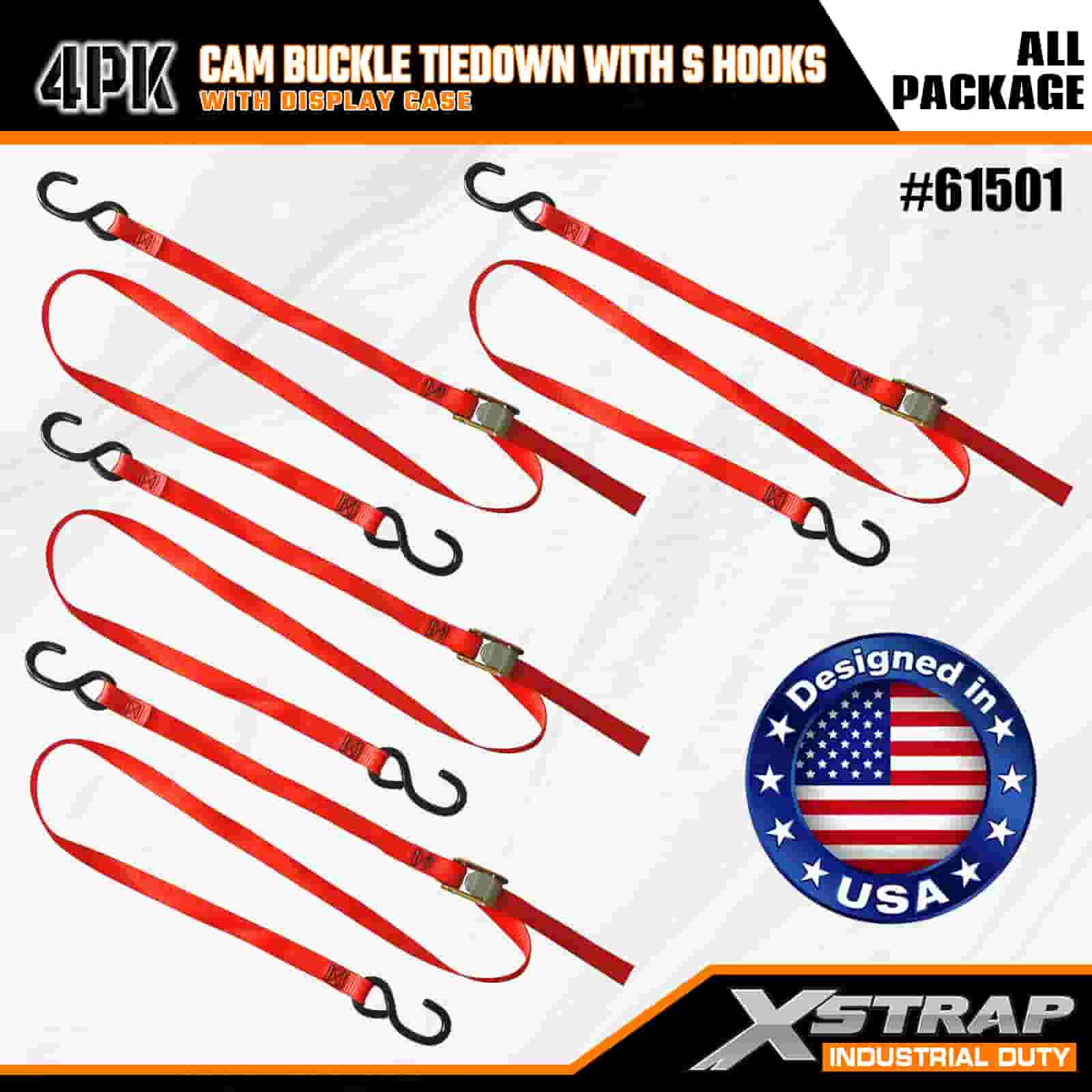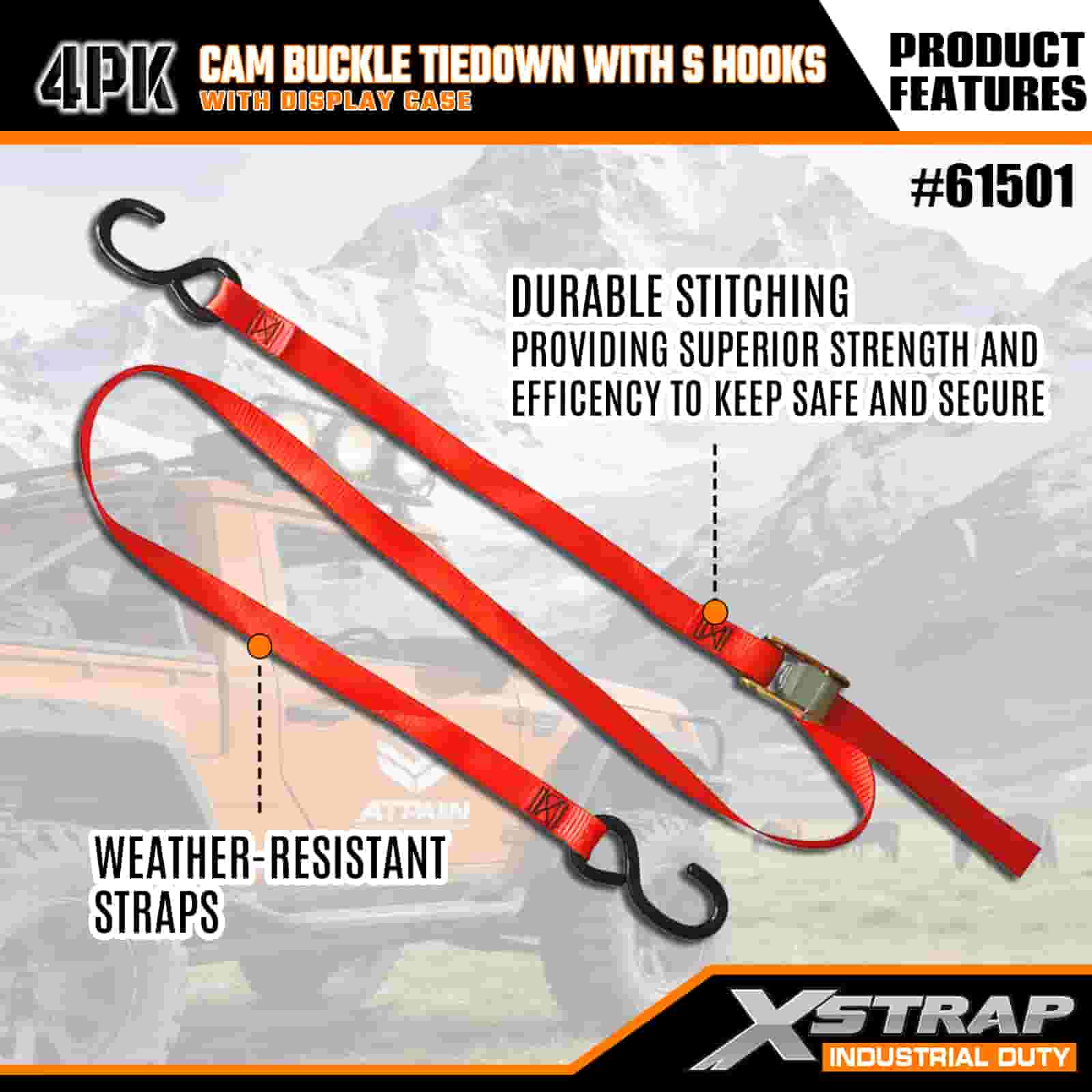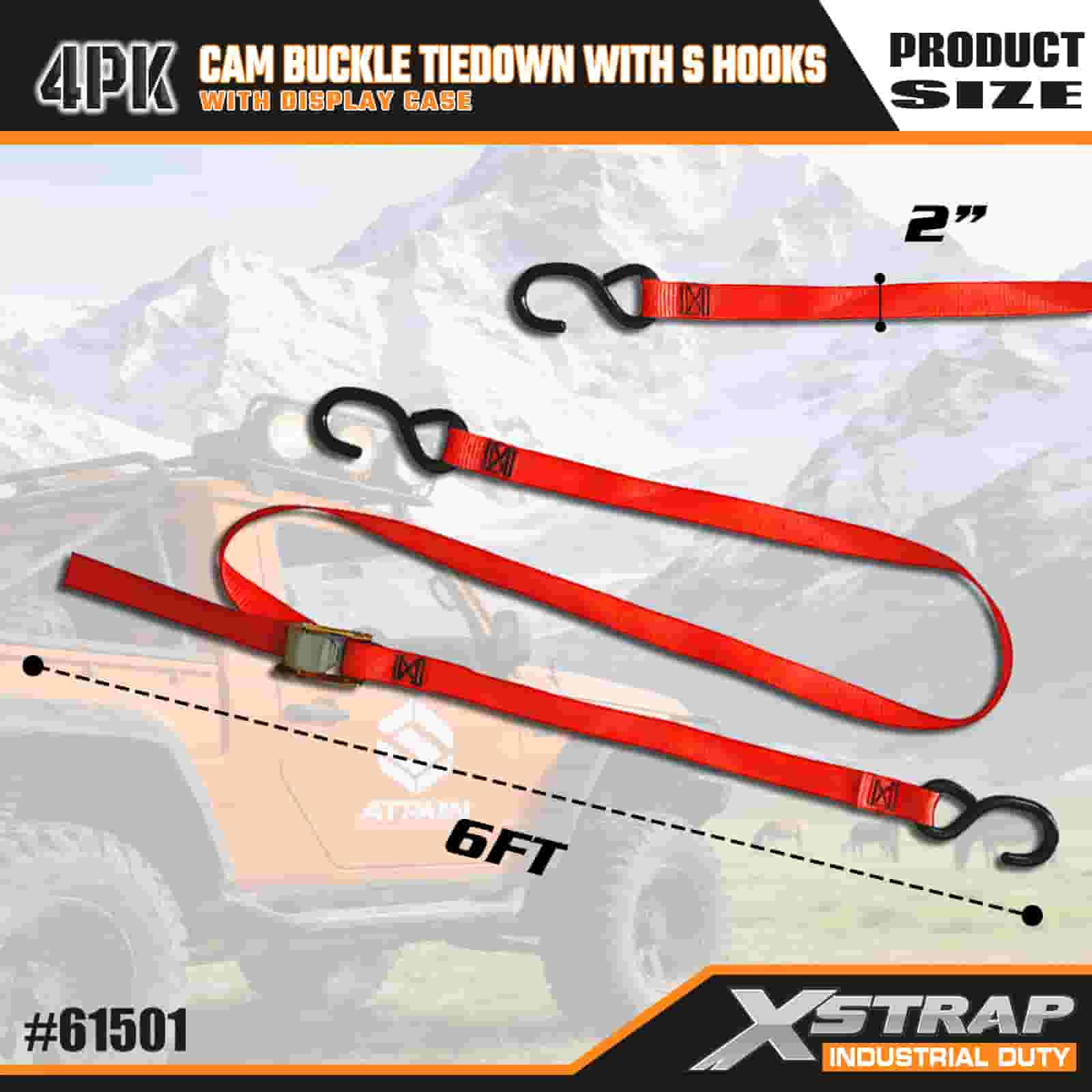 Xstrap 4パック カムバックルタイダウン Sフック付き、2インチ x 6フィート カムバックル付きポリエステルタイダウンストラップ、耐荷重400ポンドのカーゴラッシング固定ストラップ、Sフック付き、本格的なプロフェッショナルが貨物トレーラー、フラットベッドトレーラー、スキーボート、小型車を固定します。