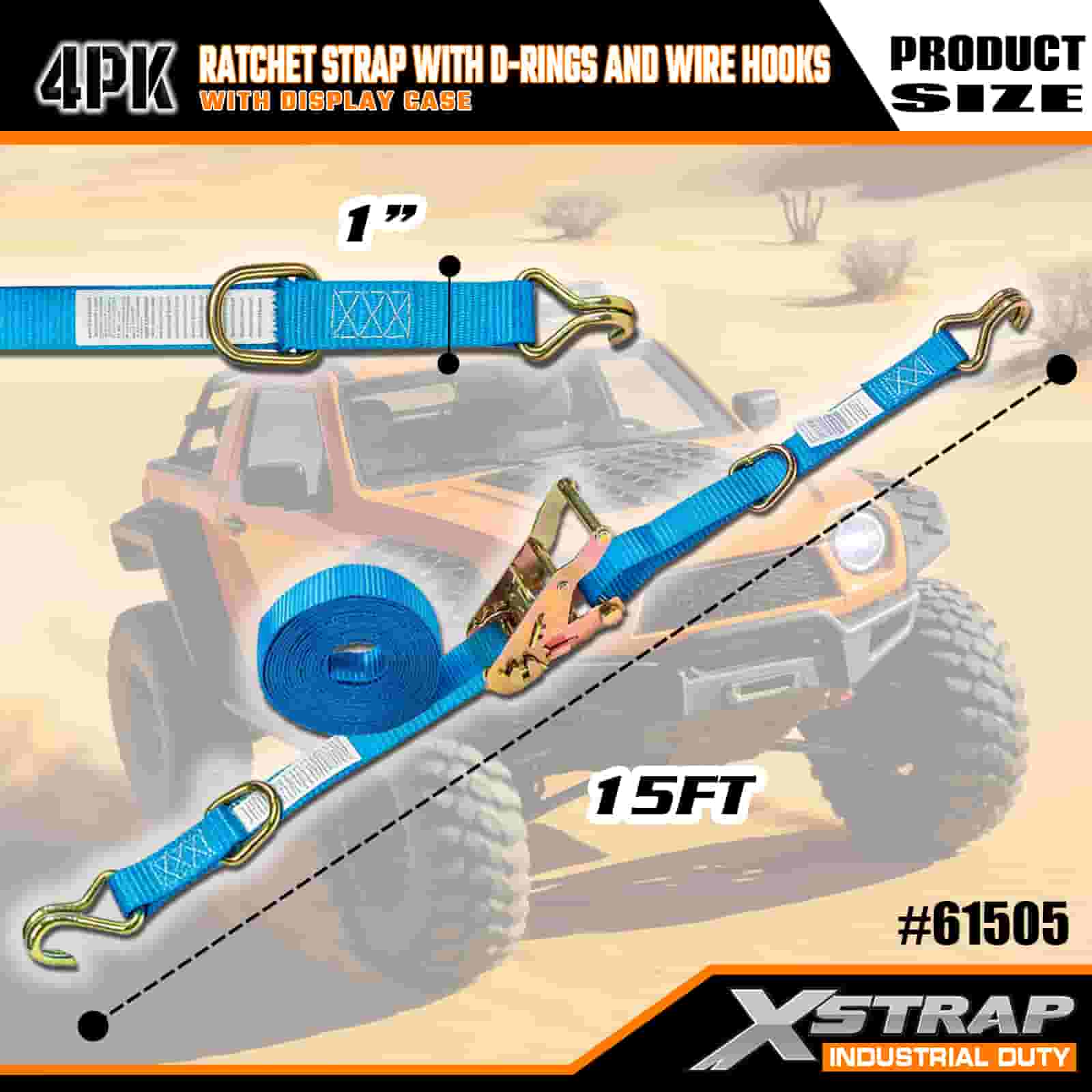 1 インチ x 15 フィート 4PK ラチェット ストラップ、D リングとワイヤー フック付き