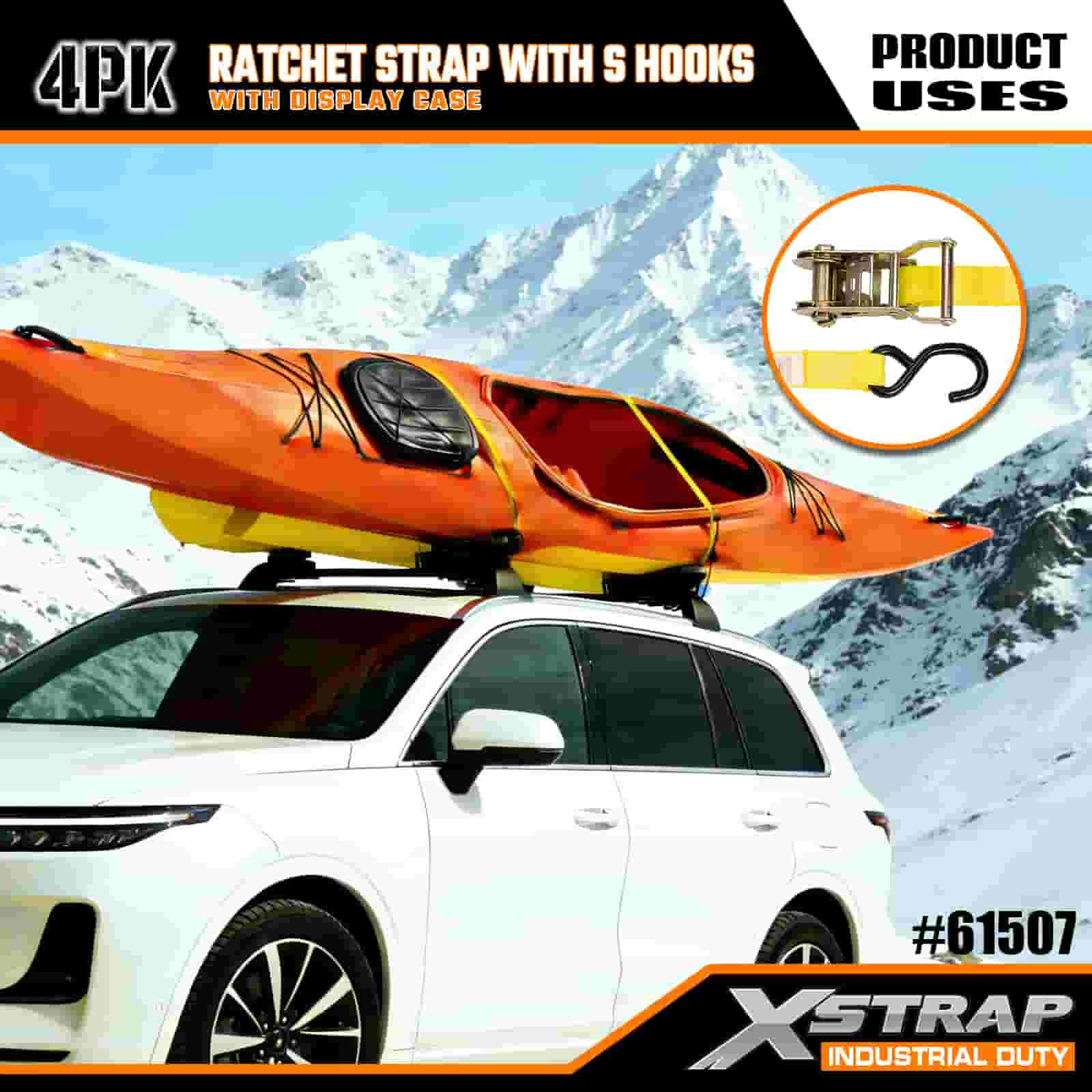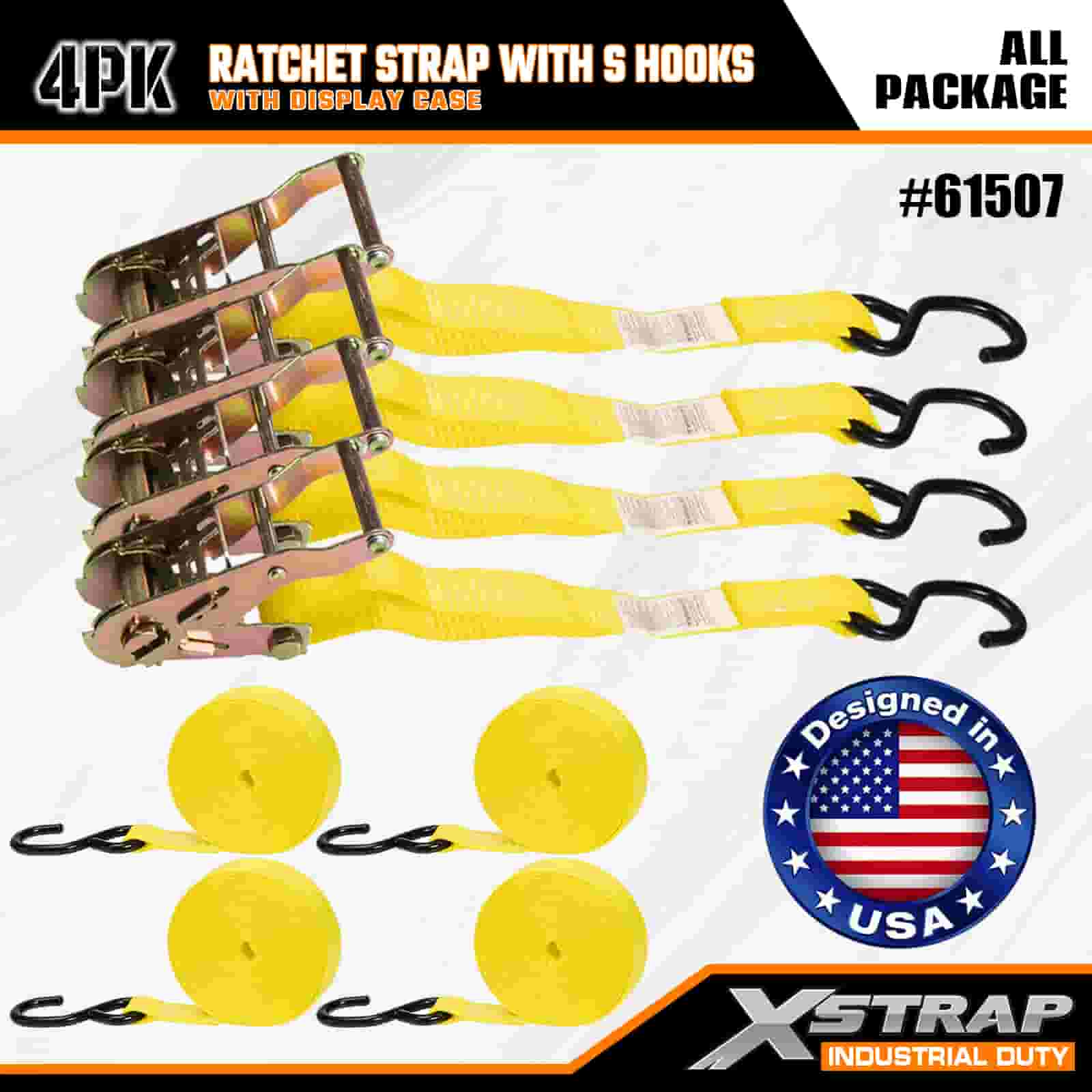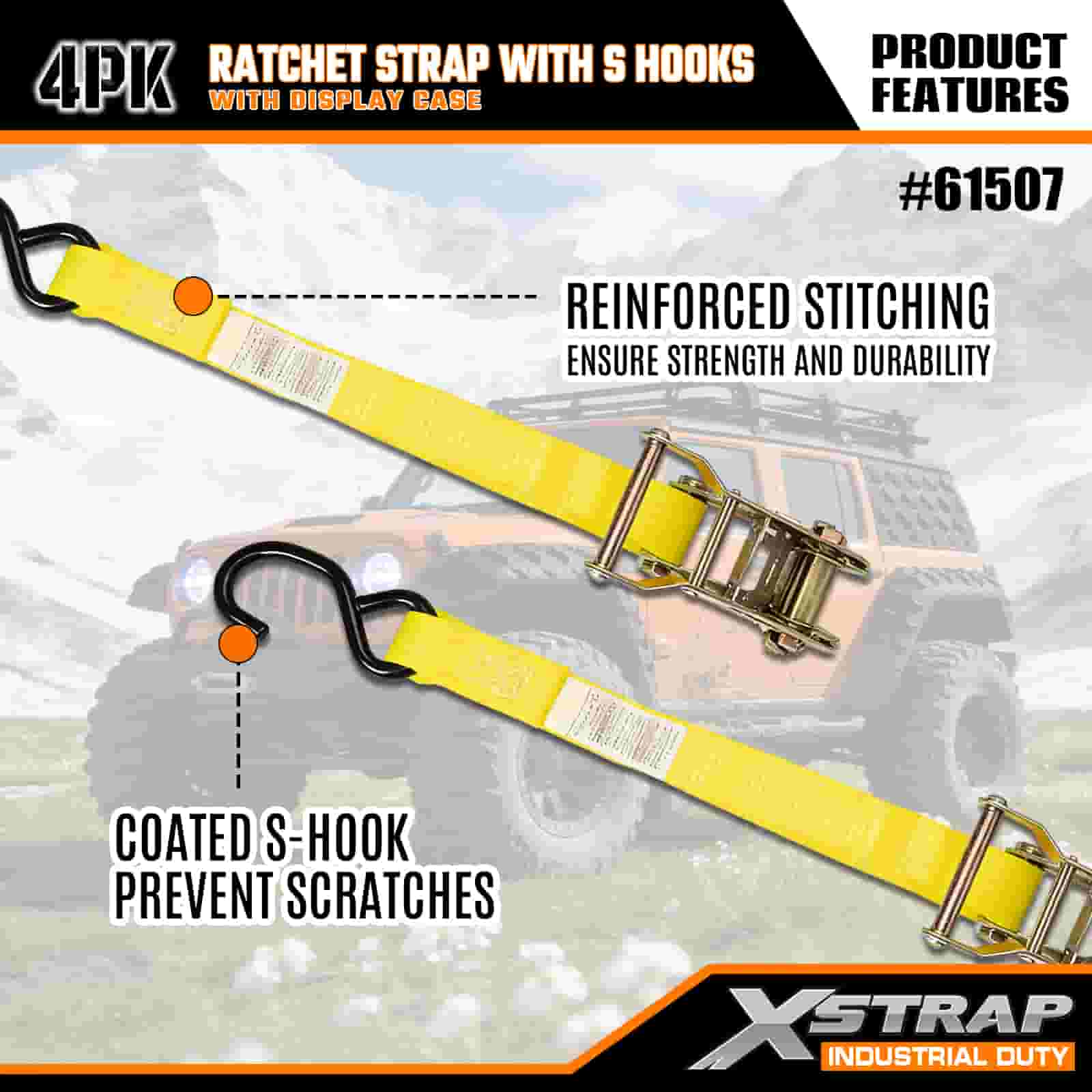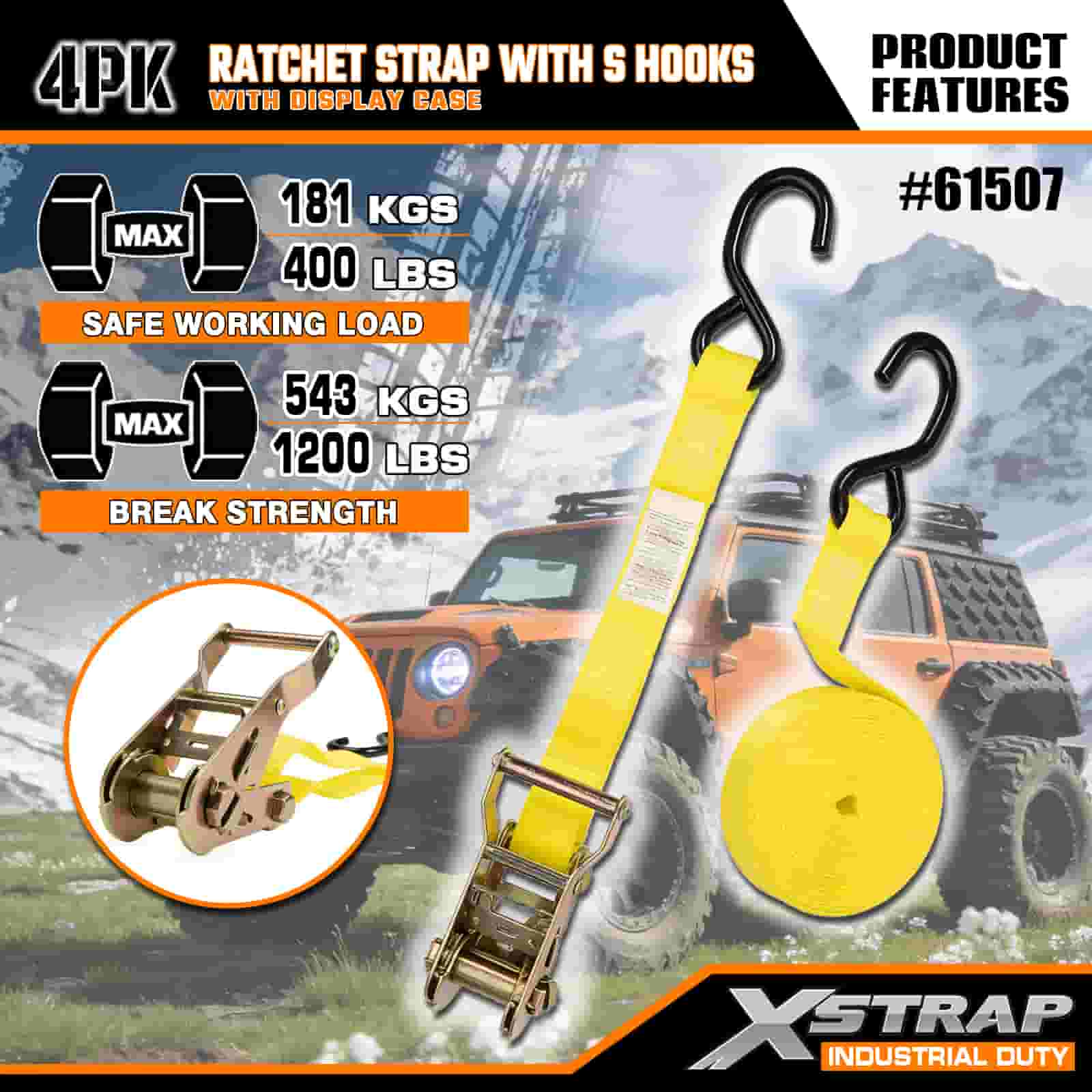 Xstrap 4パック ラチェットストラップ Sフック付き 1インチ x 15フィート ポリエステル タイダウンストラップ プルラチェットストラップ 耐荷重400ポンド カーゴラッシング固定ストラップ Sフック付き 本格的なプロフェッショナルが貨物トレーラー、フラットベッドトレーラー、スキーボート、小型車を固定します。