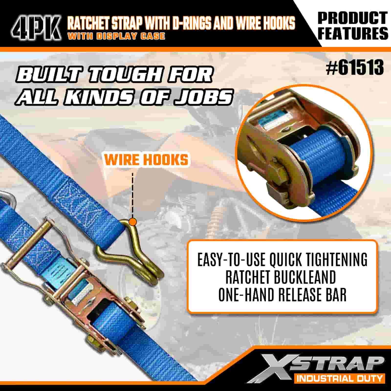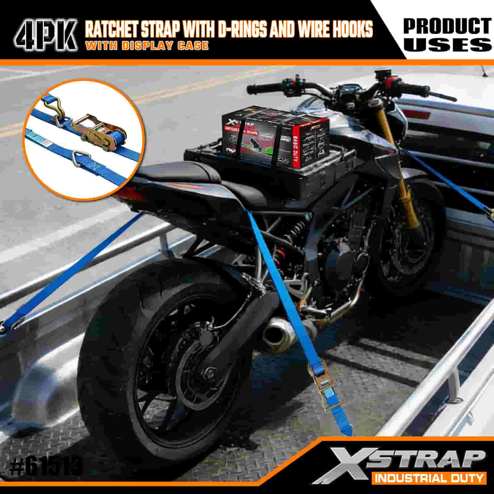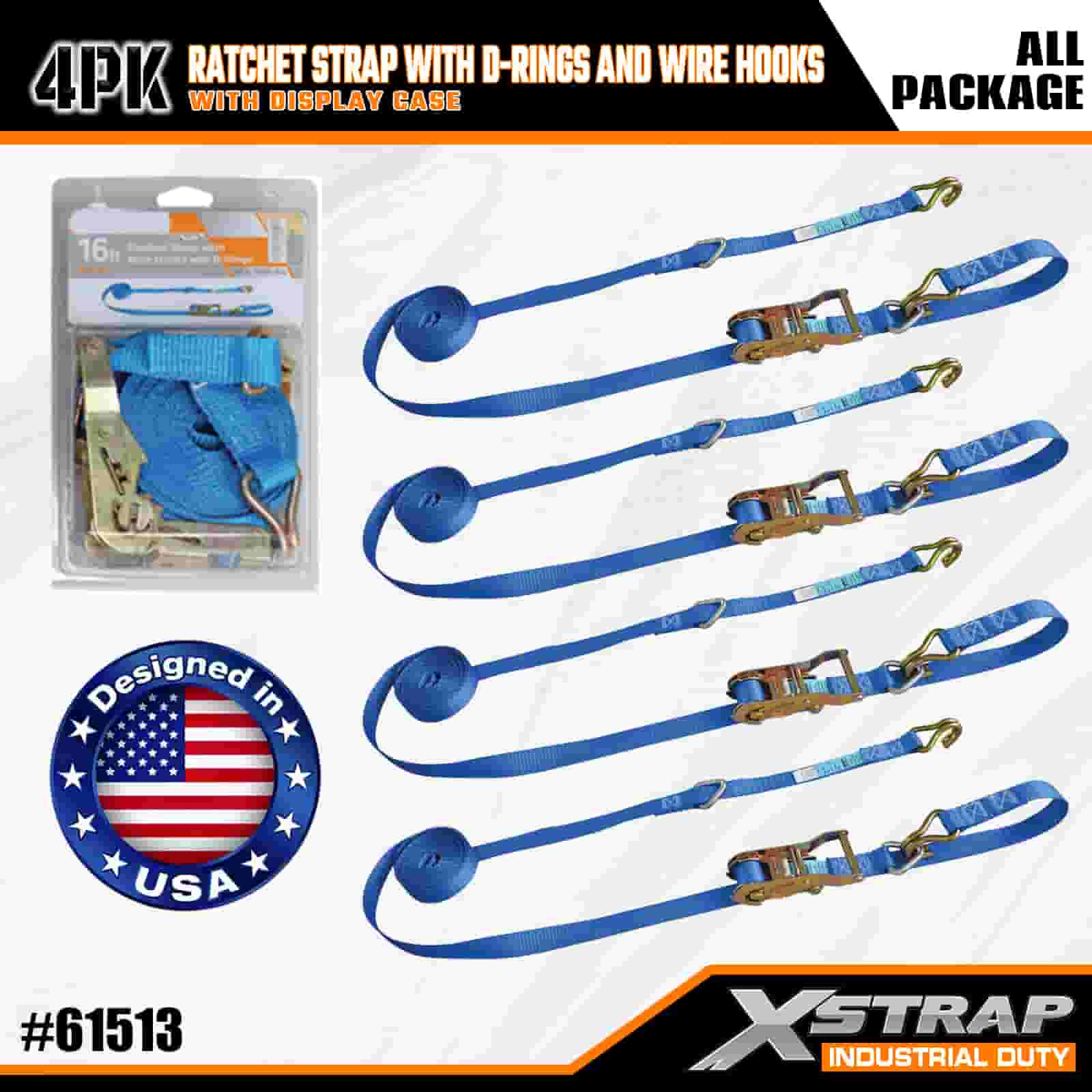- 長さ 16 フィート、整理されたパッケージ: 内蔵ストレージ コイル付きの 4 ストラップ セット (ディスプレイ パッケージ) として販売されます。各ストラップのサイズは幅 1 インチ × 長さ 16 フィートで、オートバイ、重量貨物、産業機器の固定に最適です。