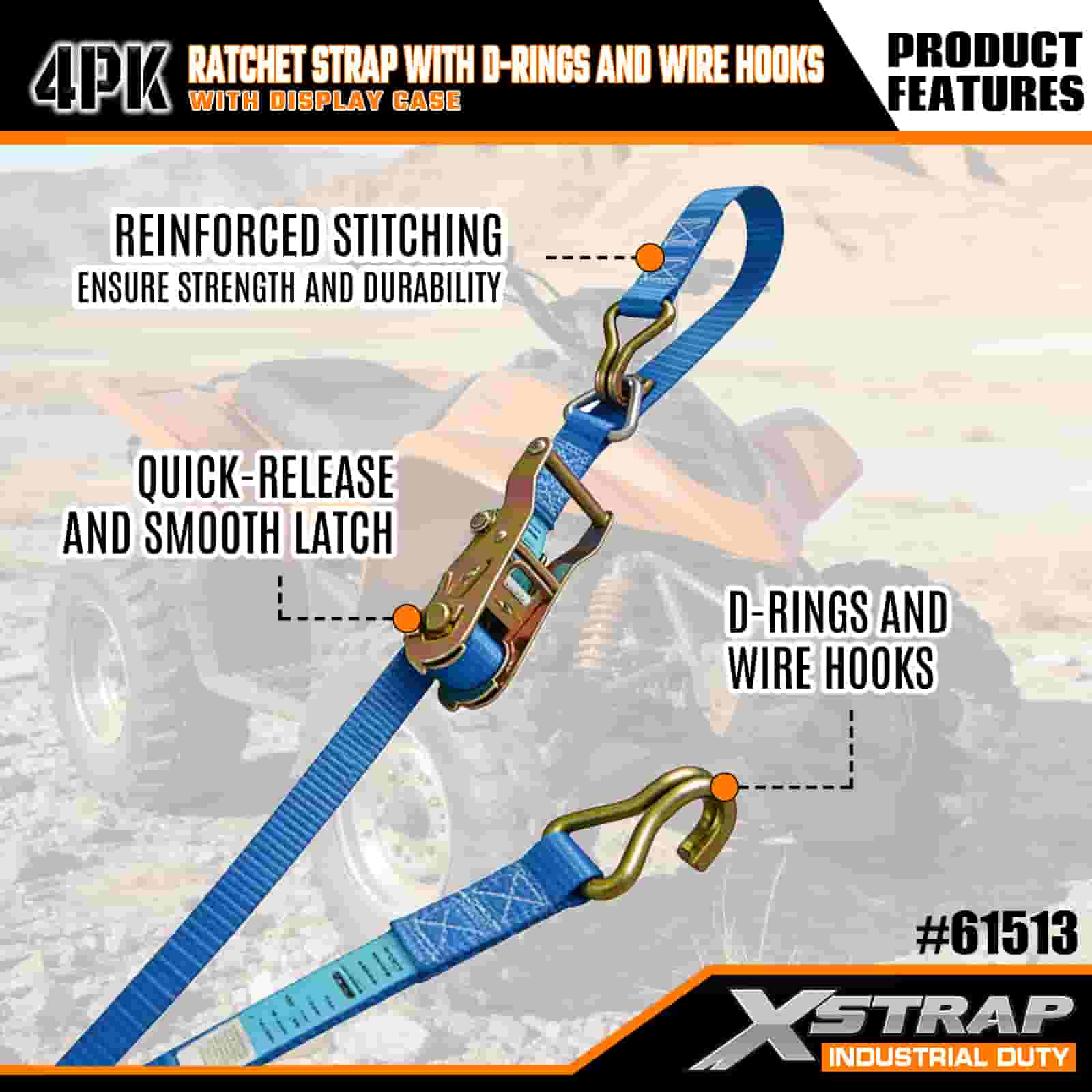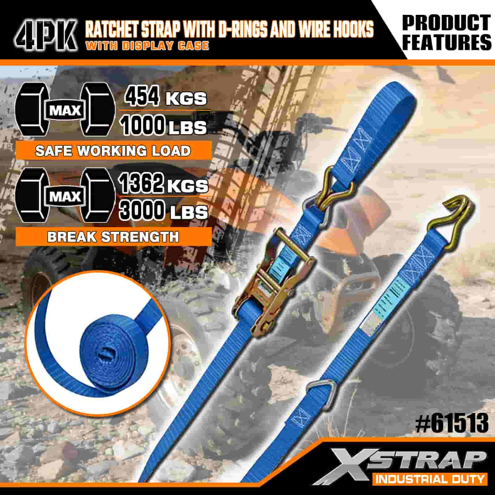 Xstrap 4パック ラチェットストラップ Dリングとワイヤーフック付き 1インチ x 16フィート ポリエステル製タイダウンストラップ プルラチェットストラップ 1000ポンド耐量カーゴラッシング固定ストラップ ワイヤーフック付き 本格的なプロフェッショナルが貨物トレーラー、フラットベッドトレーラー、スキーボート、小型車を固定します。