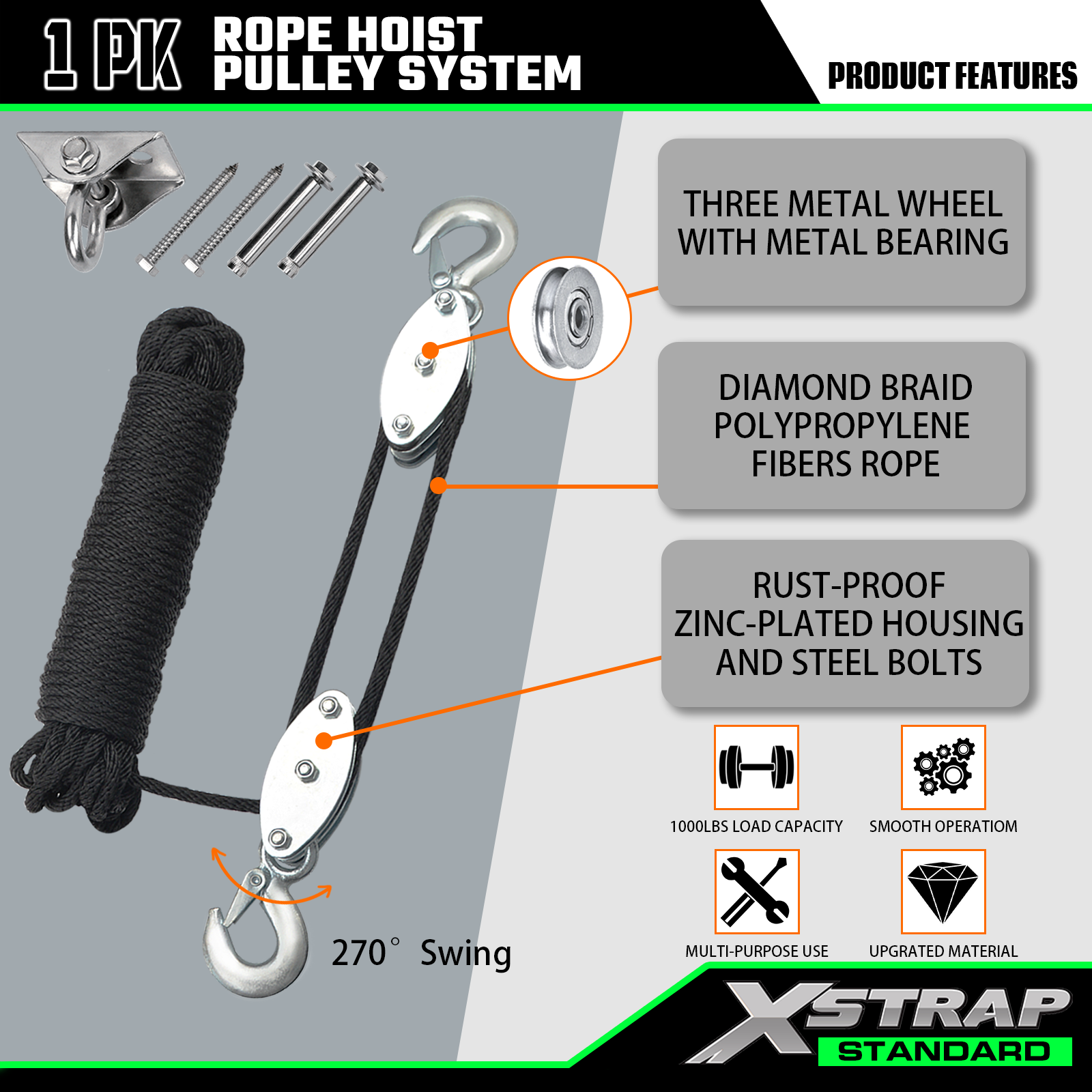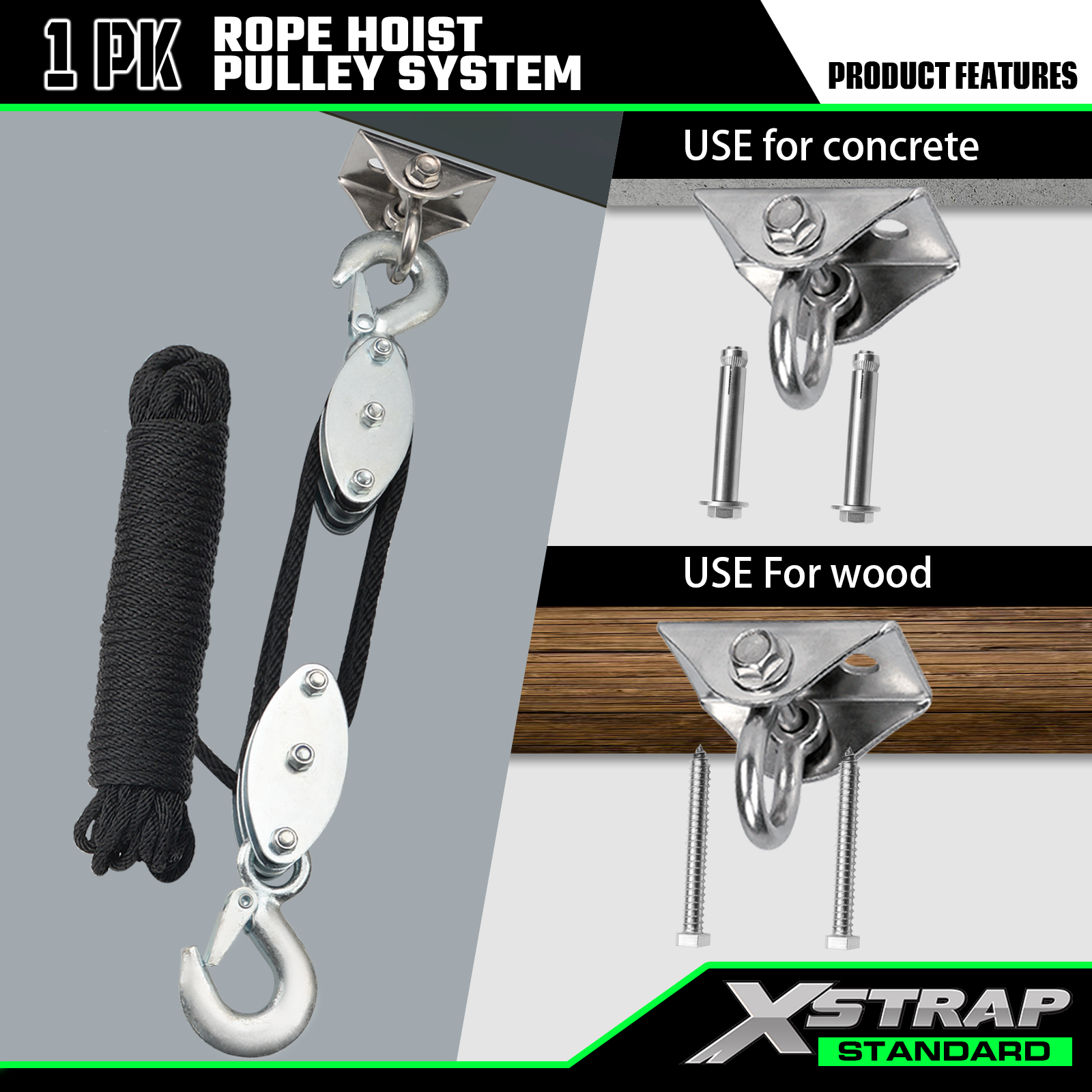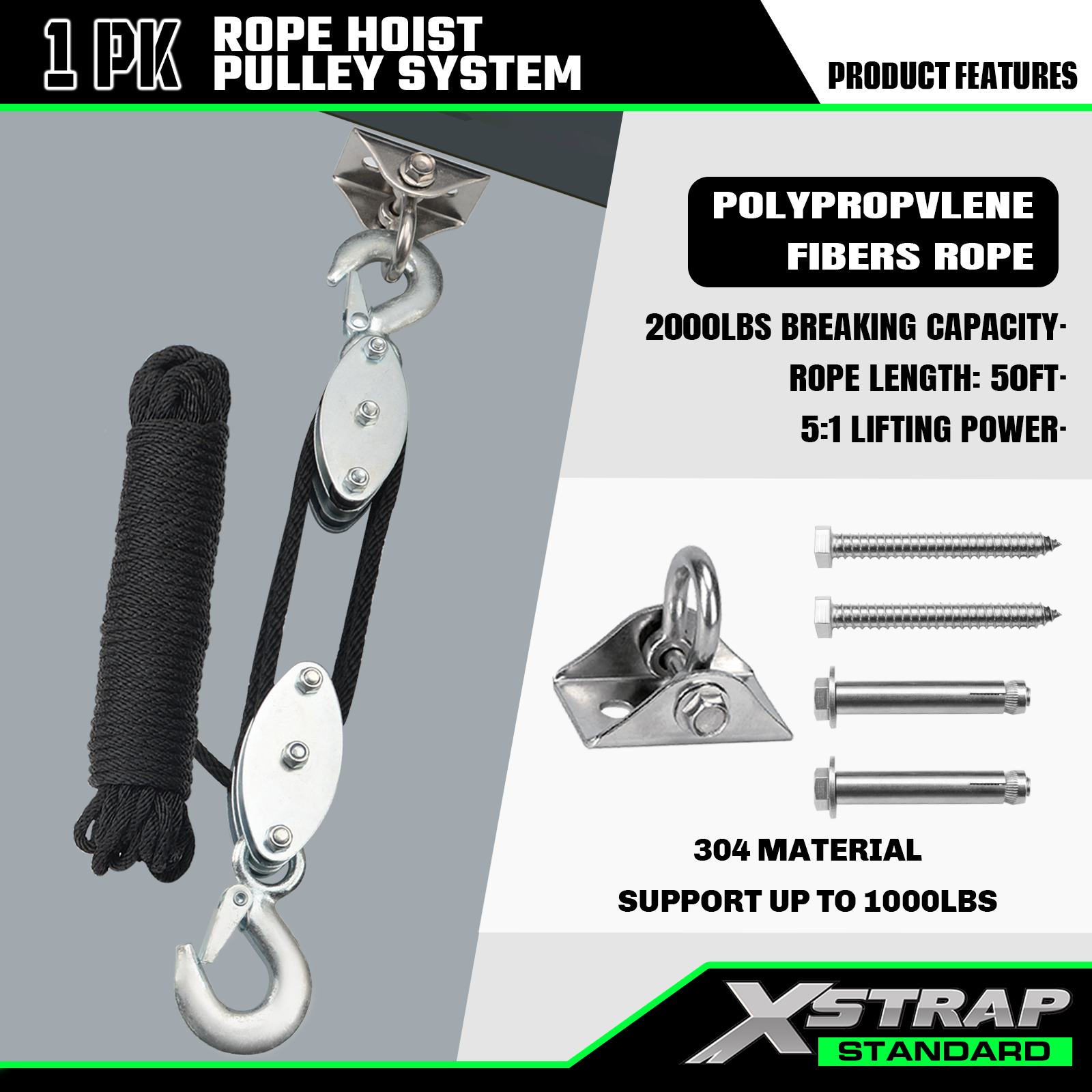 Xstrap AHLT0004 50 フィート ロープ ホイスト プーリー システム 1000LB