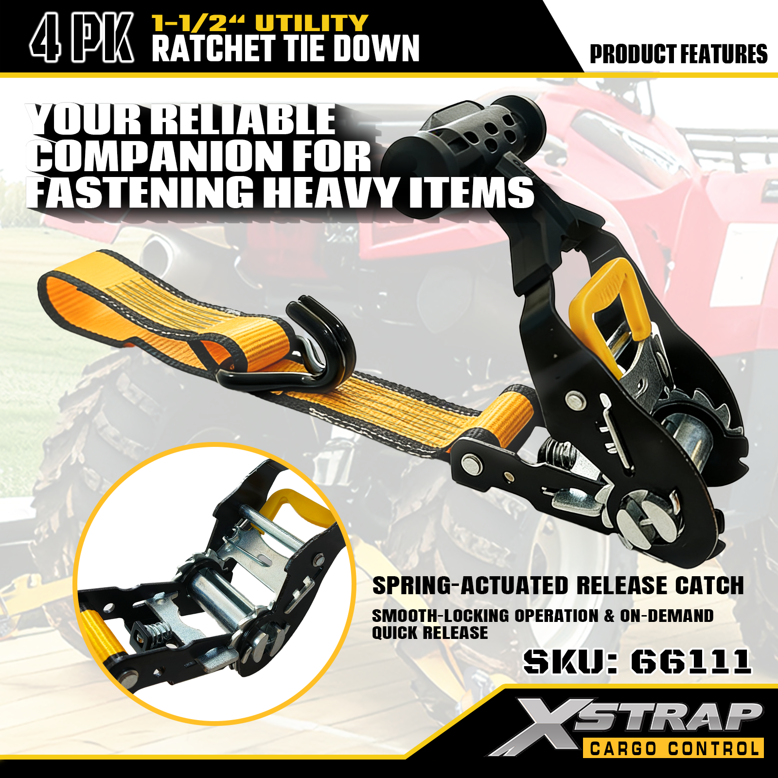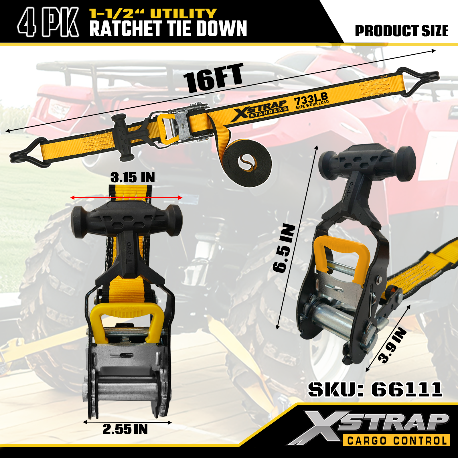 Xstrap T ハンドル ラチェット タイダウンは 1.5 インチ x 16 フィート、安全作業荷重は 1,100 ポンド、破壊強度は 3,300 ポンドです。