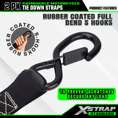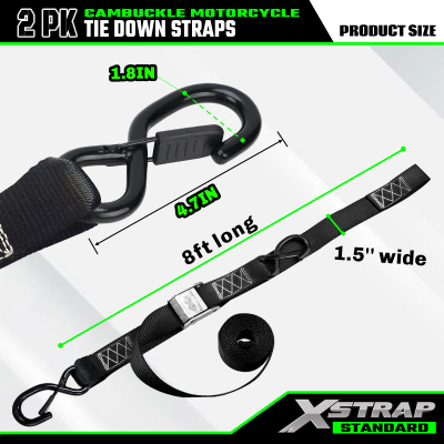 - 高耐久の標準デザイン: Xstrap オートバイタイダウンストラップは高強度ウェビングで作られており、破断強度は 2200 ポンドで、オートバイ、ATV、UTV、ダートバイクを固定するのに最適です。ちょっとした旅行にカム バックル ストラップを使用する場合、Xstrap タイダウン ストラップは比類のない耐久性と安全性を保証します。