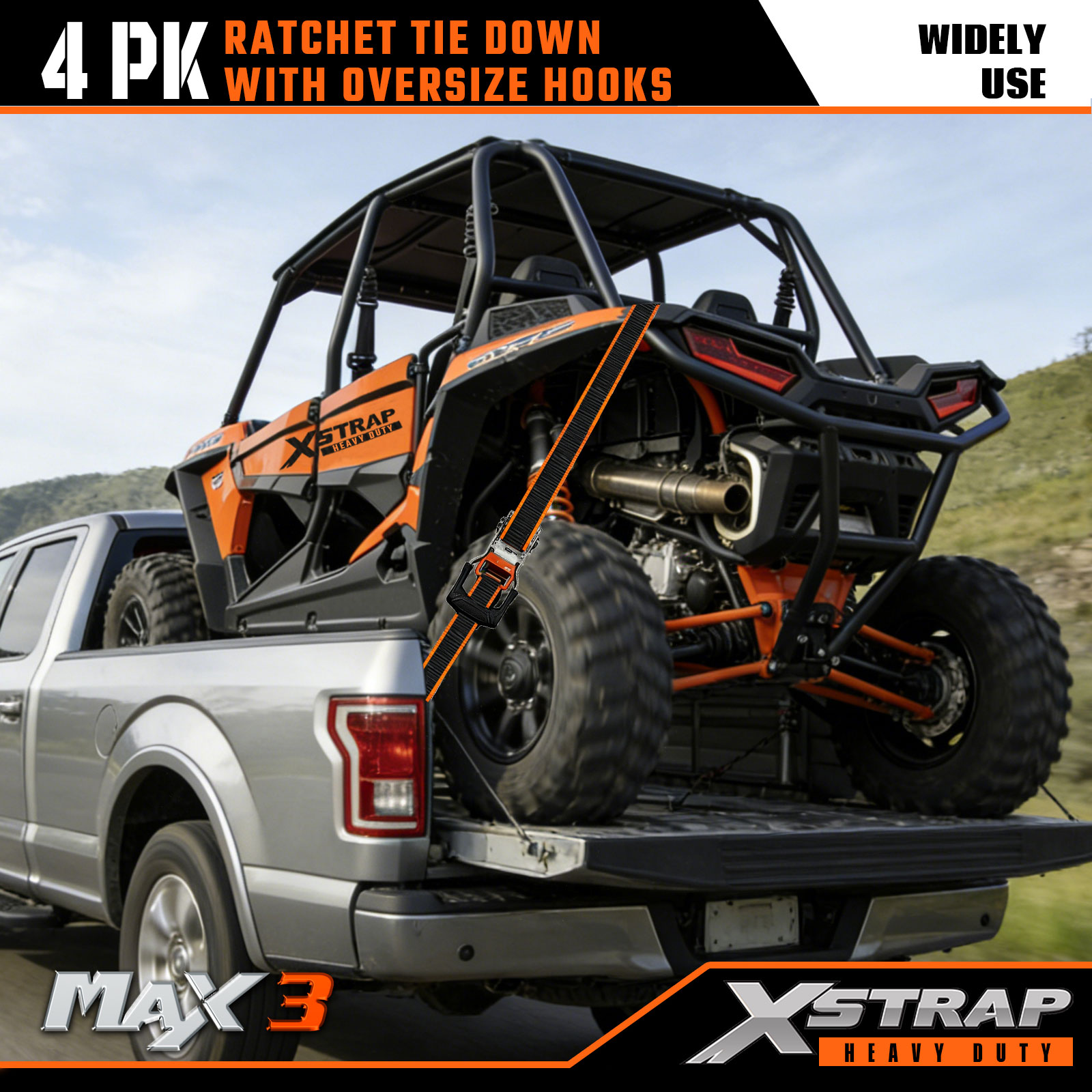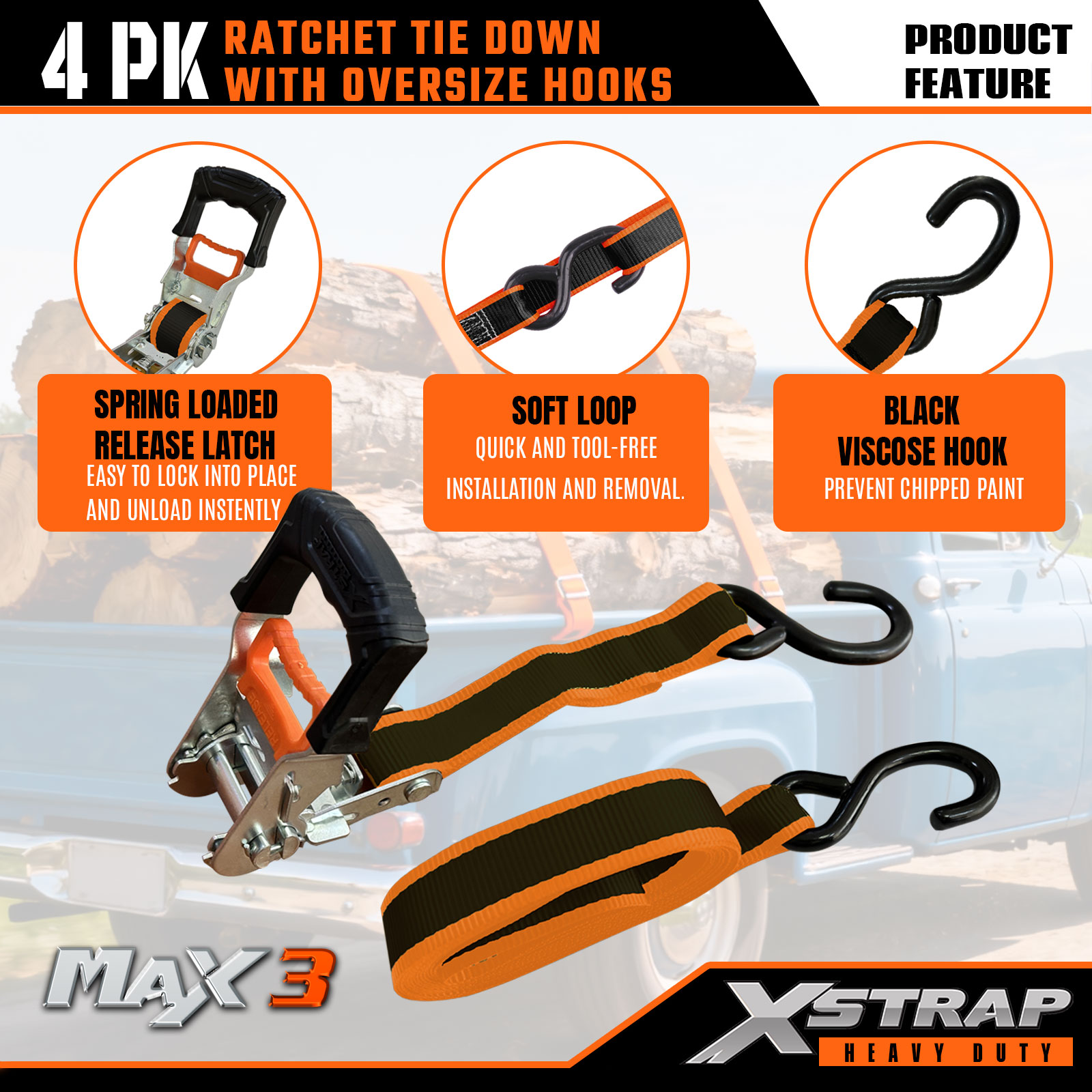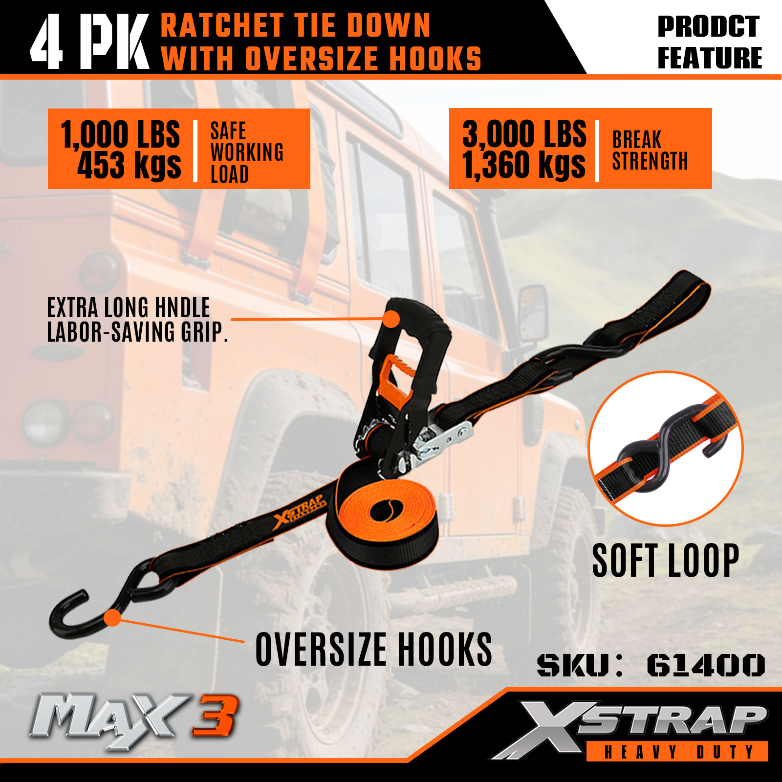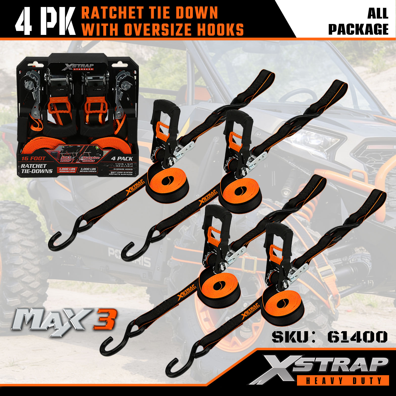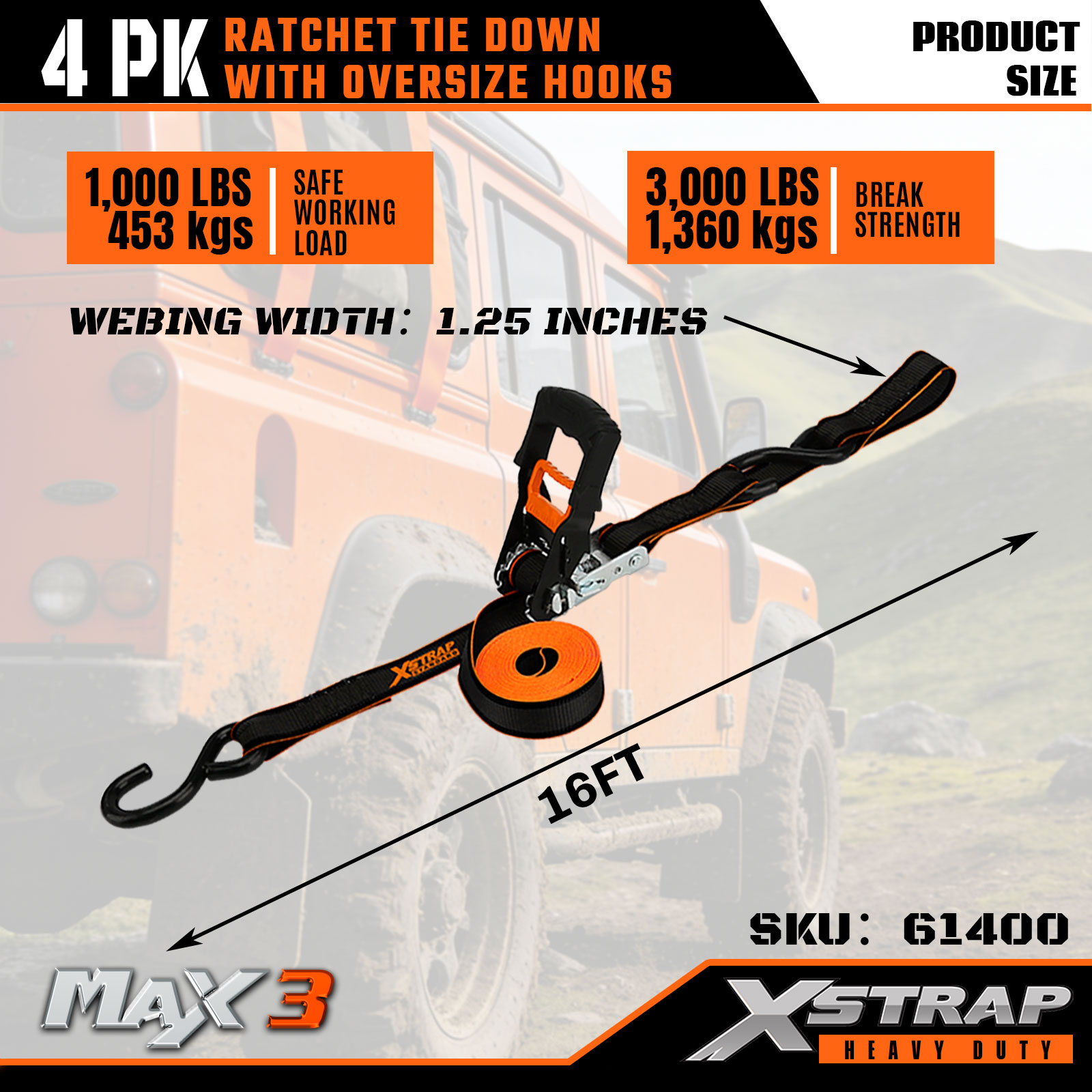 Xstrap 4パック ラチェット タイダウン、1-1/4インチ x 16フィート ポリエステル タイダウン ストラップ プル ラチェット ストラップ、容量1000ポンド、ダブルJフック付きカーゴラッシング固定ストラップ、ピックアップトラック、SUV、カートップラックオートバイ、軽漁船、ジェットスキー、スノーモービル、芝生トラクター用。