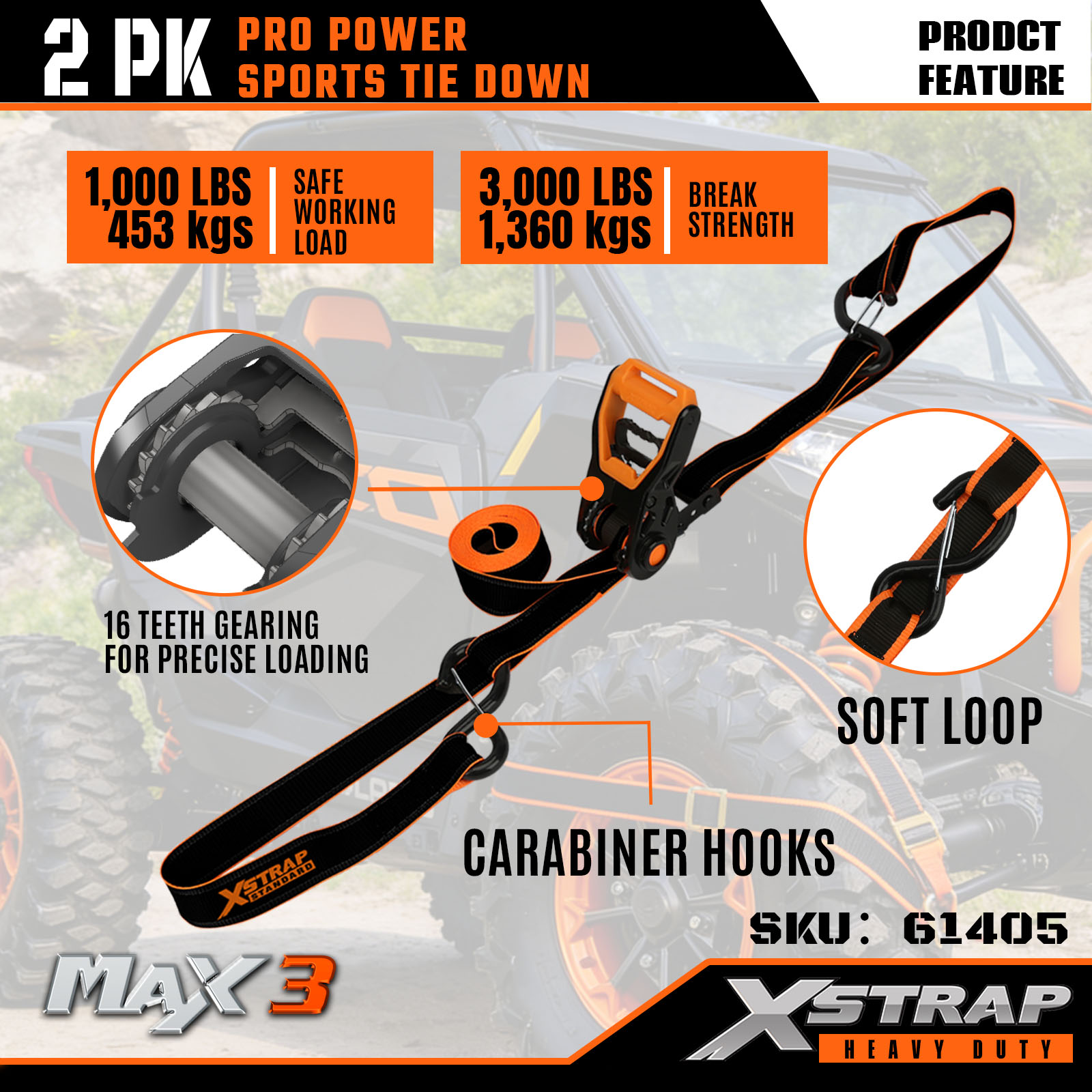 Xstrap プロパワースポーツタイダウンストラップ 2 個パック、1-1/4 インチ x 14 フィートのポリエステルタイダウンストラッププルラチェットストラップ、耐荷重 1000 ポンドのカーゴラッシング固定ストラップ、カラビナフック付き、トラック、SUV、車のトップラックオートバイ用。