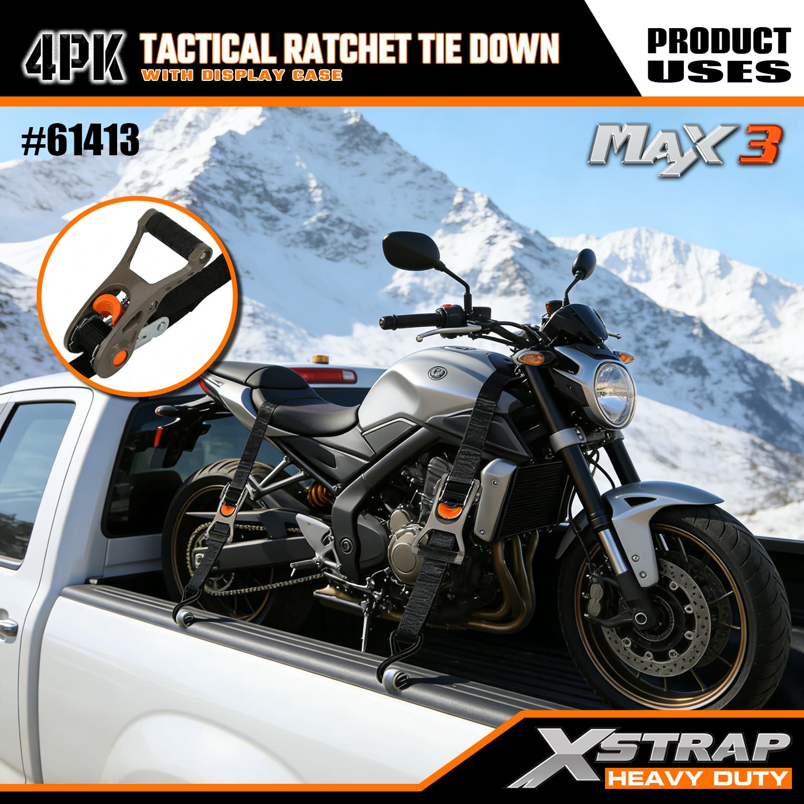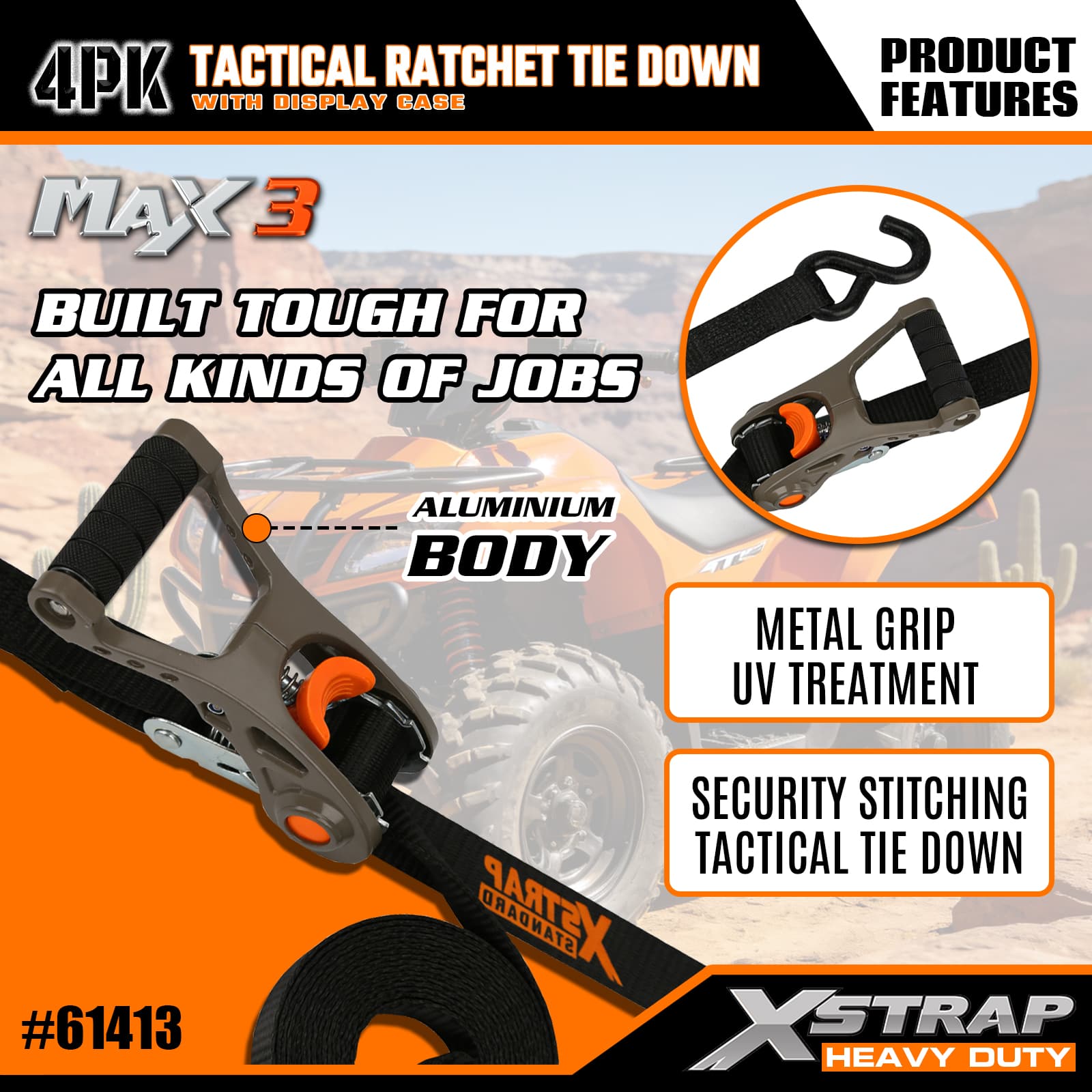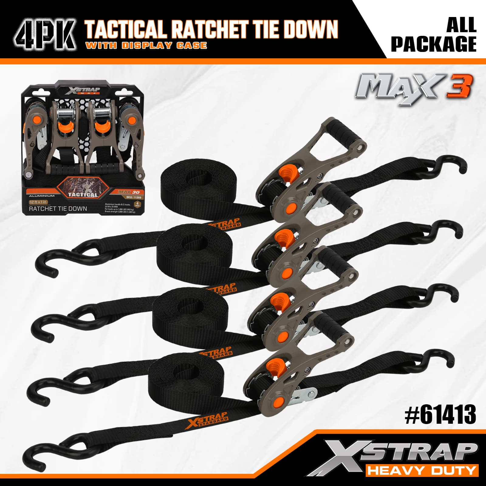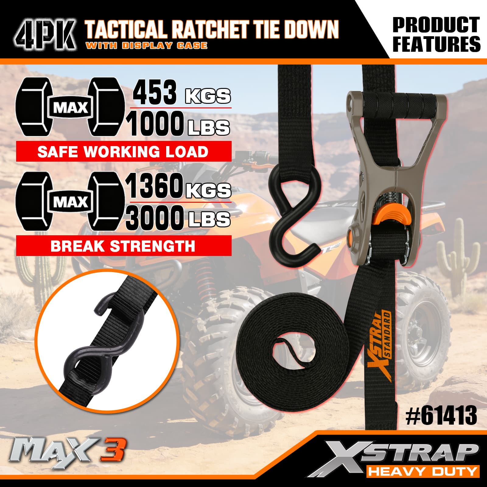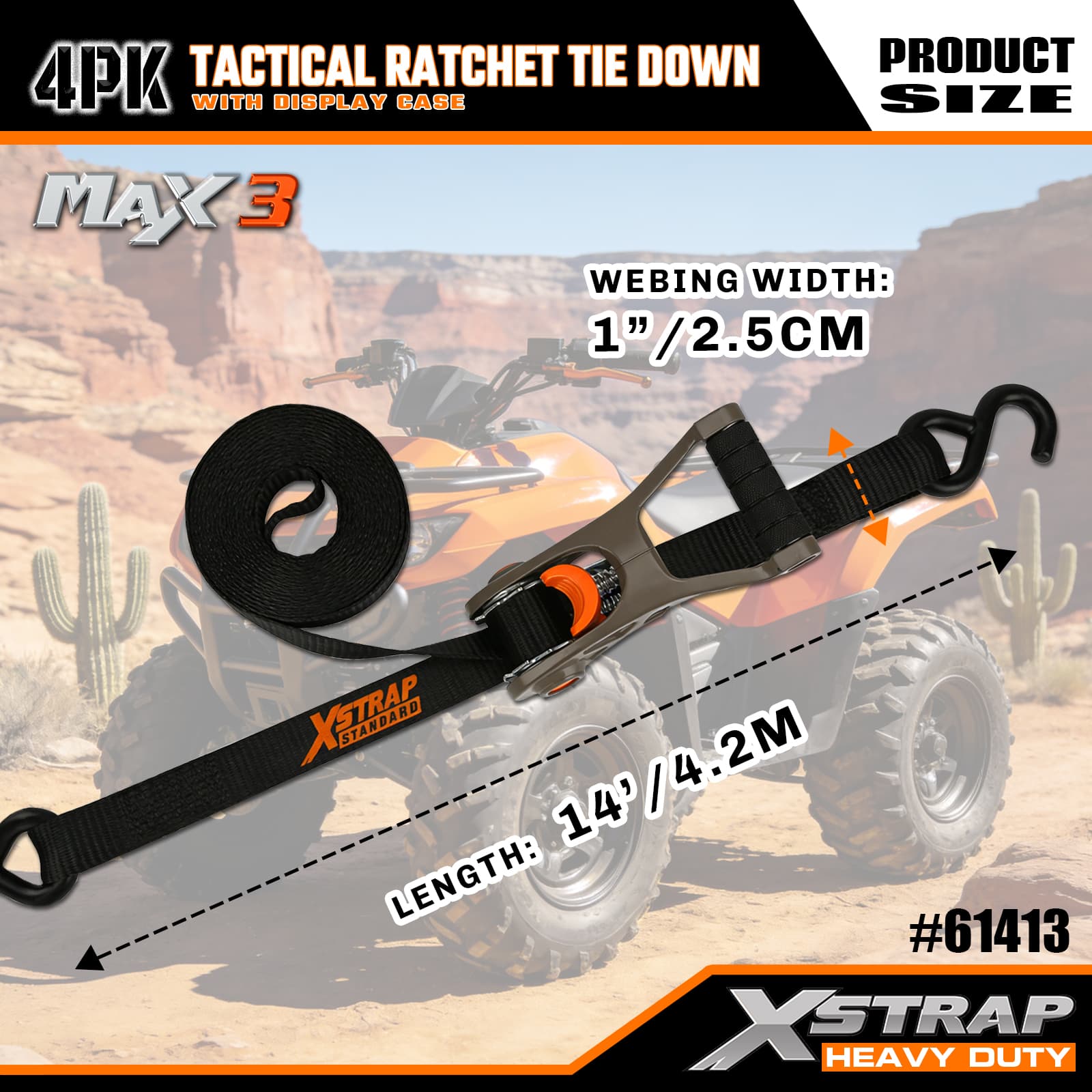 Xstrap 4パック タクティカルラチェットタイダウン ソフトループ付き、1インチ x 14フィート ポリエステルタイダウンストラップ プルラチェットストラップ、Sフック付き耐荷重1000ポンドのカーゴラッシング固定ストラップ、トラック、SUV、車のトップラックオートバイ用。