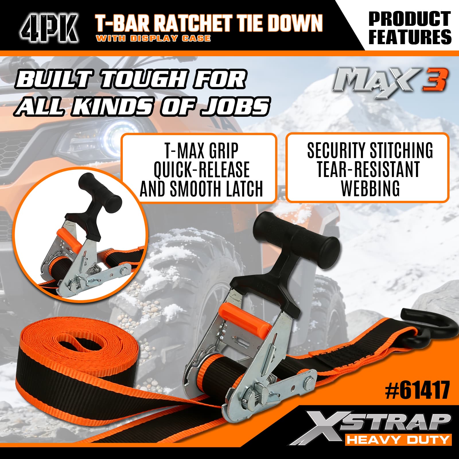 Xstrap T-Max グリップ ラチェット タイダウン 4 個パック、1-1/4 インチ x 14 フィート ポリエステル タイダウン ストラップ プル ラチェット ストラップ、S フック付き耐荷重 1000 ポンドのカーゴ ラッシング固定ストラップ、ピックアップ トラック、SUV、カー トップ ラック オートバイ、軽漁船、ジェット スキー、スノーモービル、芝生トラクター用。