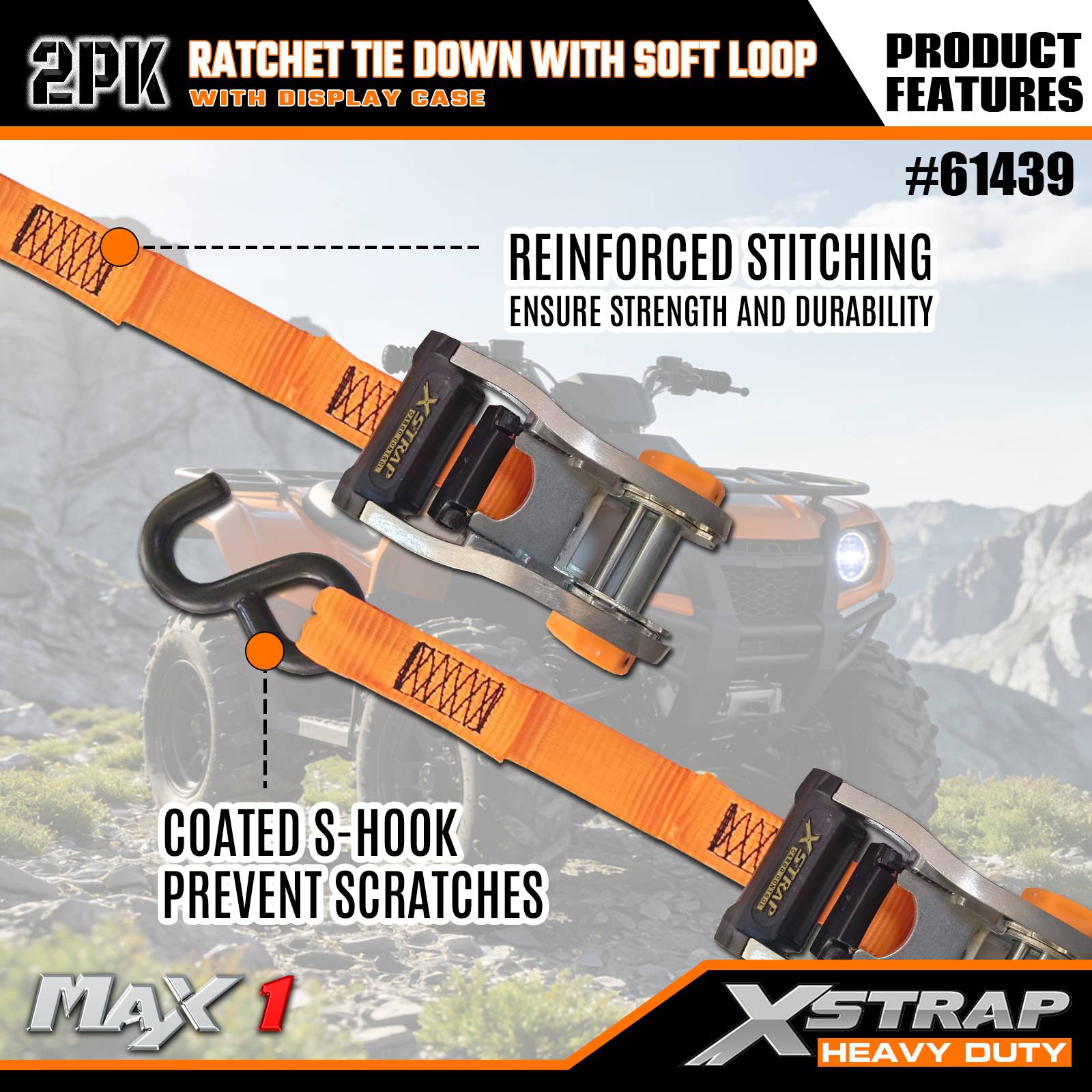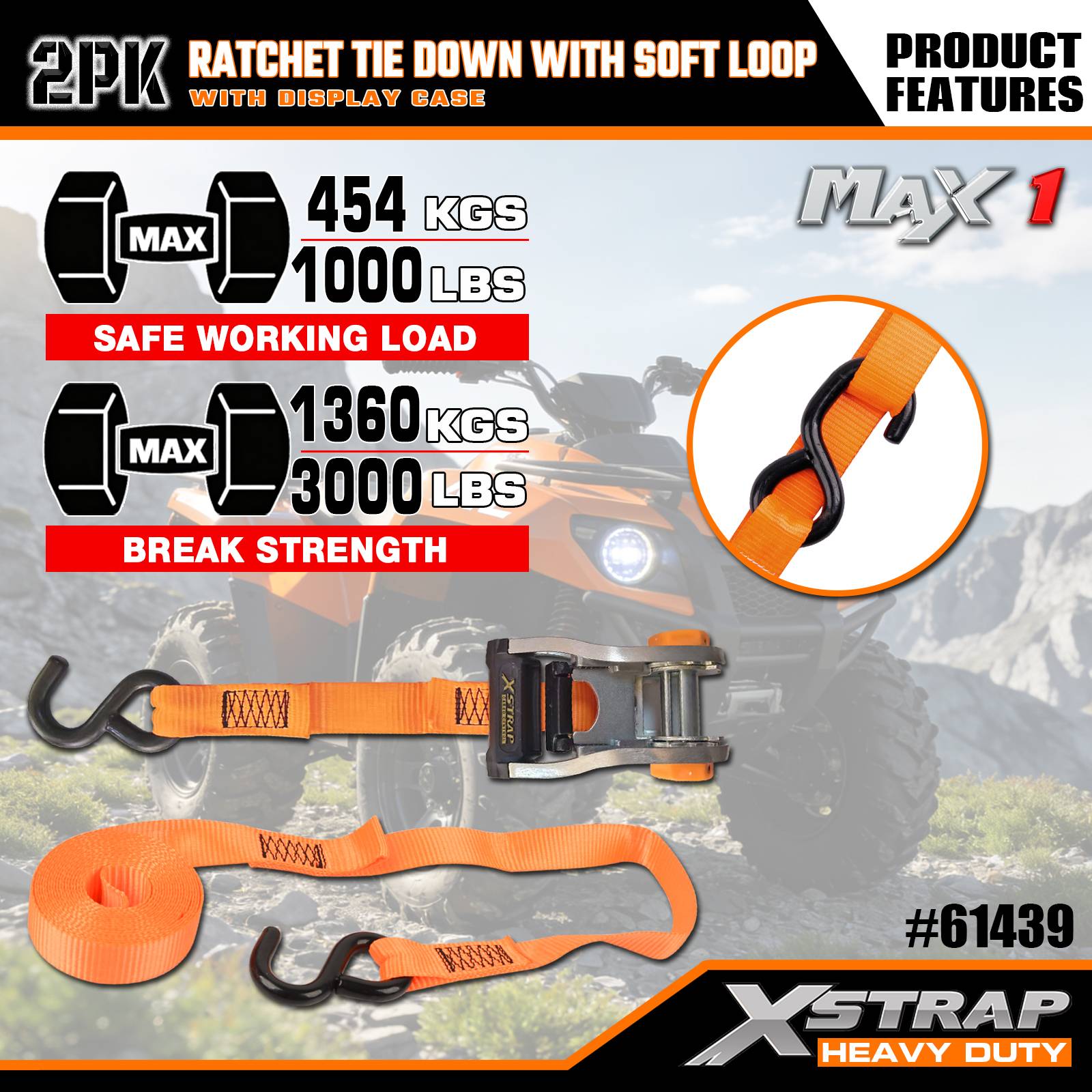 Xstrap 2パック ラチェットタイダウン ソフトループ付き、1-1/16インチ x 10フィート ポリエステルタイダウンストラップ プルラチェットストラップ、Sフック付き耐荷重1000ポンドのカーゴラッシング固定ストラップ、トラック、SUV、車のトップラックオートバイ用。